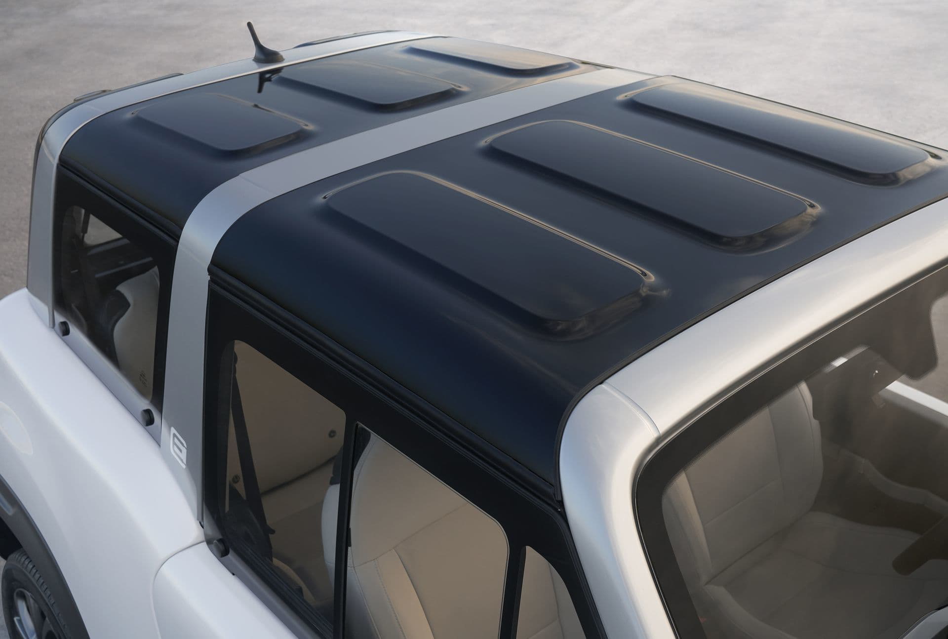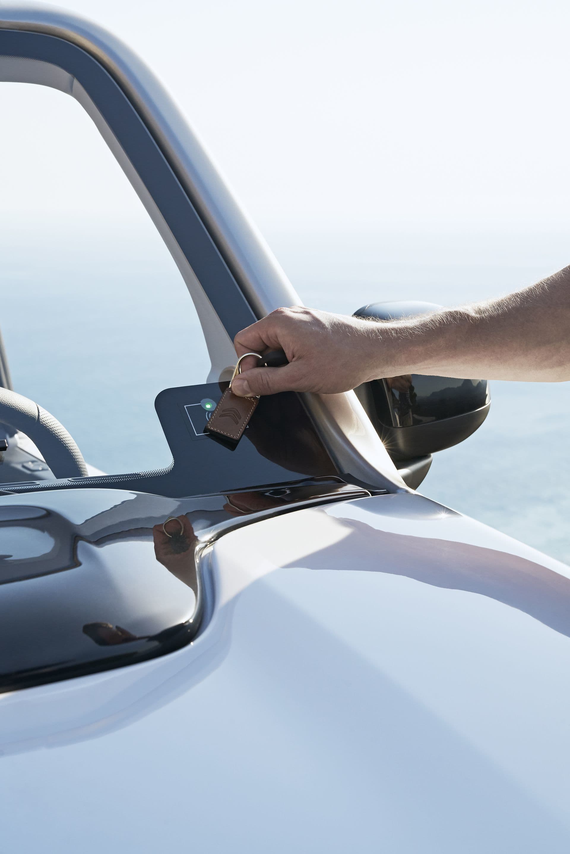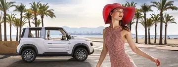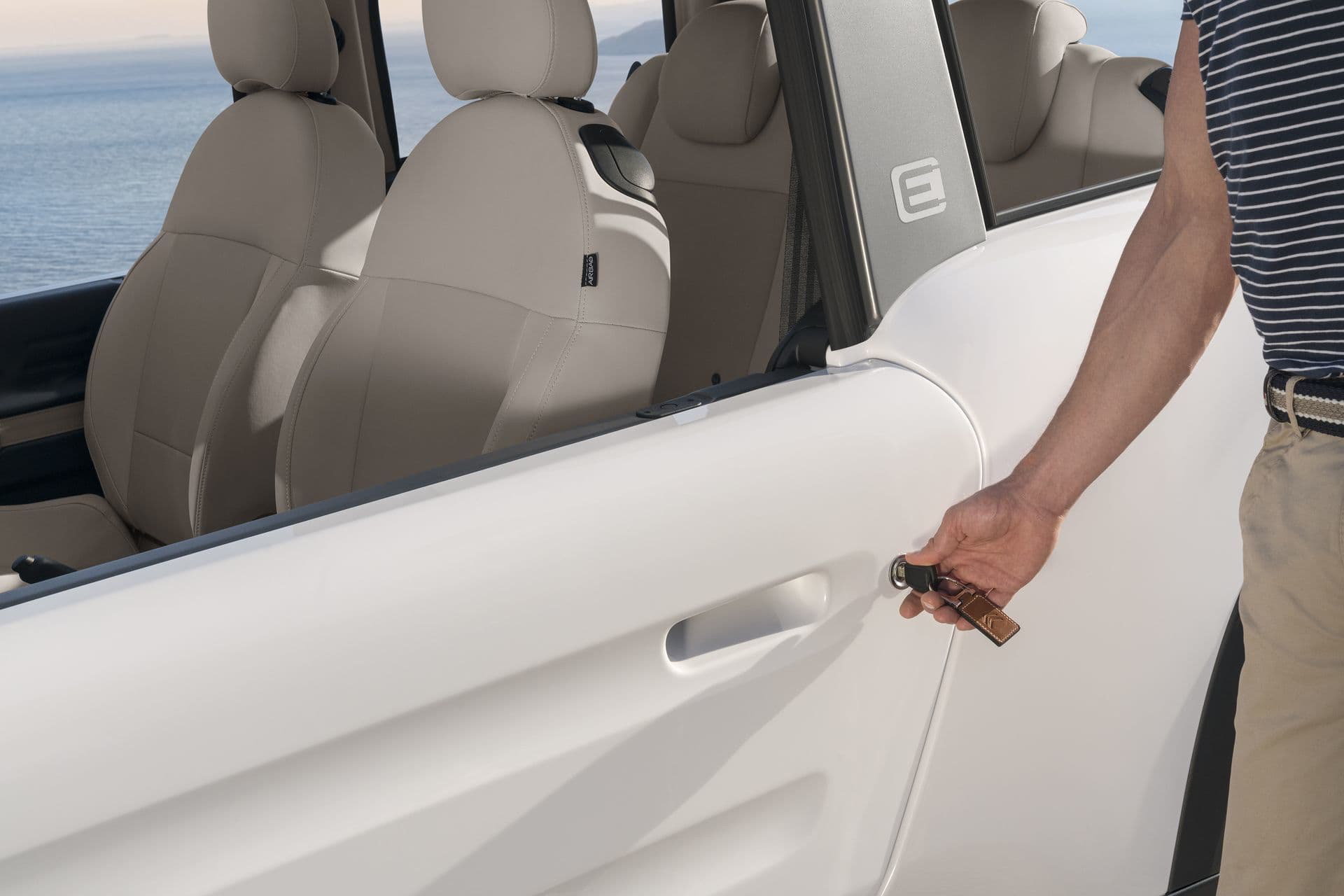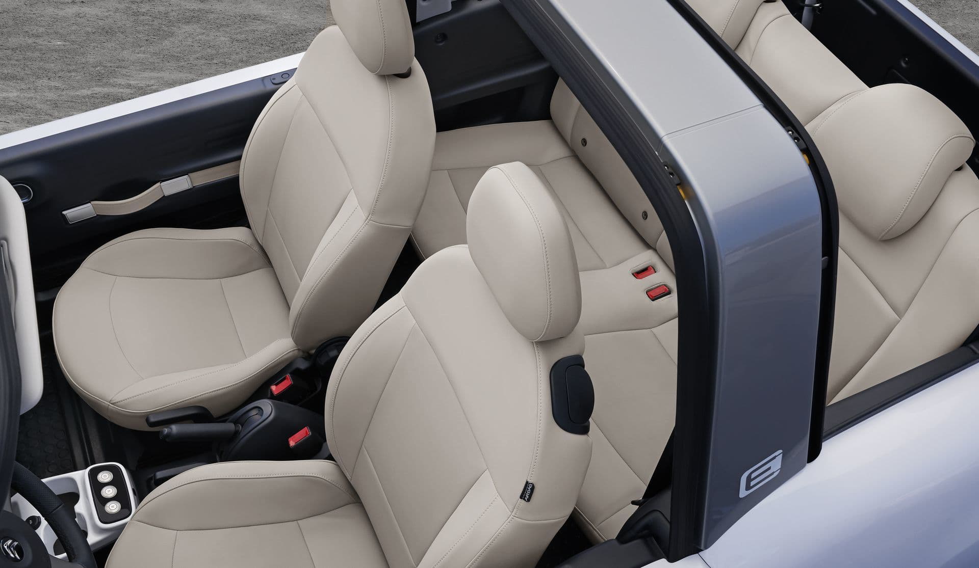 A este nuevo salpicadero se le suma un nuevo sistema de acceso para las plazas traseras, en las que el reglaje del asiento delantero queda memorizado al abatirlo. Los asientos pueden tapizarse en cuero, así como en la tela resistente al agua que ya conocemos. Citroën ha querido dotar al E-Mehari de un carácter mucho más versátil, de manera que sus propietarios puedan usarlos durante todo el año sin preocupaciones. Para ello, ha sido imprescindible equiparlo con un hard top practicable de color oscuro. El cierre centralizado lo bloquea en posición: nadie podrá acceder al interior del coche cuando esté aparcado.
