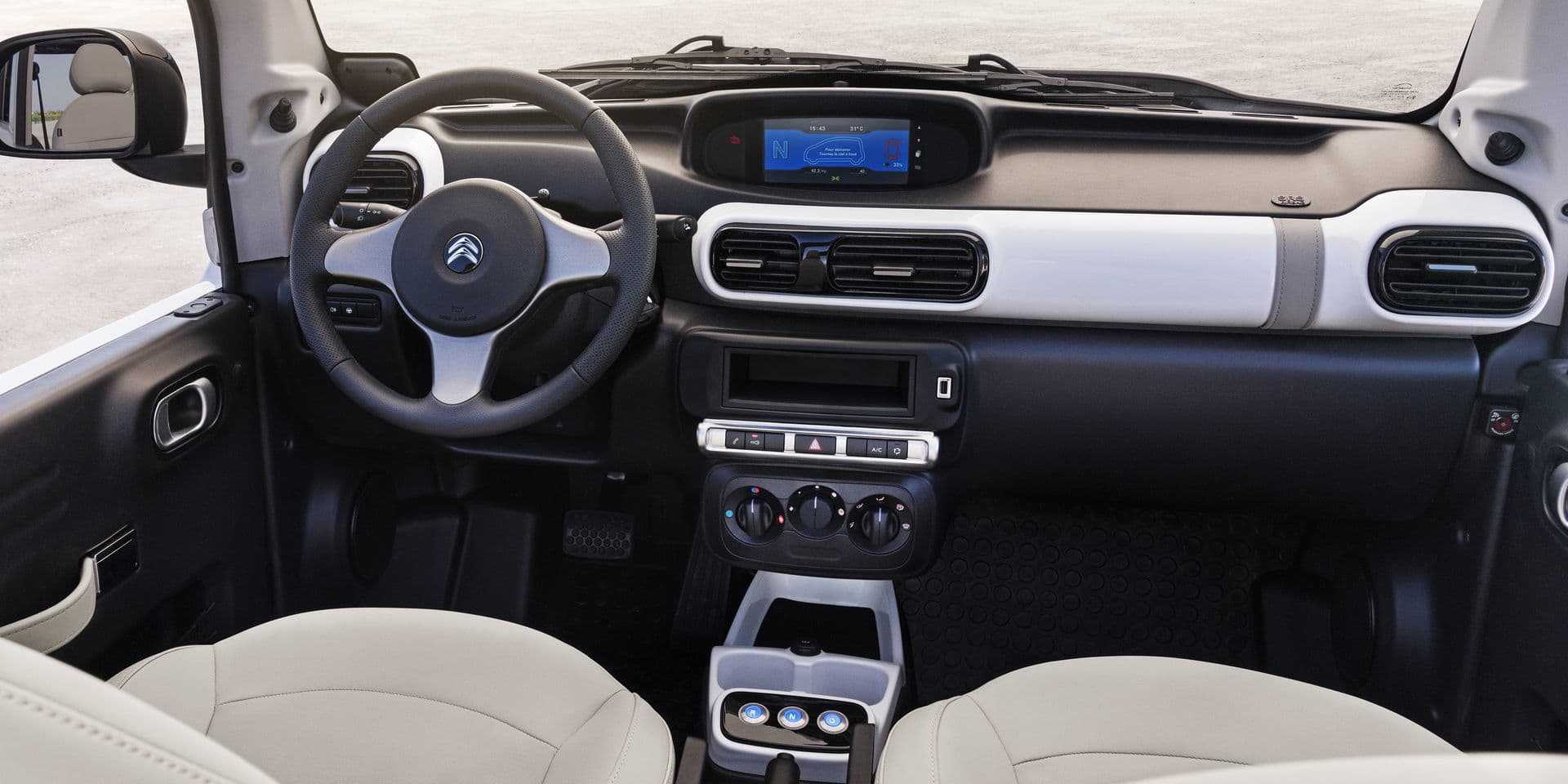 El habitáculo del Citroën E-Mehari era posiblemente su punto más oscuro. Una masa de plásticos duros en la que siquiera se podía ver rastro alguno de la imagen de la marca francesa. Por fortuna, Citroën ha rediseñado el interior del E-Mehari al completo, acercándolo a lo que podemos encontrar en un Citroën C3 o un Citroën C4 Cactus. El salpicadero sigue estando presidido por la misma instrumentación digital, pero su diseño es ahora mucho más refinado y moderno – fijaos en las salidas de aireación, sin ir más lejos. Incluso puede encargarse parcialmente recubierto en cuero.