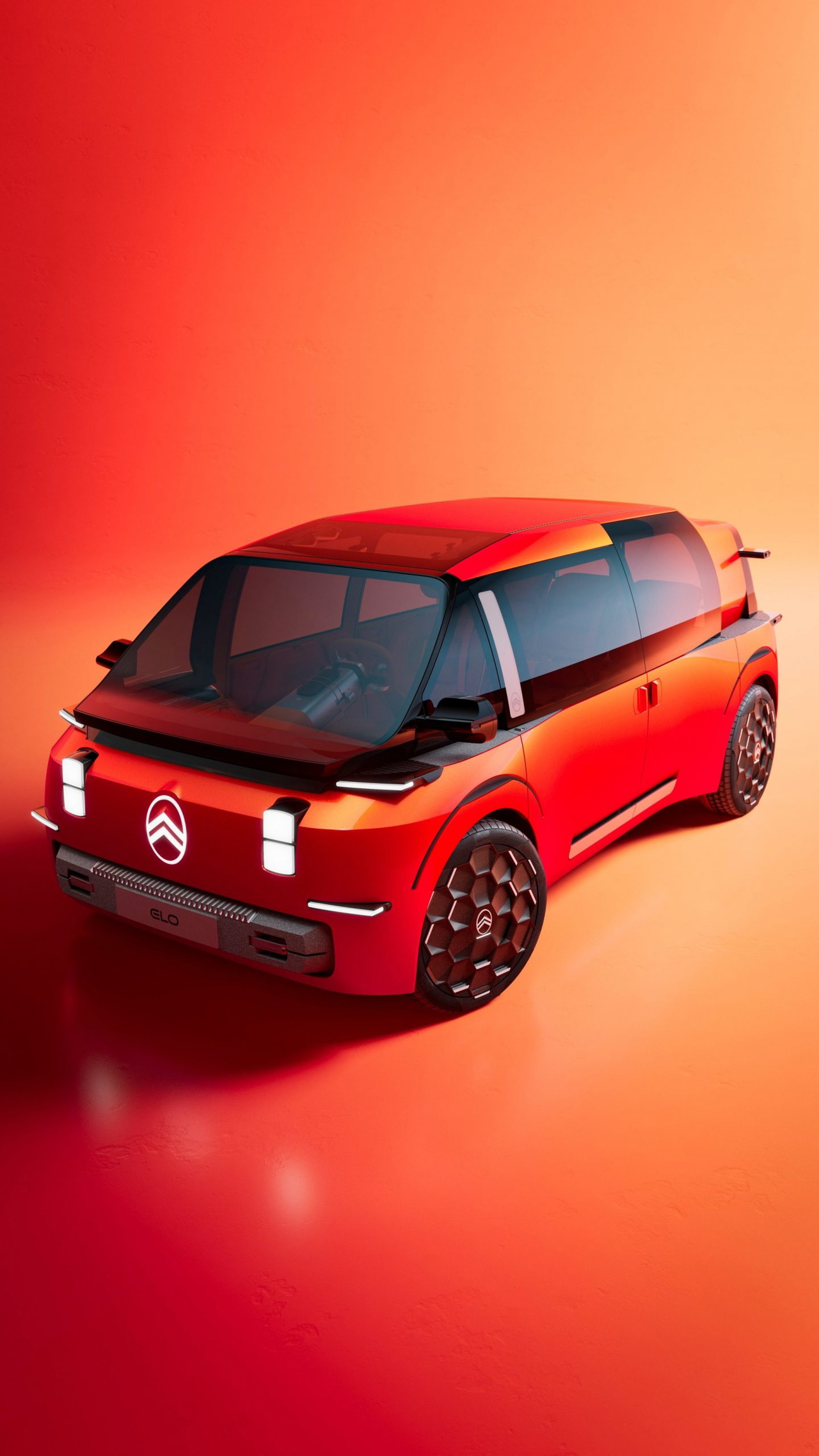 A partir del exterior, el ELO se presenta como un monovolumen compacto de líneas fluidas, pensado para maximizar el espacio útil sin perder ese toque desenfadado tan propio de Citroën. La carrocería, acabada en un tono naranja que varía en función de la luz, cuenta con grandes superficies acristaladas —hasta 4,5 m²— que aportan luminosidad y recuerdan en cierto modo a las soluciones de los primeros vehículos recreativos de la marca. Los cristales son planos o ligeramente curvados, una decisión heredada del concept OLI que permite abaratar fabricación y reducir peso, reforzando a la vez el carácter práctico del modelo.