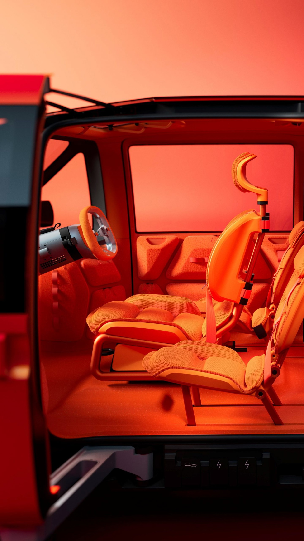 Las seis plazas se logran mediante dos asientos plegados en la segunda fila y tres asientos traseros completamente extraíbles que pueden convertirse en sillones de exterior. Es una solución que recuerda a los mejores tiempos de los monovolúmenes europeos, pero actualizada desde la lógica eléctrica y con materiales resistentes y fáciles de limpiar. El suelo totalmente plano permite crear desde una zona de descanso —con dos camas plegables integradas— hasta un pequeño salón multimedia o una oficina móvil con bandeja de trabajo vinculada al asiento central.