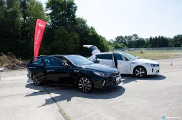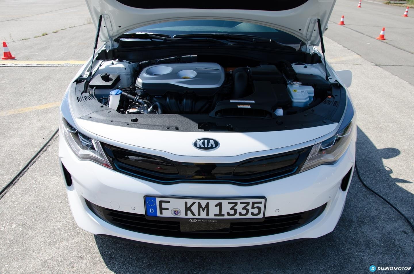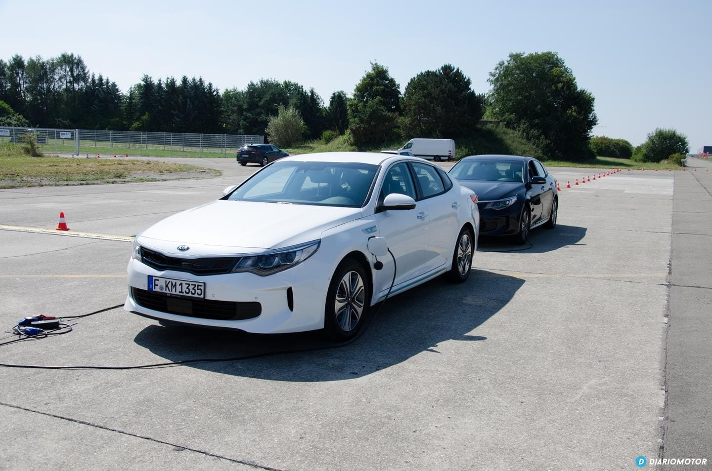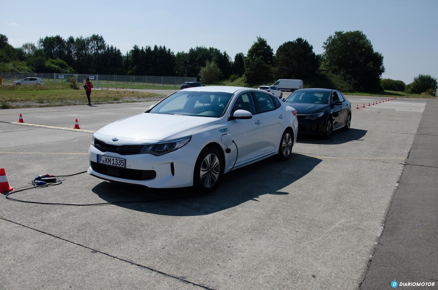 En este mismo circuito pudimos probar brevemente el Kia Optima PHEV para realizar un ensayo de conducción eficiente que nos sirvió para conocer cuándo y cuánto trabaja el motor eléctrico. El sistema híbrido enchufable desarrollado por Kia consta de un motor eléctrico de 50 kW de potencia máxima, un motor 2.0 gasolina atmosférico de 156 CV y unas baterías de polímero de litio con 9,8 kWh de capacida. El trabajo del sistema híbrido y sus diferentes modalidades recae en un cambio automático de doble embrague con seis relaciones. El resultado de este sistema es híbrido es una berlina que puede recorrer hasta 54 kilómetros en modo eléctrico y homologar un consumo de 1,6 l/100 Km según ciclo NEDC.