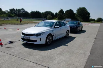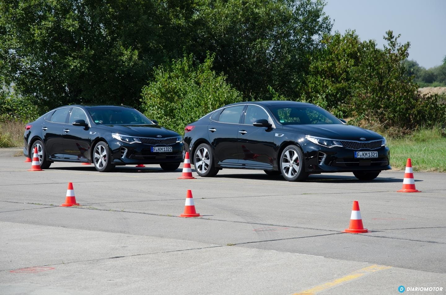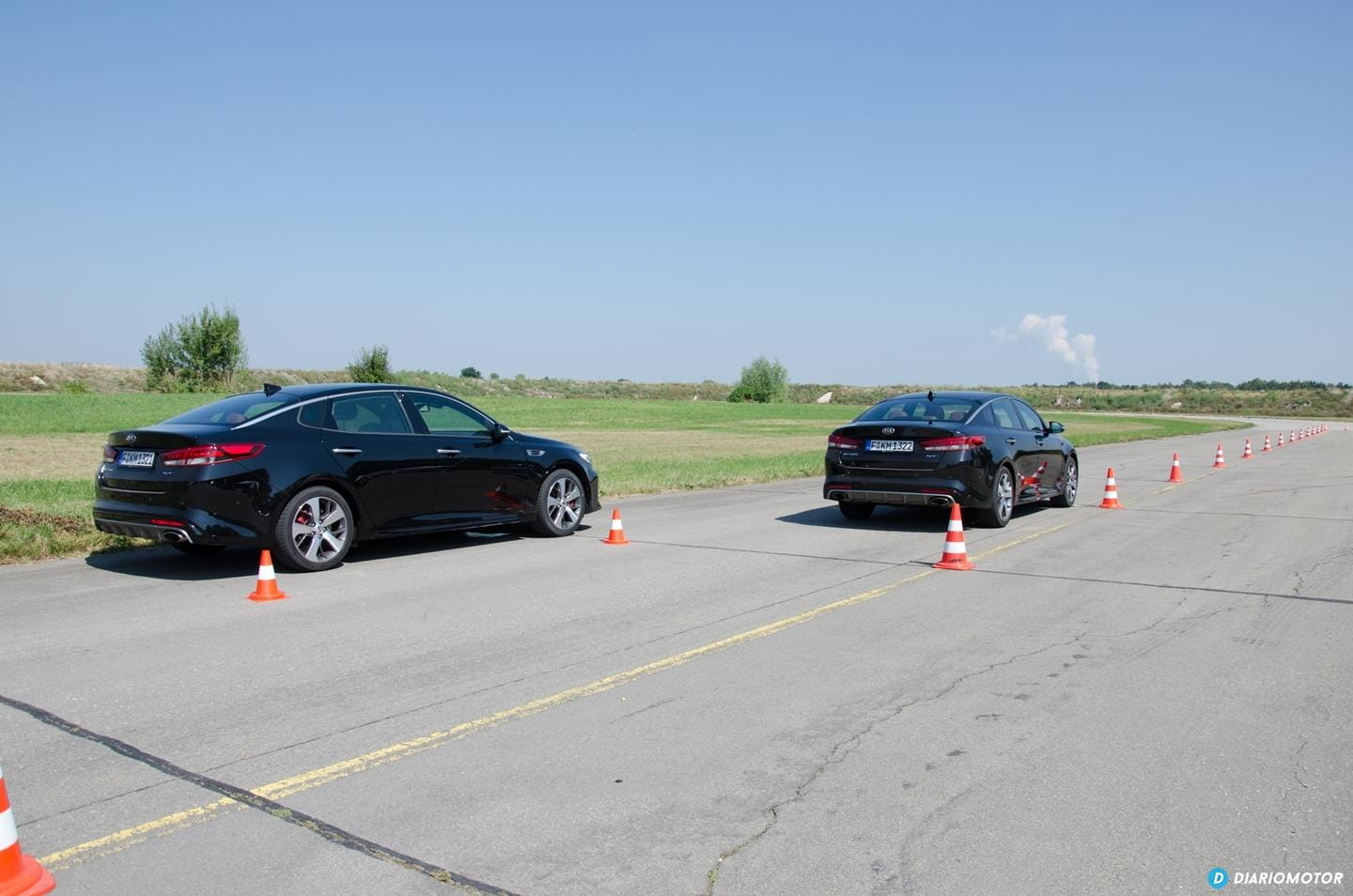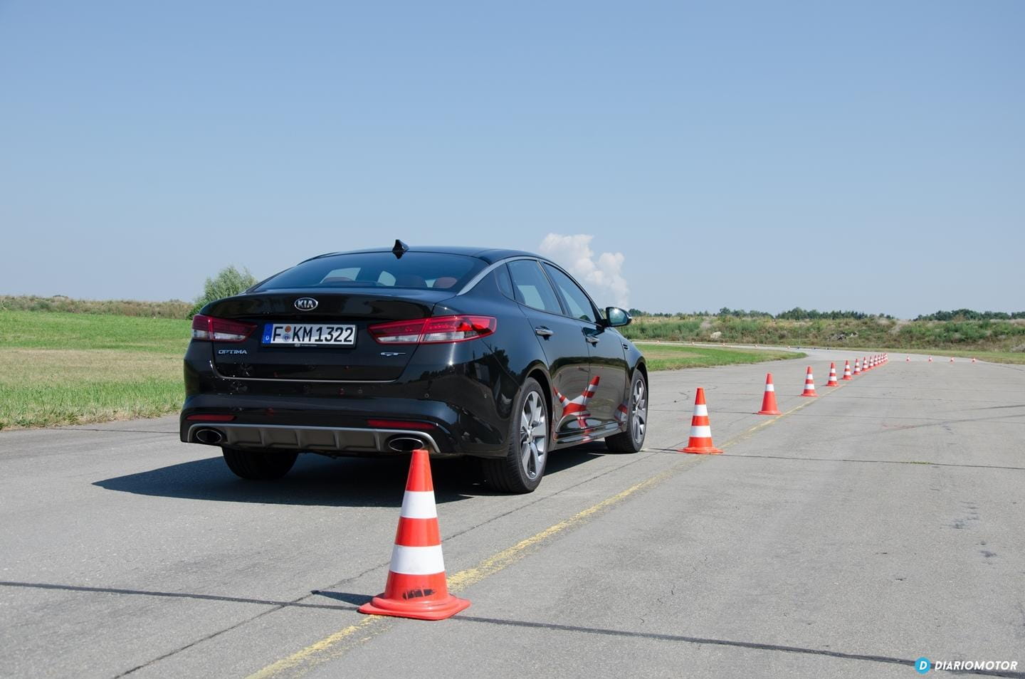 Tras realizar un largo recorrido por Autobahn, llegamos a un circuito de pruebas donde pudimos seguir comprobando en diferentes pruebas el comportamiento de la suspensión activa instalada en las versiones GT. Hablamos de pruebas con repetidos giros, cambios de dirección muy pronunciados y una velocidad media alta. En todo caso el Optima GT mostró un alto grado de estabilidad y una dirección bien calibrada, si bien pecaba de un tacto algo artificial si la comparamos con la puesta a punto del resto del conjunto.
