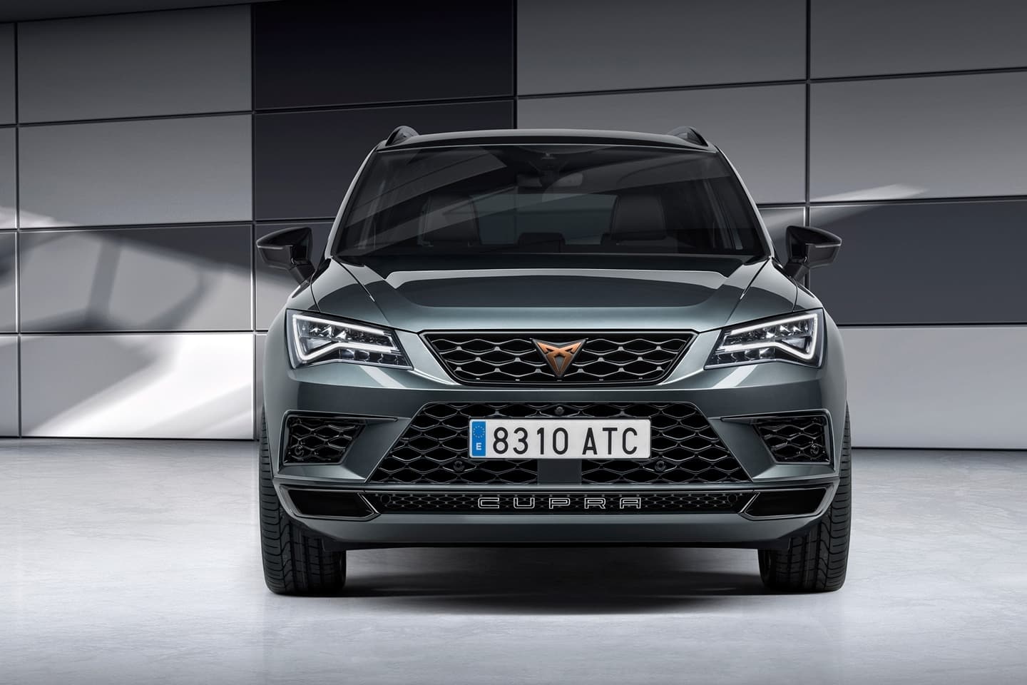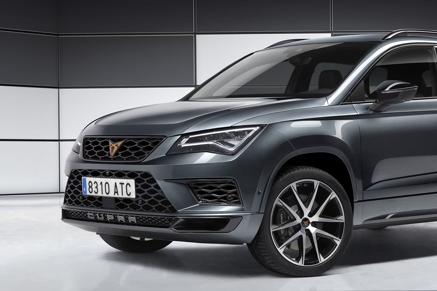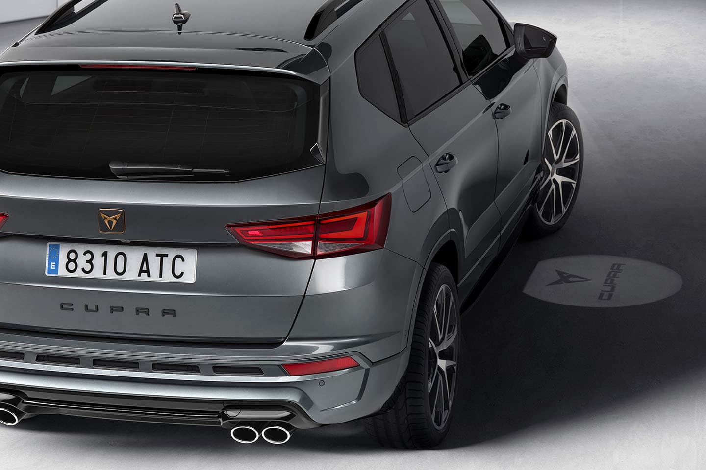El color cobre es absoluto protagonista en los detalles del Cupra Ateca, algo que era de esperar ya que desde que fuese anunciada la independencia de Cupra se apostó por este color como símbolo más evidente. También los nuevos logotipos de Cupra hacen acto de presencia en la parrilla frontal, en las llantas de 19″, en el portón del maletero, en volante o en la proyección LED que generan los retrovisores. El kit de carrocería es específico, encontrando una trama para parrilla y entradas de aire exclusiva de Cupra y, por supuesto, la denominación «CUPRA» en la entrada de aire inferior al más puro estilo Audi Sport en sus modelos RS.