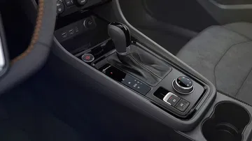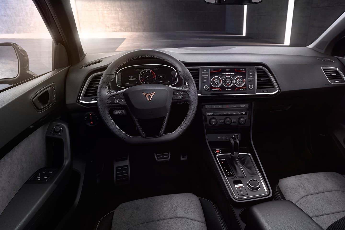 El habitáculo del Cupra Ateca ofrece una atmósfera deportiva con tapizados en piel y alcántara para asientos, puertas, volante y pomo del cambio. Además añadirá costuras en contraste de color gris e inserciones en símil de fibra de carbono. Las molduras del interior son en negro lacado, encontrando un diseño específico tanto para el sistema de infoentretenimiento con pantalla de 8″ como para el cuadro de instrumentos virtual SEAT Digital Cockpit con 12,3 pulgadas.