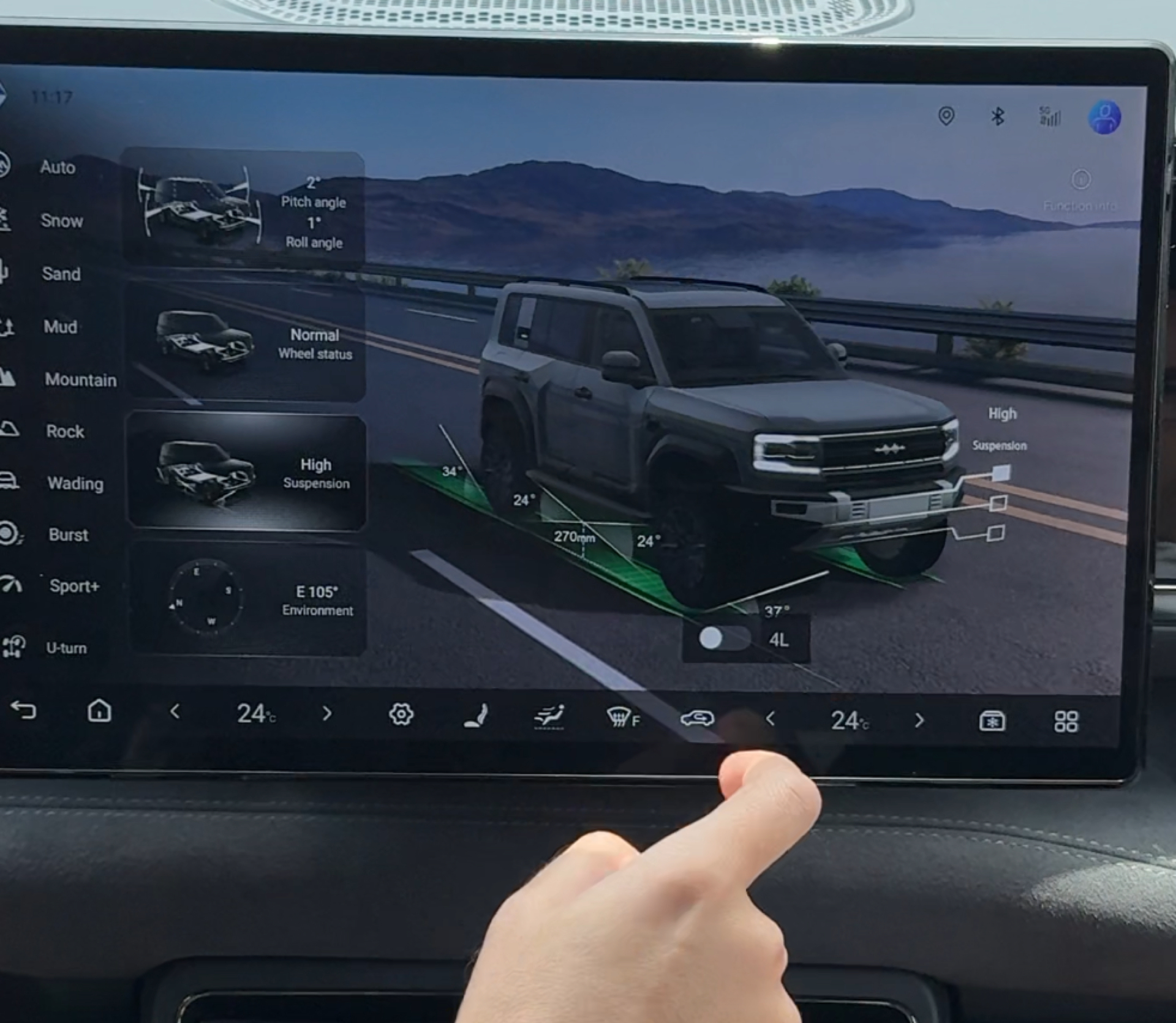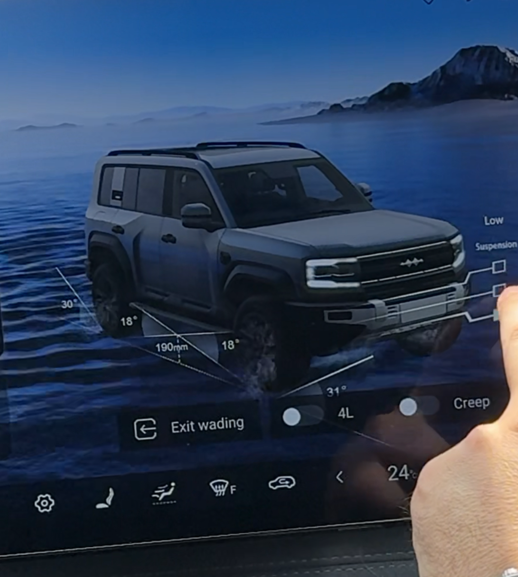 En cuanto a capacidades todoterreno, es importante destacar que estamos ante un todoterreno con una arquitectura tradicional de largueros y travesaños, reforzada por el pack de baterías con función estructural, que BYD denomina DM-O – de Dual Mode Off-Road. También el hecho de disponer de una reductora.