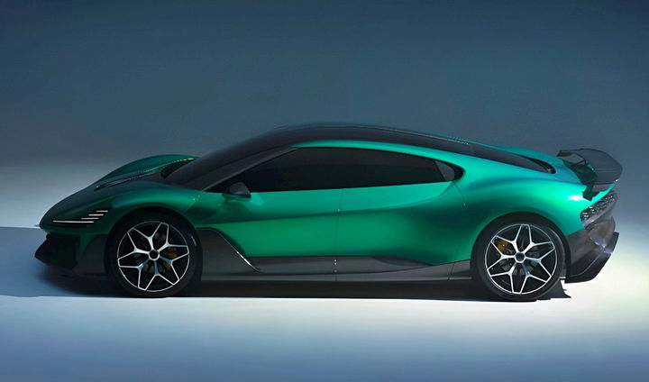 Hay que reconocer que, a nivel visual, es llamativo. Tiene una carrocería bajísima y alargada, afilada, sin tiradores a la vista para las puertas, con mucha fibra de carbono y una llamativa pintura verde. En cuanto a diseño y concepto, es lo más parecido a un Koenigsegg Gemera… Sin ser un Gemera.