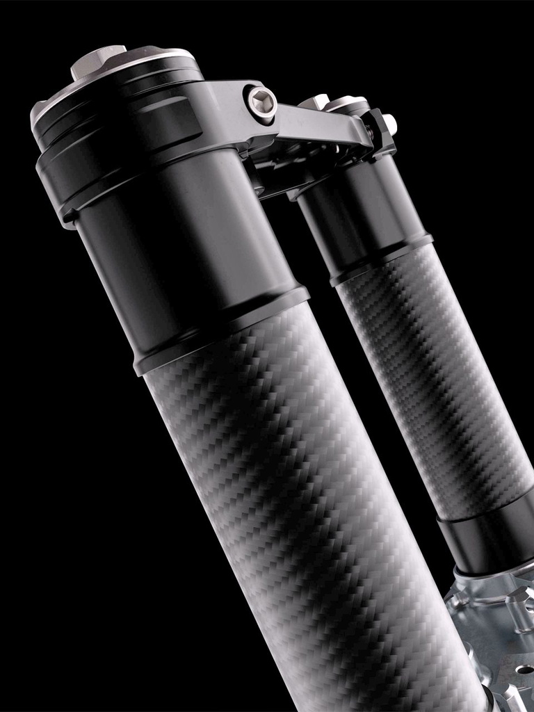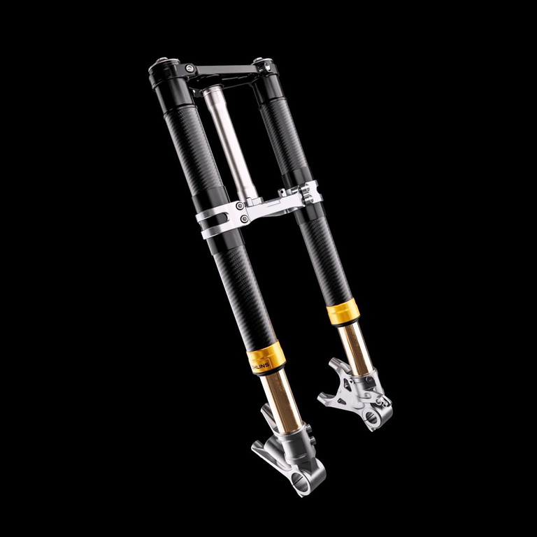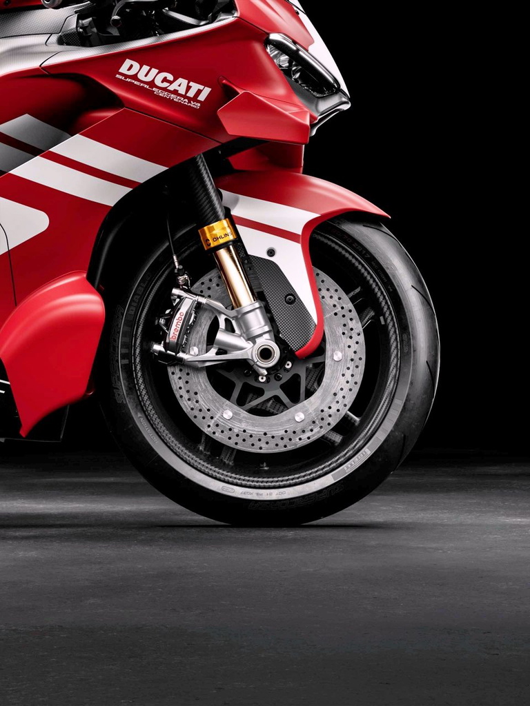 La Superleggera V4 Centenario es la primera moto de carretera equipada con la horquilla mecánica presurizada Öhlins NPX 25/30 Carbon, con barras de fibra de carbono un 8% más ligeras respecto a la Panigale V4 R. En la parte trasera lleva el amortiguador Öhlins TTX36 GP LW, con un muelle de acero especial y válvulas de MotoGP.
