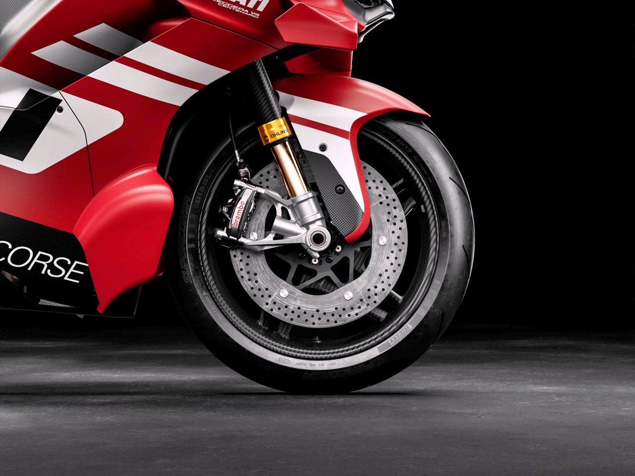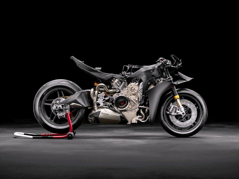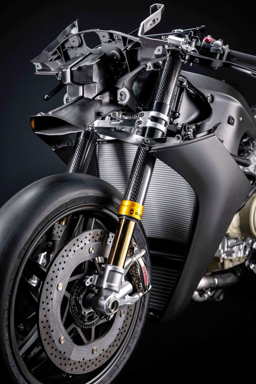 Ducati ha construido prácticamente toda la moto en fibra de carbono: bastidor, basculante, subchasis e incluso las llantas. El bastidor delantero pesa un 17 % menos que el de aluminio de la Panigale V4 y el basculante es un 21% más ligero. Las llantas quitan otros 300 gramos, el subchasis delantero ahorra 200 y el monocasco trasero reduce el peso en 1,4 kg. El resultado es una moto de solo 173 kg en configuración de carretera.