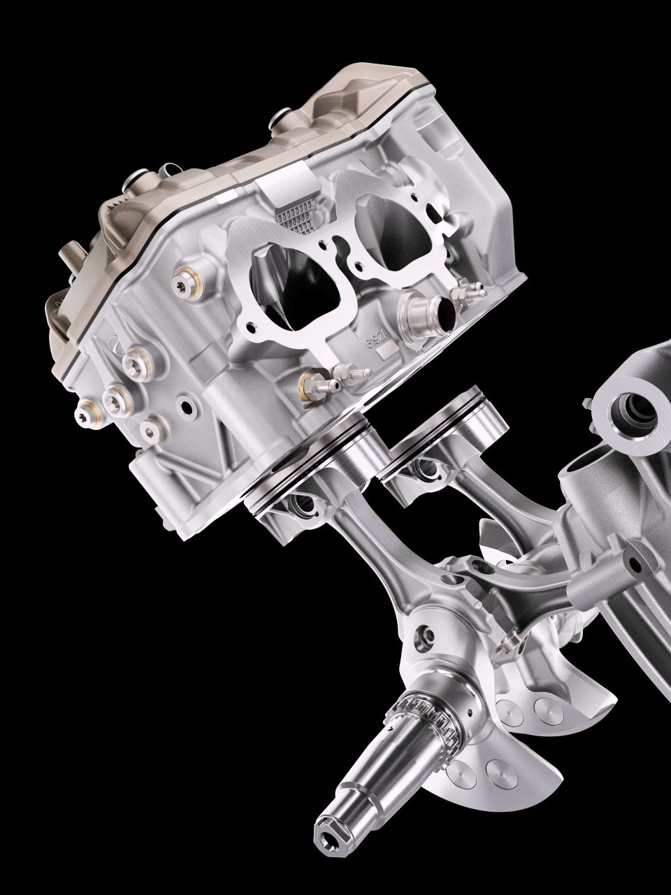 Los colectores están fijados para reducir el peso y se han optimizado con diferentes longitudes (20 mm a la izquierda, 10 mm a la derecha) para mejorar el flujo. El resultado es un motor que pesa 3,6 kg menos que el de la Panigale V4 con embrague en seco.