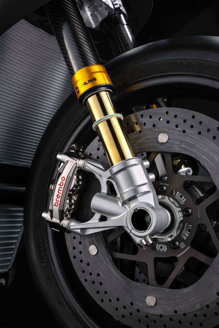 Y también es la primera moto del mundo en llevar un sistema de frenos carbocerámicos homologados para carretera, cogidos directamente de MotoGP. Cada disco pesa 450 gramos menos y reduce la inercia en un 40%, y se combinan con nuevas pinzas monobloque, todo firmado por Brembo.