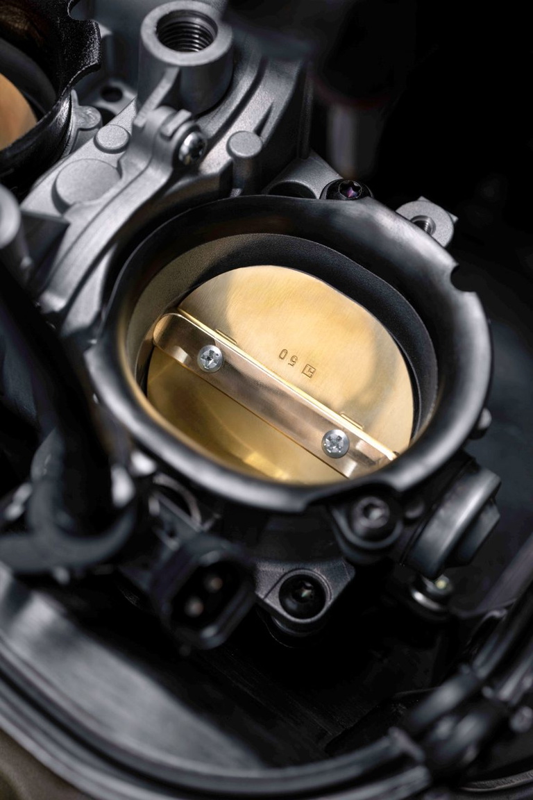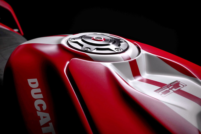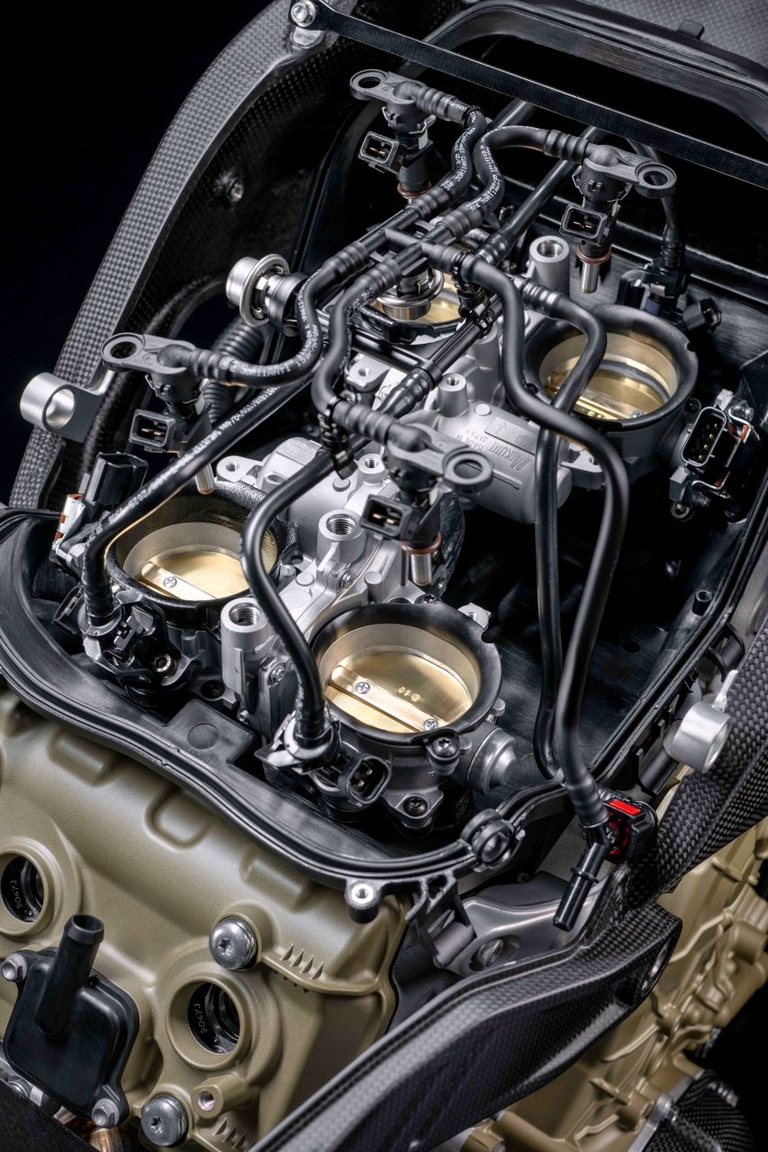 Ducati ha trabajado mucho en reducir las masas internas y las inercias. El cigüeñal se ha aligerado sustituyendo los contrapesos de acero por insertos de tungsteno, lo cual se traduce en una respuesta más inmediata al gas y una subida de vueltas más rápida. Tiene cuerpos de mariposa de 56 mm, más grandes que los de la Desmosedici Stradale (52 mm), y los conductos de admisión y escape están pulidos para optimizar el flujo de aire.