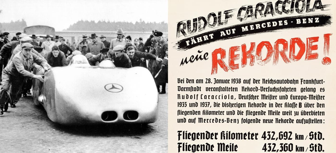 En un tramo de 34 kilómetros de la Autobahn que unía Frankfurt con Darmstadt, Caracciola hizo dos recorridos (ida y vuelta) en el que consiguió una media de 432,7 km/h en un kilómetro lanzado, y 432,36 km/h en una milla lanzada. Tal fue la dimensión de aquella gesta que lo llamaron el ‘Récord Eterno’.
