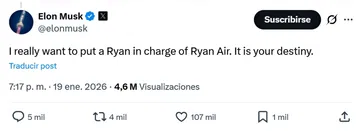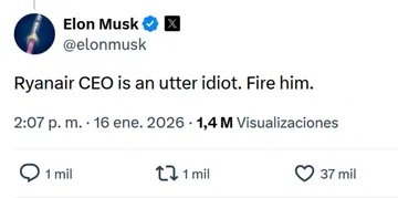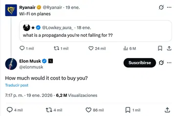 La cosa no acabó ahí. Días después, un usuario anónimo puso: «¿En qué propaganda no vas a picar?» y el perfil oficial de Ryanair lo reposteó diciendo: «WiFi en los aviones». Ahí fue cuando Musk estalló y preguntó en voz alta cuánto le costaría comprar Ryanair.