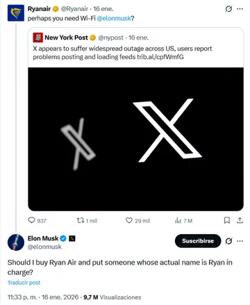 Días después del debate, X sufrió una caída parcial en Estados Unidos y el equipo de comunicación de Ryanair aprovechó para lanzar una pulla: «¿Quizá necesitas WiFi, Elon Musk?» y el magnate les respondió preguntando, medio broma medio en serio, si debería comprar la compañía y poner al frente a alguien cuyo verdadero nombre sea Ryan.