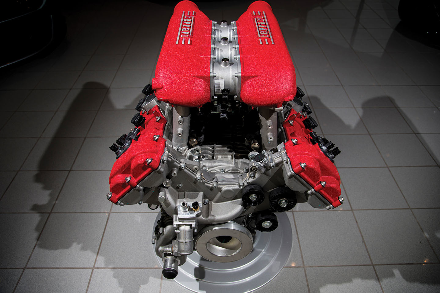 Lo que ves es el motor del Ferrari 458 Italia. Es un motor V8 atmosférico, con ocho cilindros en uve de 90º, cárter seco, 4.499 cm3 e instalado, como no podía ser menos en este deportivo, en posición central-trasera longitudinal.