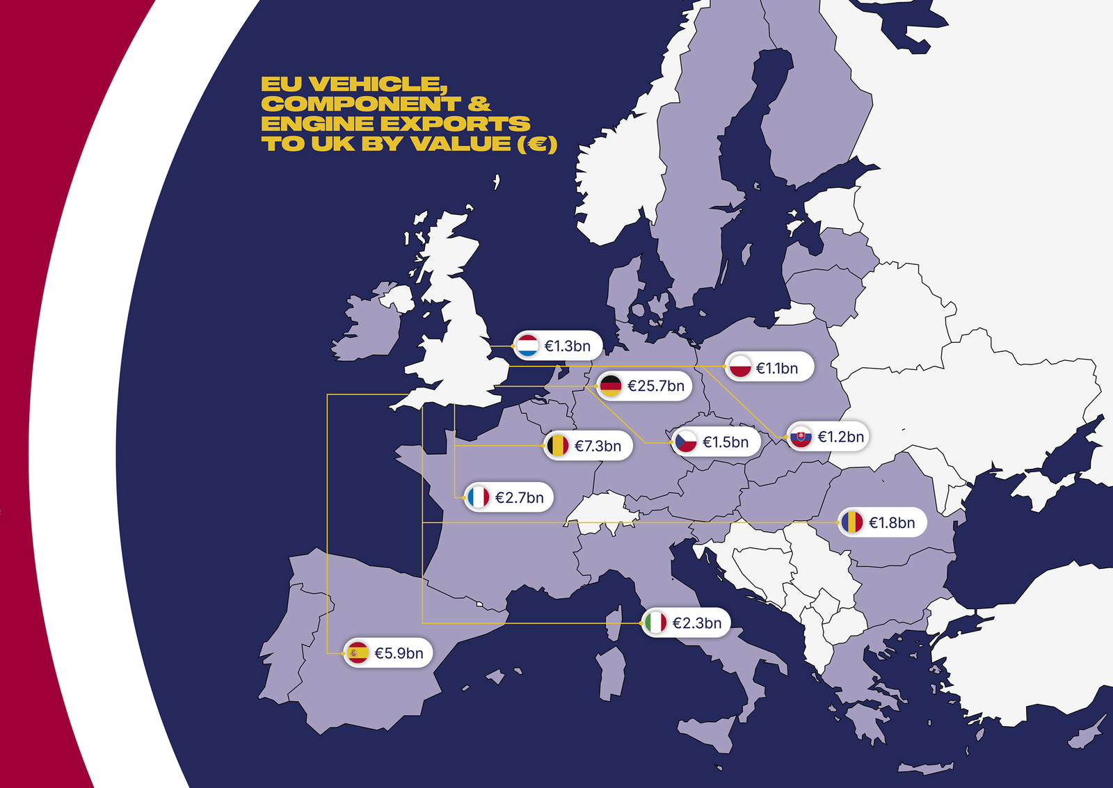 La relación entre la Unión Europea y Reino Unido mueve alrededor de 80.000 millones de euros al año alrededor de la industria del automóvil, con un saldo favorable a la propia UE. Según defiende la SMMT, Reino Unido sigue siendo el mayor mercado de exportación para los turismos europeos, con un valor anual de 39.700 millones de euros, a lo que hay que sumar otros 9.100 millones de euros en componentes. Europa vende a Reino Unido más coches y más piezas que a mercados tan relevantes como Estados Unidos o China.