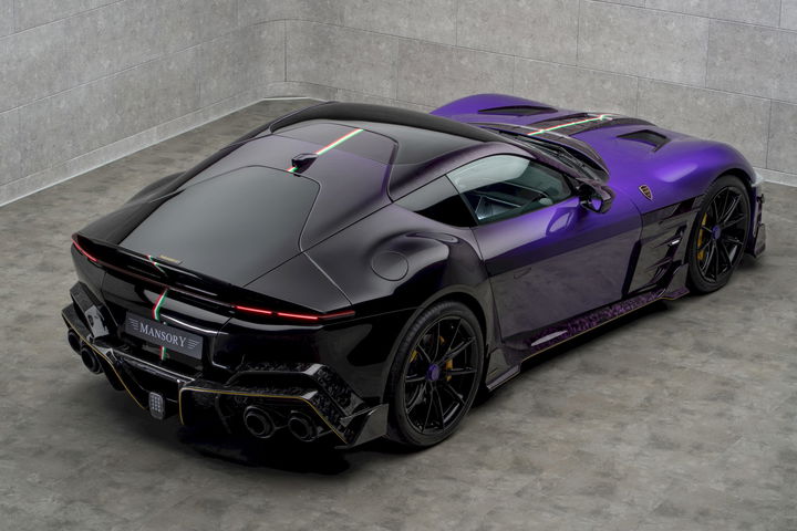 Se puede decir que lo más italiano que resta en la modificación es la presencia de la tricolore nacional recorriendo longitudinalmente todo el vehículo, ya que el resto ha heredado una carrocería bitono que comienza en la parte delantera con un tono morado y que va difuminándose para terminar en una zaga completamente negra, combinada en este caso por los elementos en fibra de carbono que han recibido un tratamiento de «Forged Full Carbon» que lo dota de ese peculiar patrón.