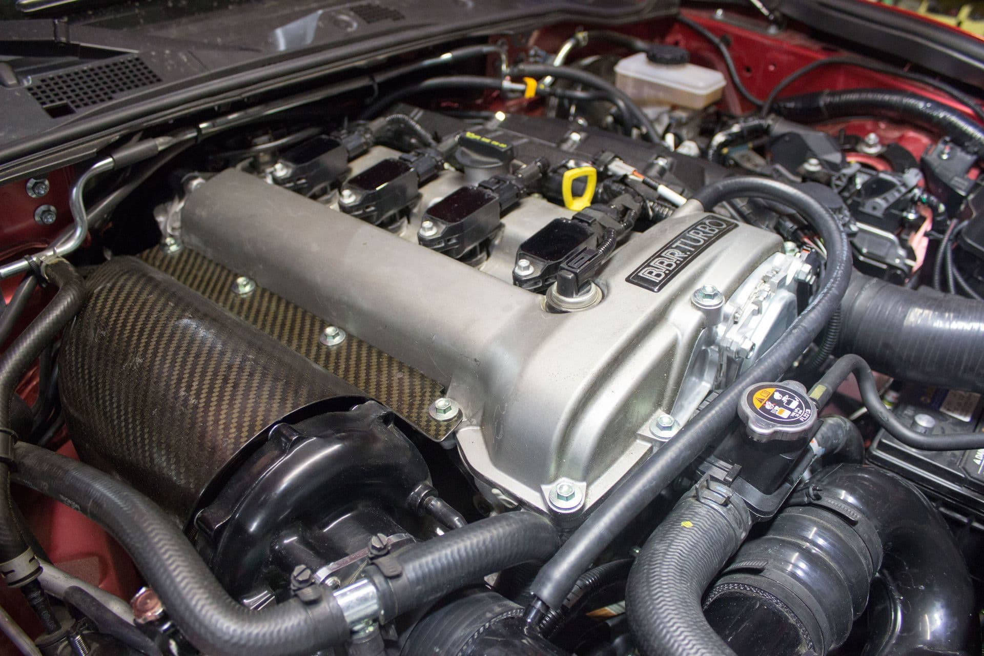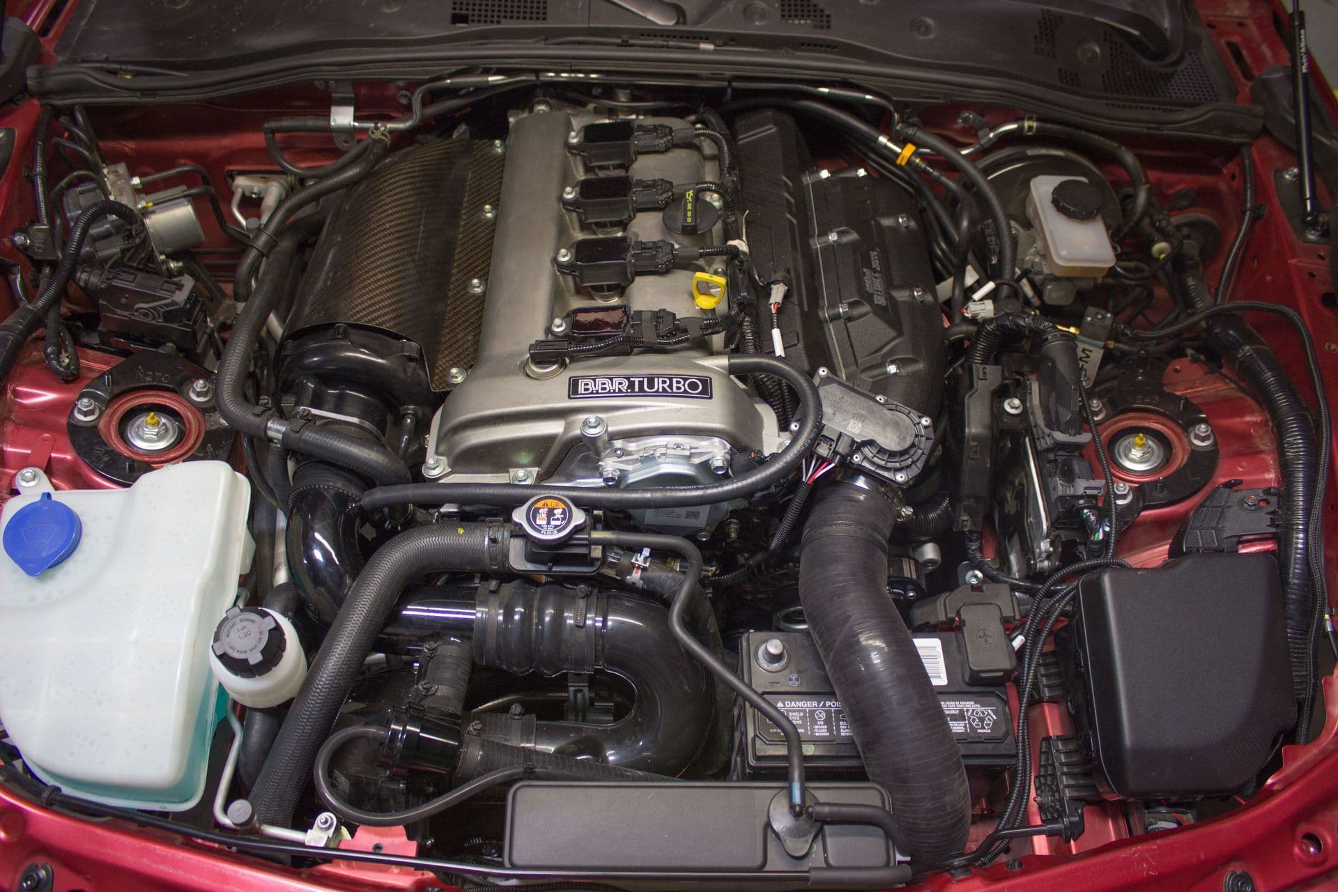 Flyin’ Miata y BBR saben que gracias a la alta compresión del motor y su régimen de giro, este esquema anti-intuitivo es el que mejor funciona. Los kits BBR para el Mazda MX-5 emplean turbos que soplan a 0,55 bar de presión máxima, pese a ser capaces de soplar a mucha más presión. Optan por retener el carácter y el tacto del motor, frente a ofrecer espectaculares incrementos de potencia en una banda estrecha del régimen de giro. Con todo, logran aumentar la potencia del 2.0 desde sus 160 CV, hasta unos respetables 251 CV. Reconocen que el límite del sistema de turbo serían unos 400 CV, aproximadamente.