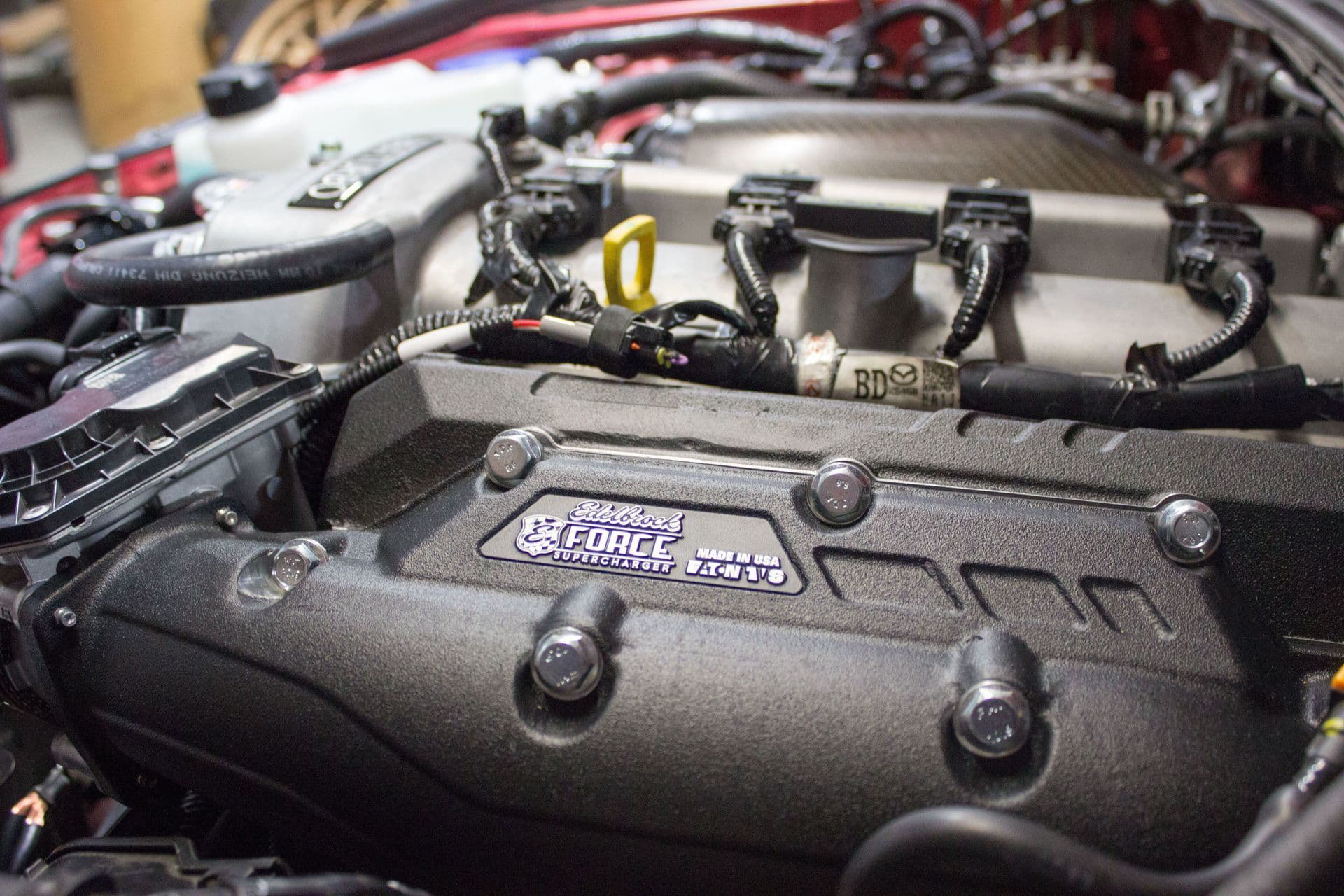 Sobre esta base, Flyin’ Miata ha montado el compresor volumétrico Edelbrock e-Force. En esta primera fase, la empresa está logrando desarrollar un equilibrio entre prestaciones, tacto de conducción y usabilidad. No existe una cifra de potencia anunciada, pero lo cierto es que podrían superar los 400 CV fácilmente. Siendo conservadores, posiblemente el equilibrio esté en algo menos de 350 CV. En estos momentos, el factor limitante es el sistema de alimentación de combustible del motor, que actúa como cuello de botella. Posiblemente hagan falta inyectores de más caudal y una nueva bomba de combustible de alto flujo.