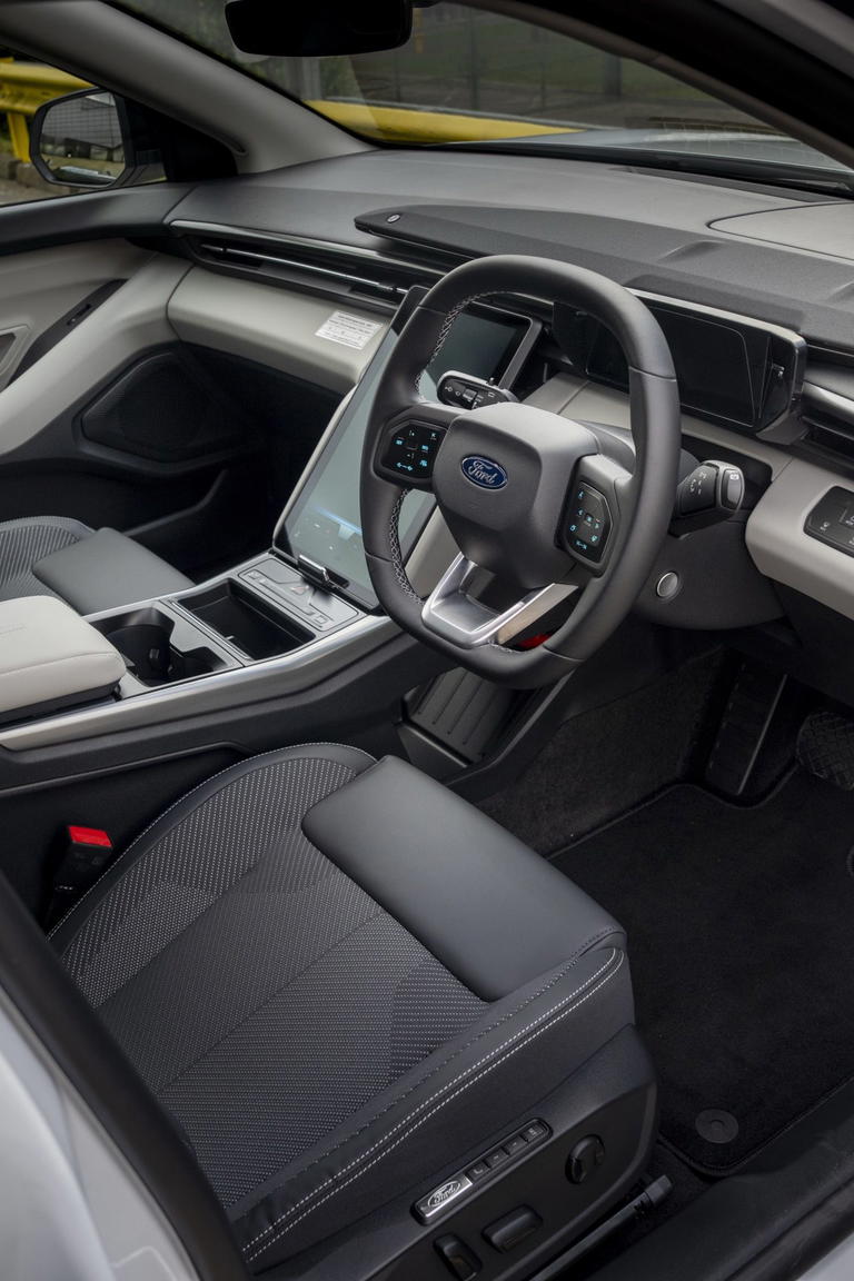 Ford anuncia hasta 602 kilómetros de autonomía WLTP en la versión de tracción trasera. La versión de acceso recurre a un motor trasero de 210 kW, equivalentes a unos 286 CV, con 545 Nm de par. Por encima aparece una opción de tracción total con 250 kW, es decir, cerca de 340 CV, y 679 Nm de par. Respecto a la carga, hasta 135 kW en corriente continua y un 10 al 80% en aproximadamente 25 minutos.