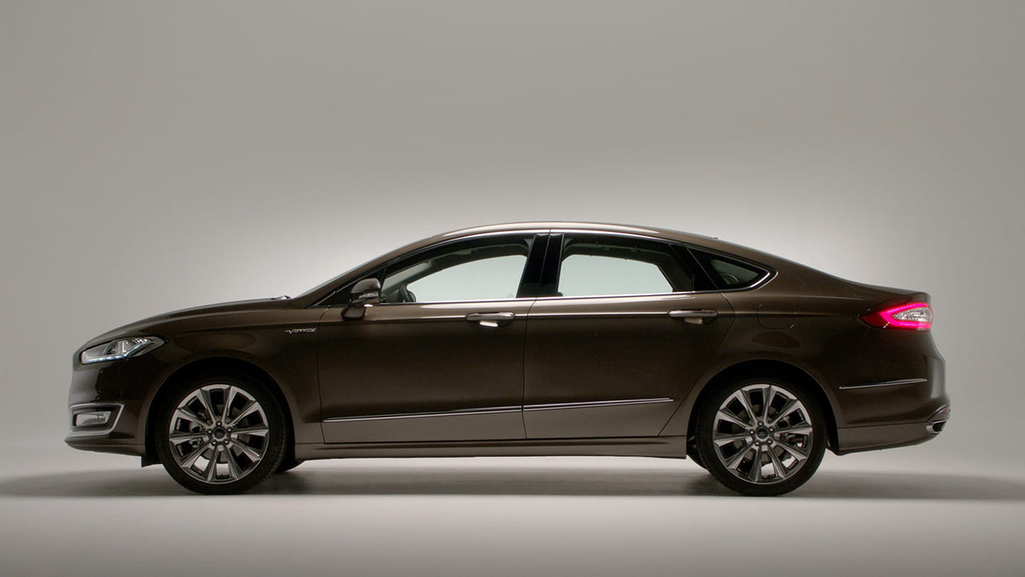 Vista lateral del Ford Mondeo resaltando su diseño aerodinámico y líneas modernas.