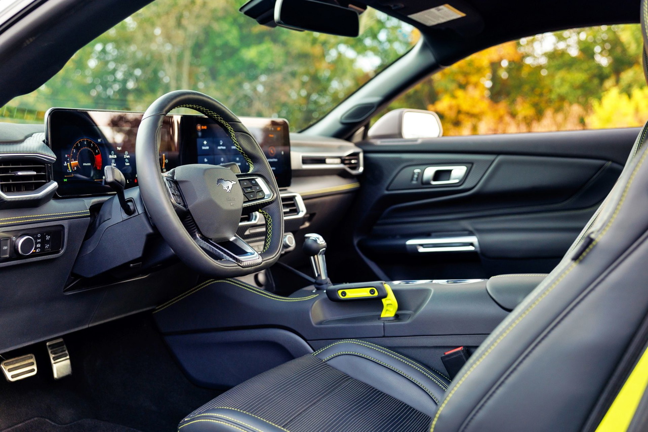 A todo ello le añadimos un kit de carrocería que incluye elementos exclusivos como la parrilla con iluminación diurna específica, paragolpes deportivos, estriberas o el alerón del Dark Horse. En el interior los cambios se centran en tapizados, costuras y cinturones usando un color amarillo fluorescente, además del uso de emblemas conmemorativos, añadiendo también una nueva animación para la instrumentación digital.