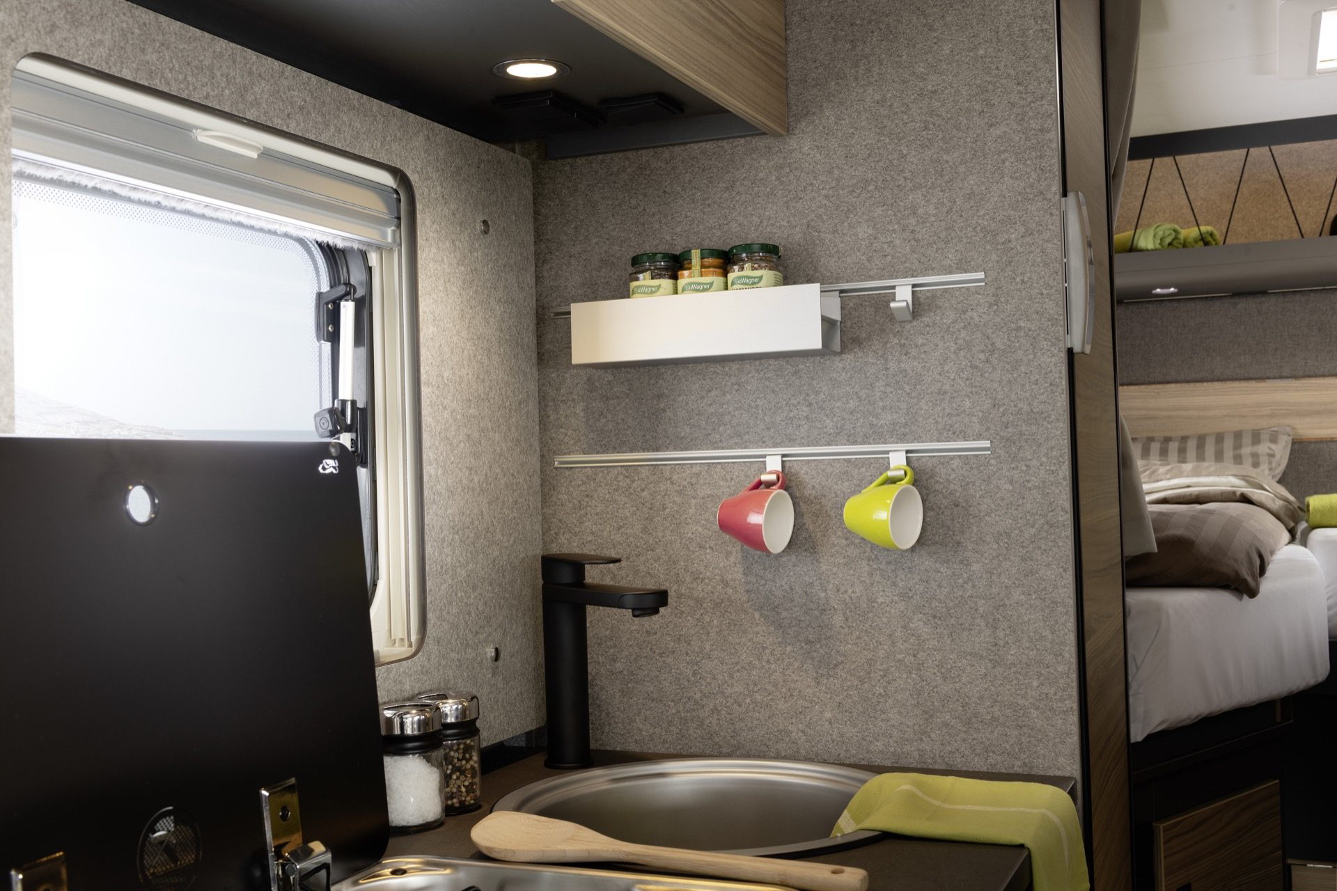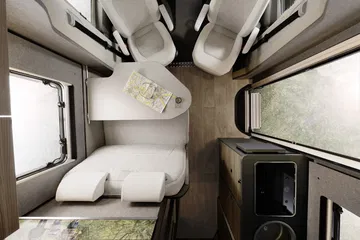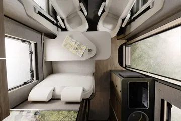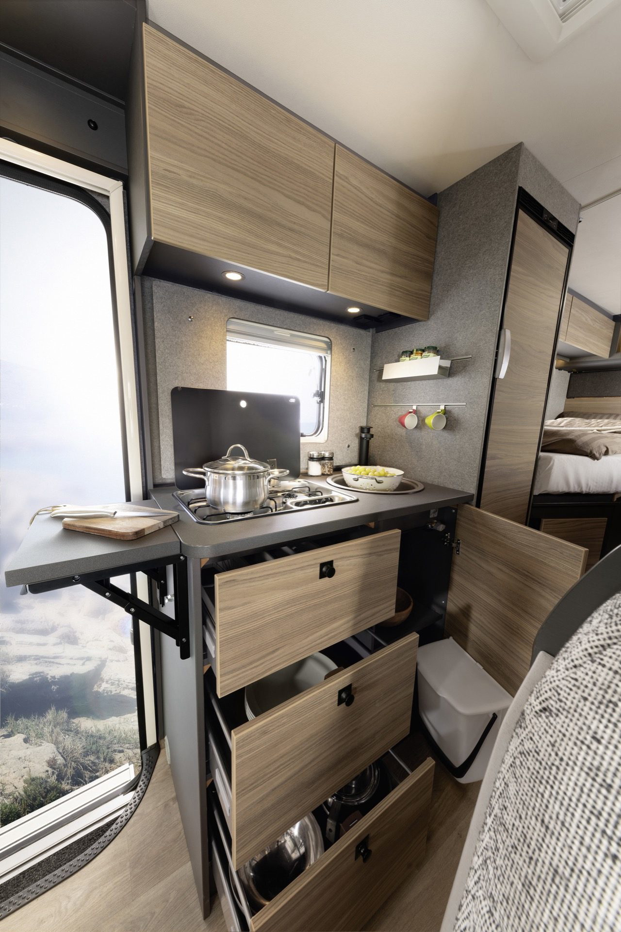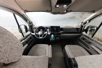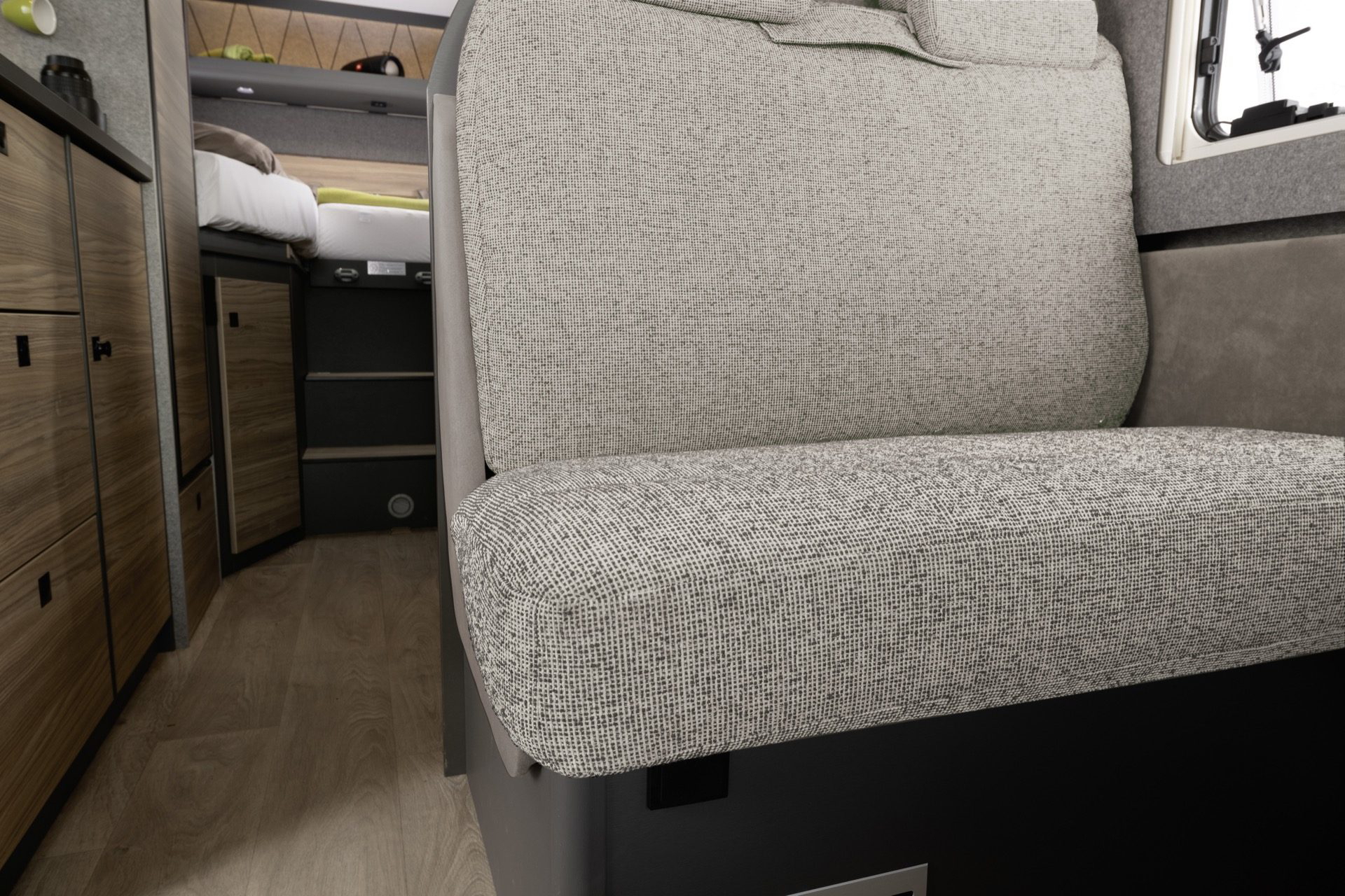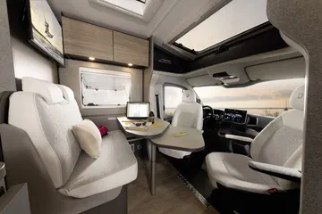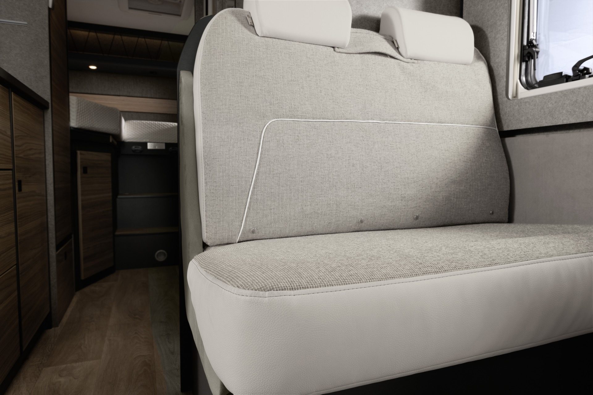Entre su equipamiento no falta todo lo necesario en confort, con unos acabados de alta calidad en tapizados y mobiliario, y control desde pantalla táctil y aplicación móvil con System Control Unit Lite. Emplea baterías de litio, calefacción diésel y frigorífico de compresor con 131 litros de capacidad, por supuesto cocina de gas y fregadero. También incluye cuarto de aseo con ducha, con depósito de agua en marcha de 20 litros, capacidad total de 115 litros, y depósito de aguas residuales de 90 litros.