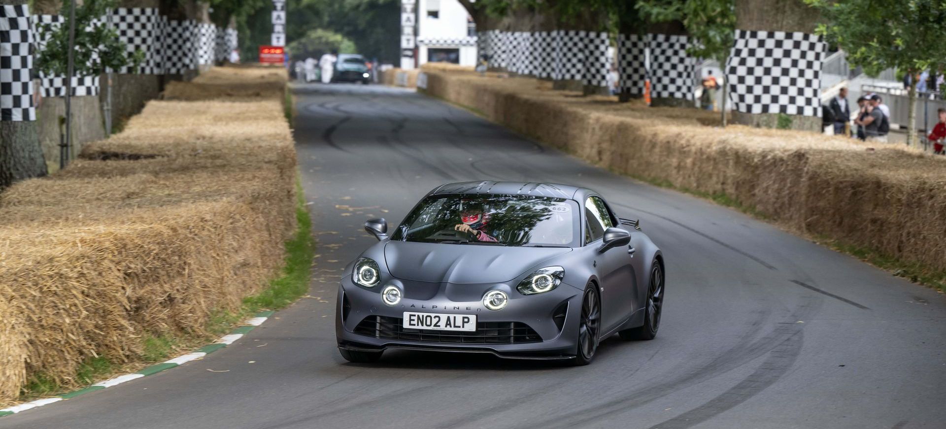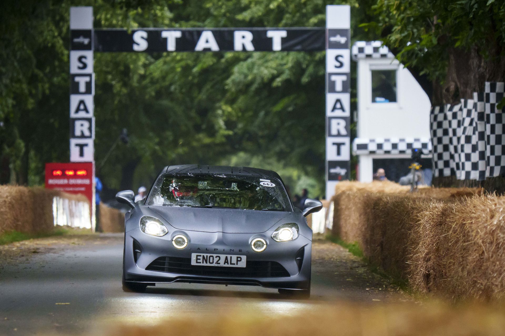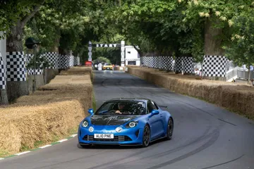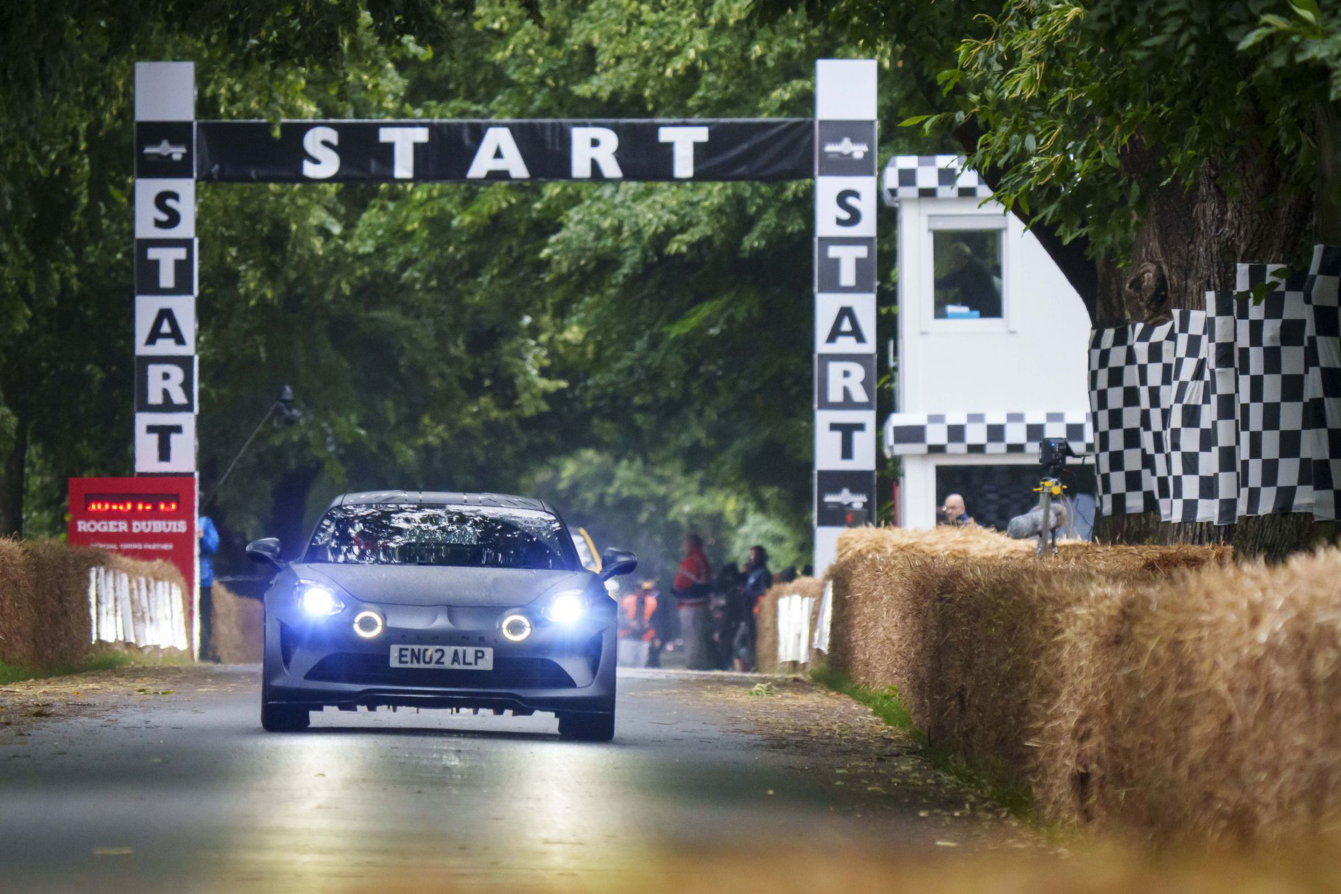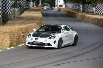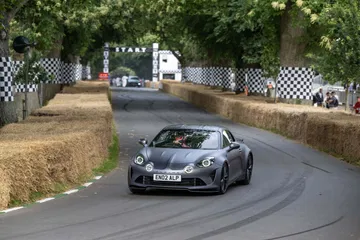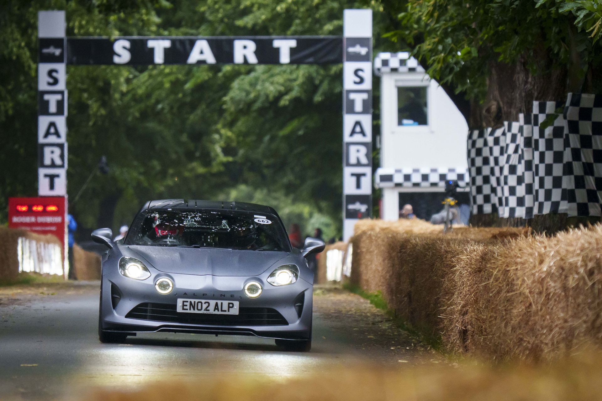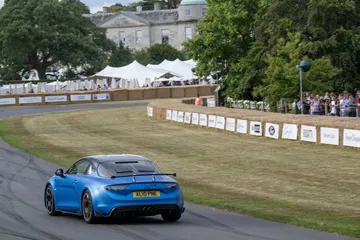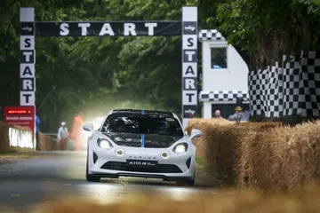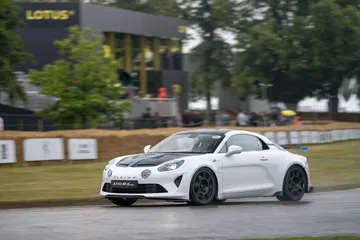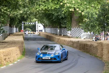 Soy asturiano y la lluvia no me molesta en absoluto, pero añade un extra de emoción cuando vas a hacer un copilotaje en la subida a Goodwood Hill. Y es que era el momento de auparnos al puesto del copiloto de un Alpine A110 S Enstone Edition. A los mandos estaba la piloto inglesa Abbi Pulling, una promesa de Alpine para la Fórmula 1 que podría hacer grandes cosas en un futuro cercano. En el «atasco» que se formó para llegar a la salida del ascenso teníamos delante un Toyota Supra GT4 y el nuevo Ford Mustang Dark Horse con motor 5.0 V8.