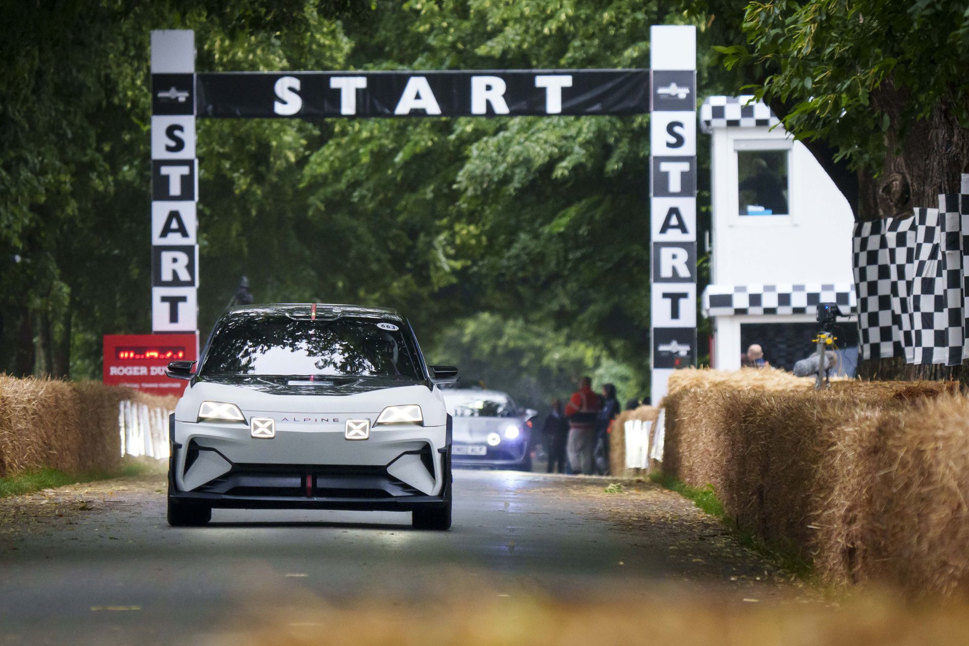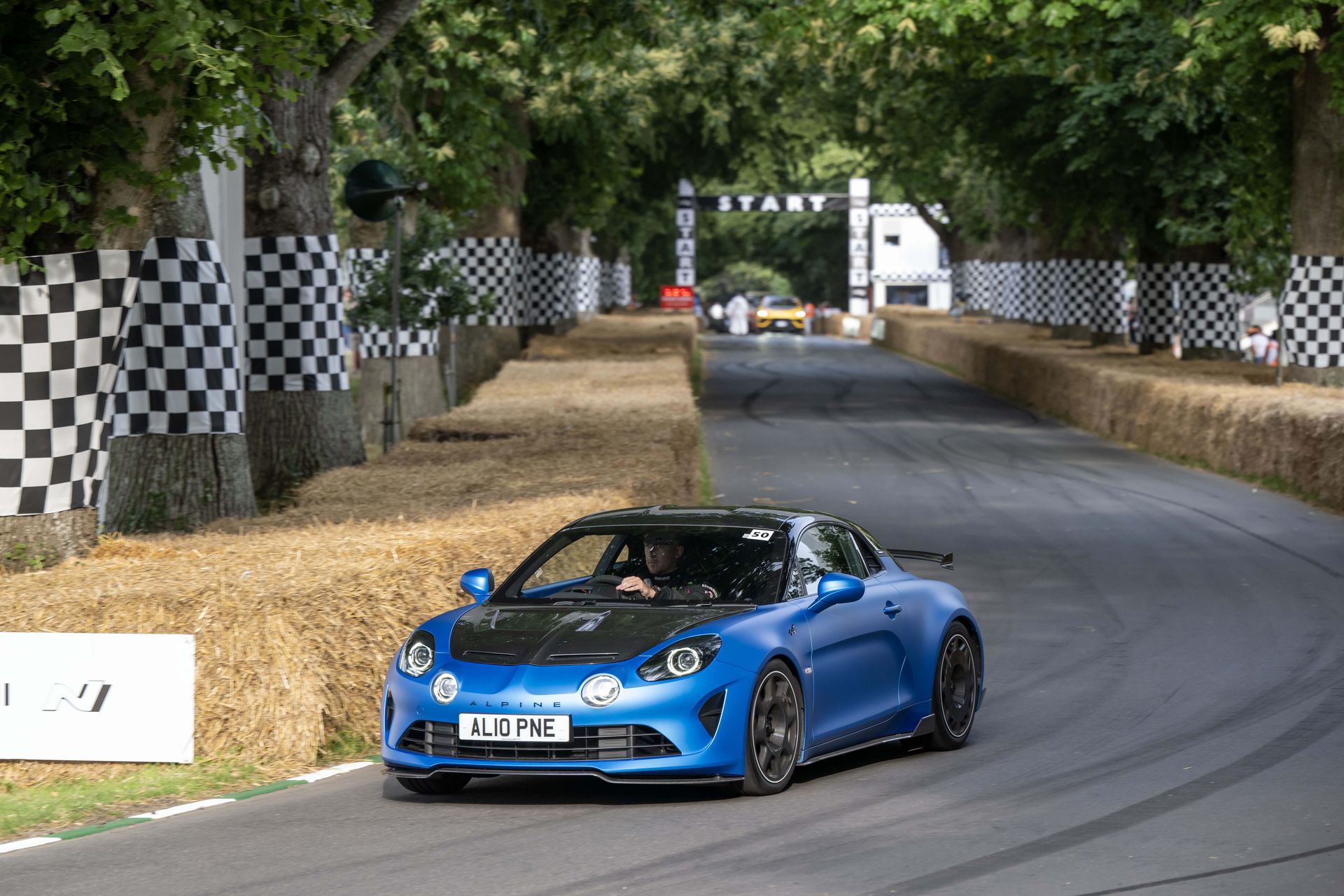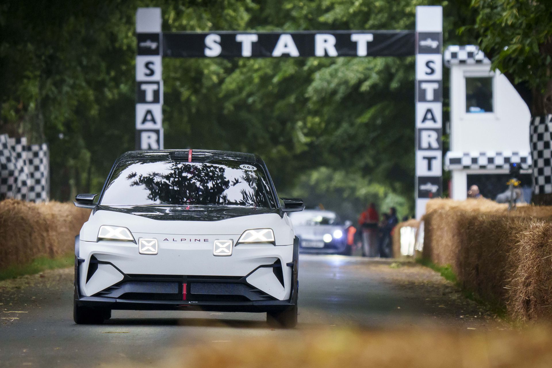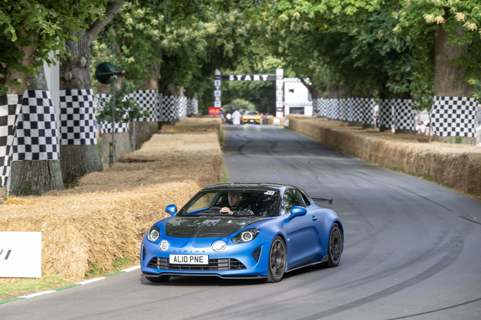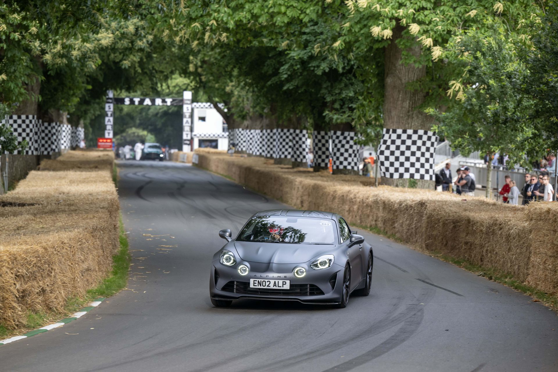 Soy asturiano y la lluvia no me molesta en absoluto, pero añade un extra de emoción cuando vas a hacer un copilotaje en la subida a Goodwood Hill. Y es que era el momento de auparnos al puesto del copiloto de un Alpine A110 S Enstone Edition. A los mandos estaba la piloto inglesa Abbi Pulling, una promesa de Alpine para la Fórmula 1 que podría hacer grandes cosas en un futuro cercano. En el «atasco» que se formó para llegar a la salida del ascenso teníamos delante un Toyota Supra GT4 y el nuevo Ford Mustang Dark Horse con motor 5.0 V8.