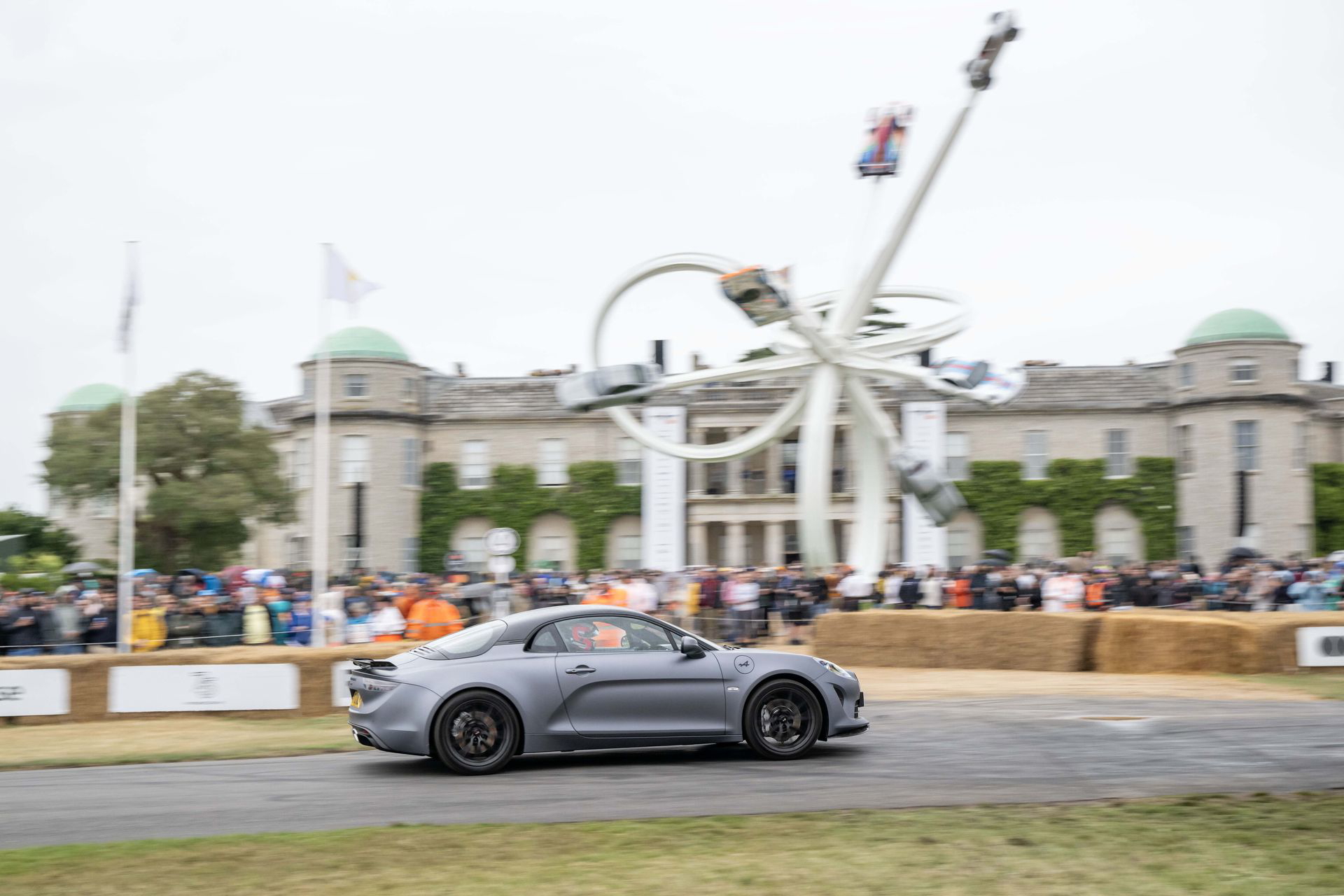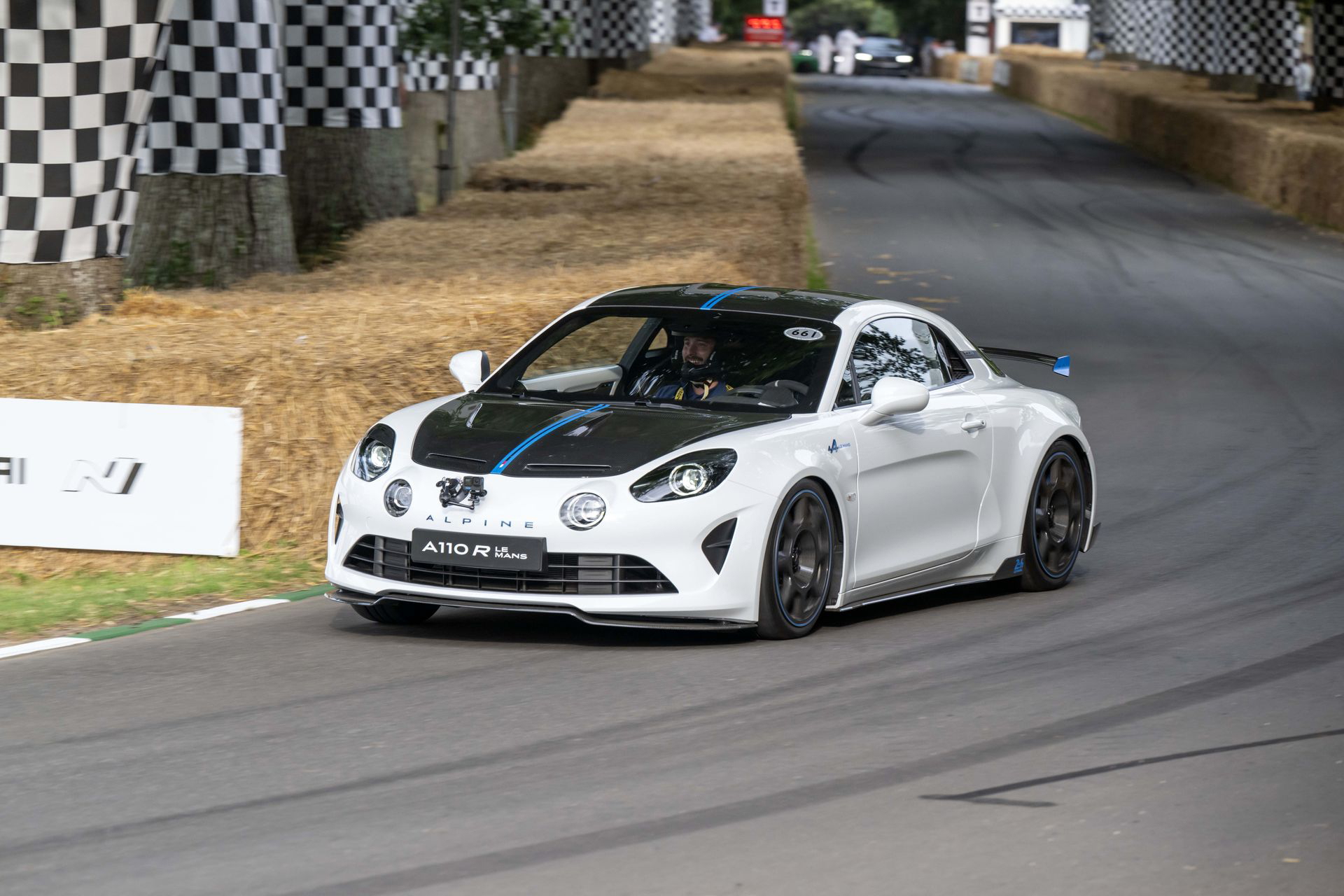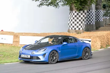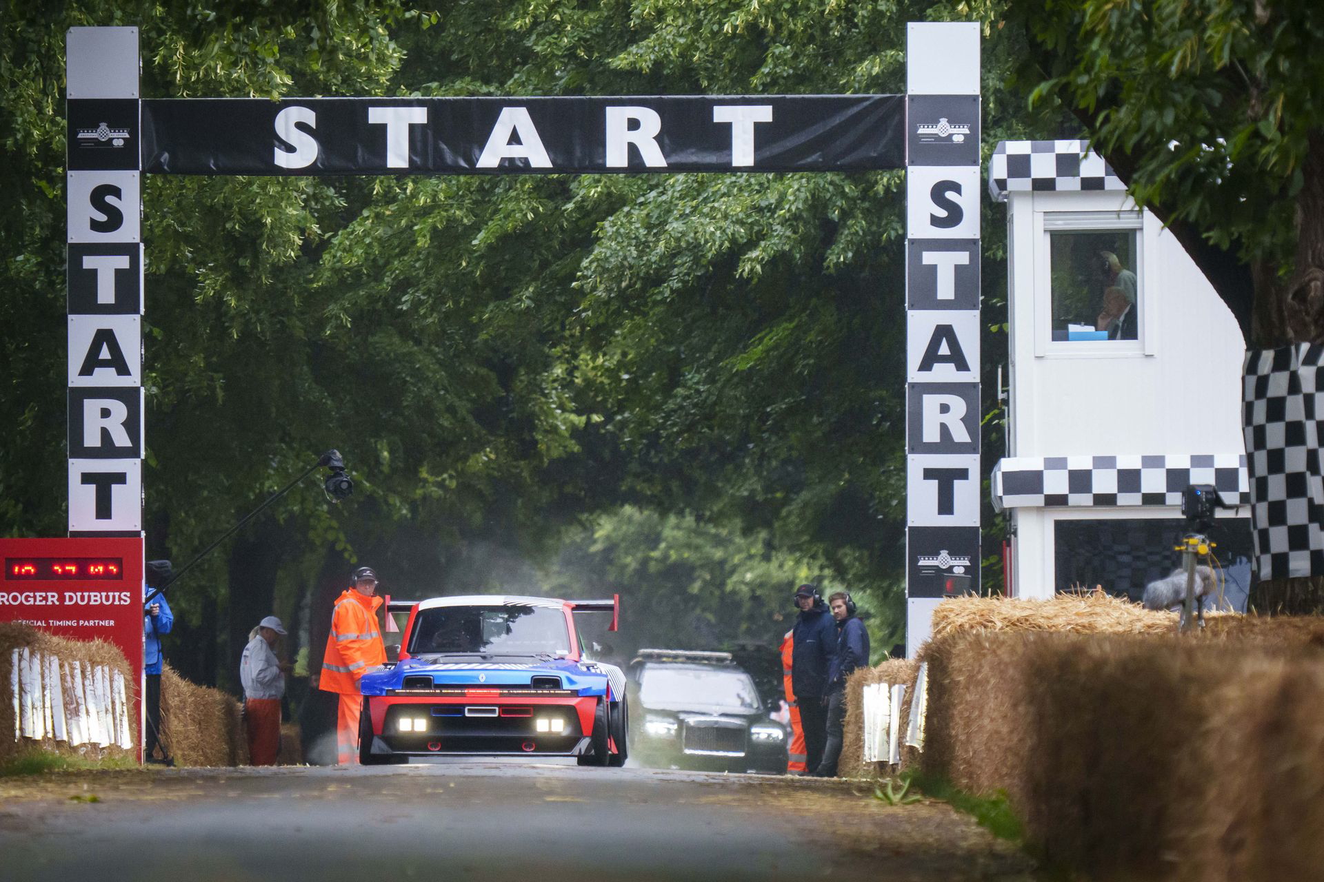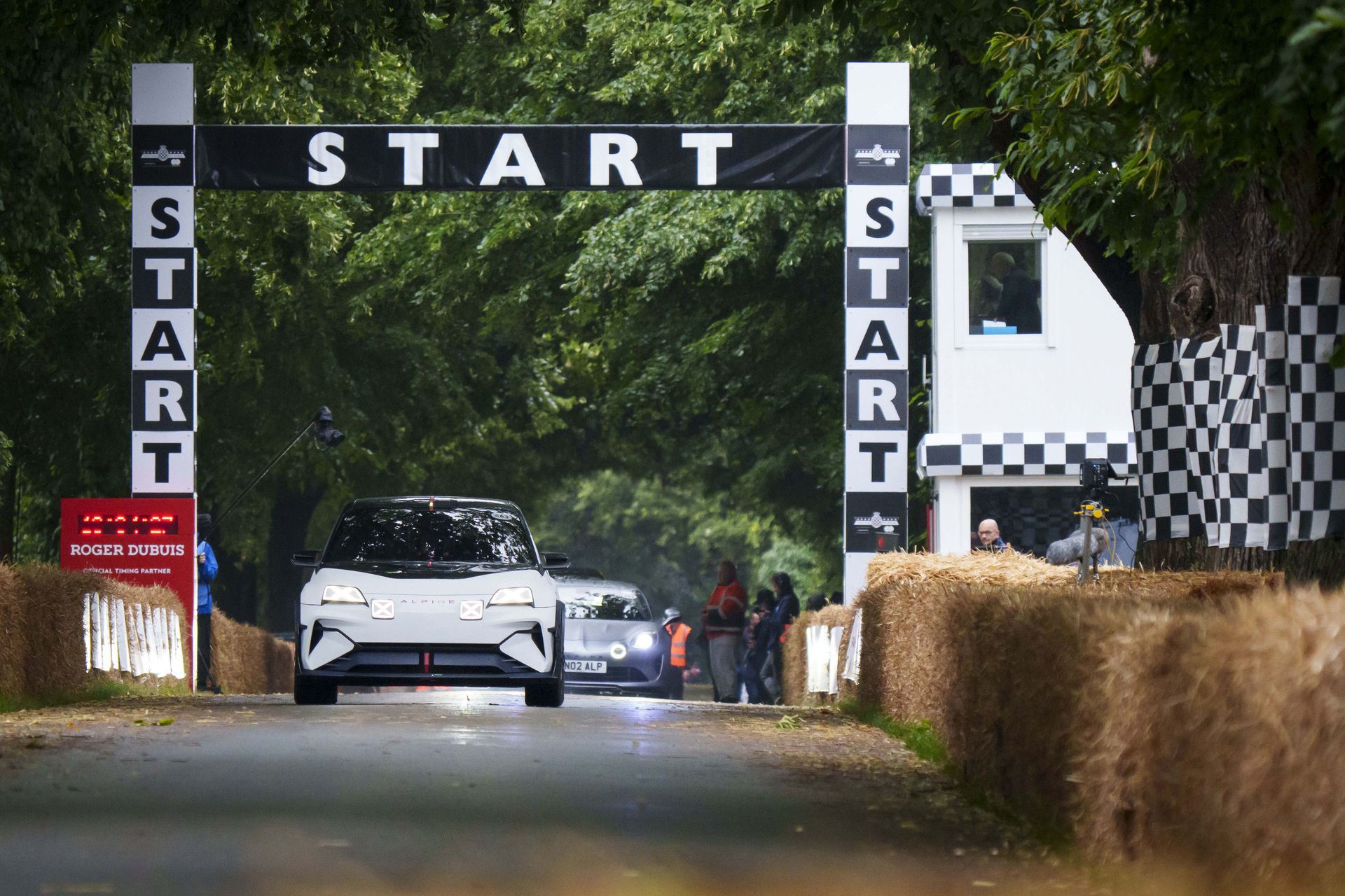 Soy asturiano y la lluvia no me molesta en absoluto, pero añade un extra de emoción cuando vas a hacer un copilotaje en la subida a Goodwood Hill. Y es que era el momento de auparnos al puesto del copiloto de un Alpine A110 S Enstone Edition. A los mandos estaba la piloto inglesa Abbi Pulling, una promesa de Alpine para la Fórmula 1 que podría hacer grandes cosas en un futuro cercano. En el «atasco» que se formó para llegar a la salida del ascenso teníamos delante un Toyota Supra GT4 y el nuevo Ford Mustang Dark Horse con motor 5.0 V8.