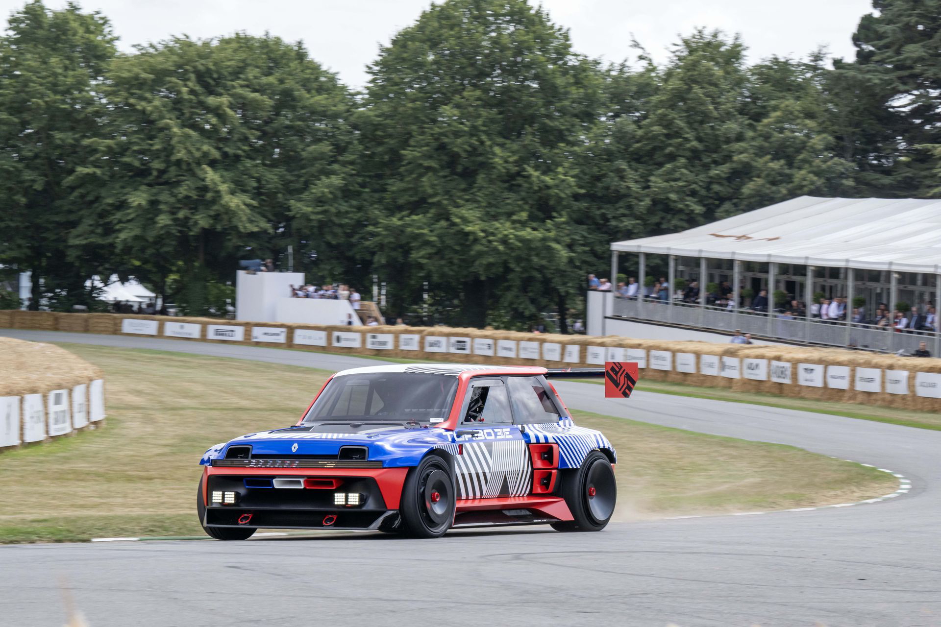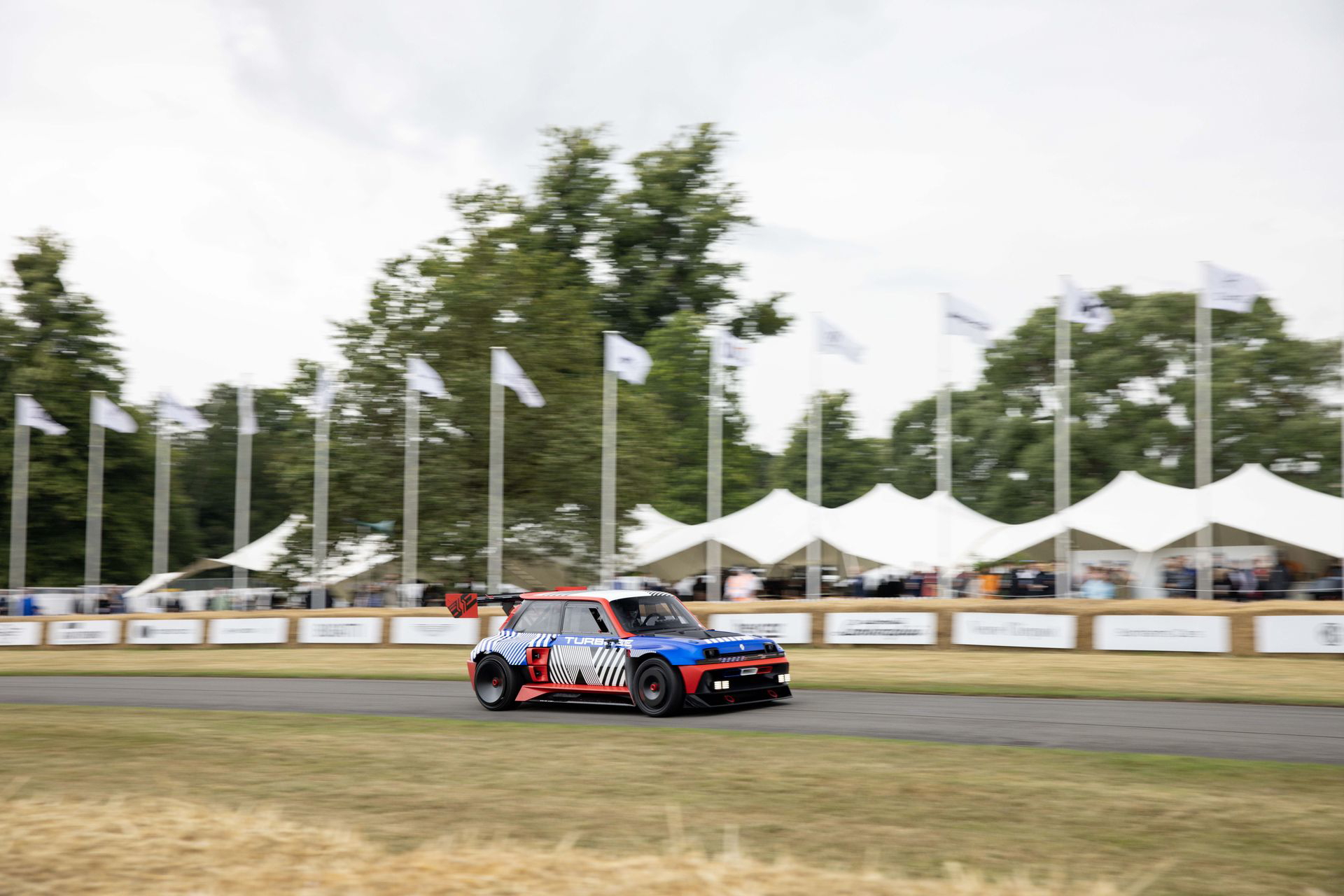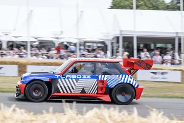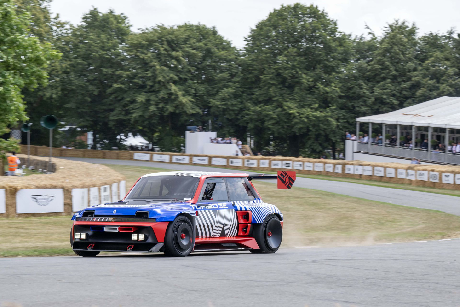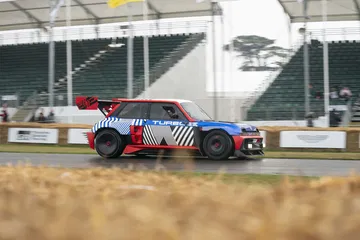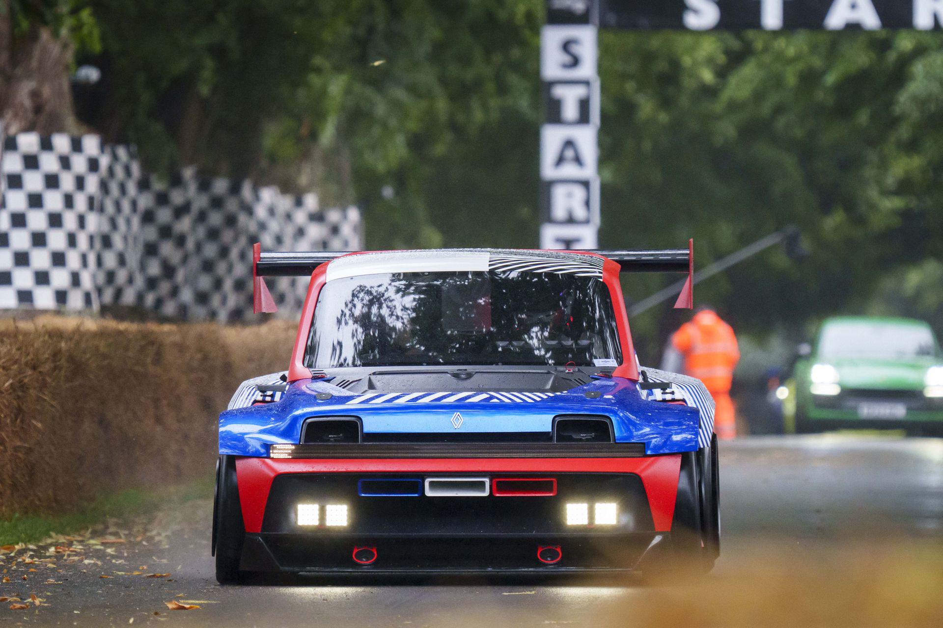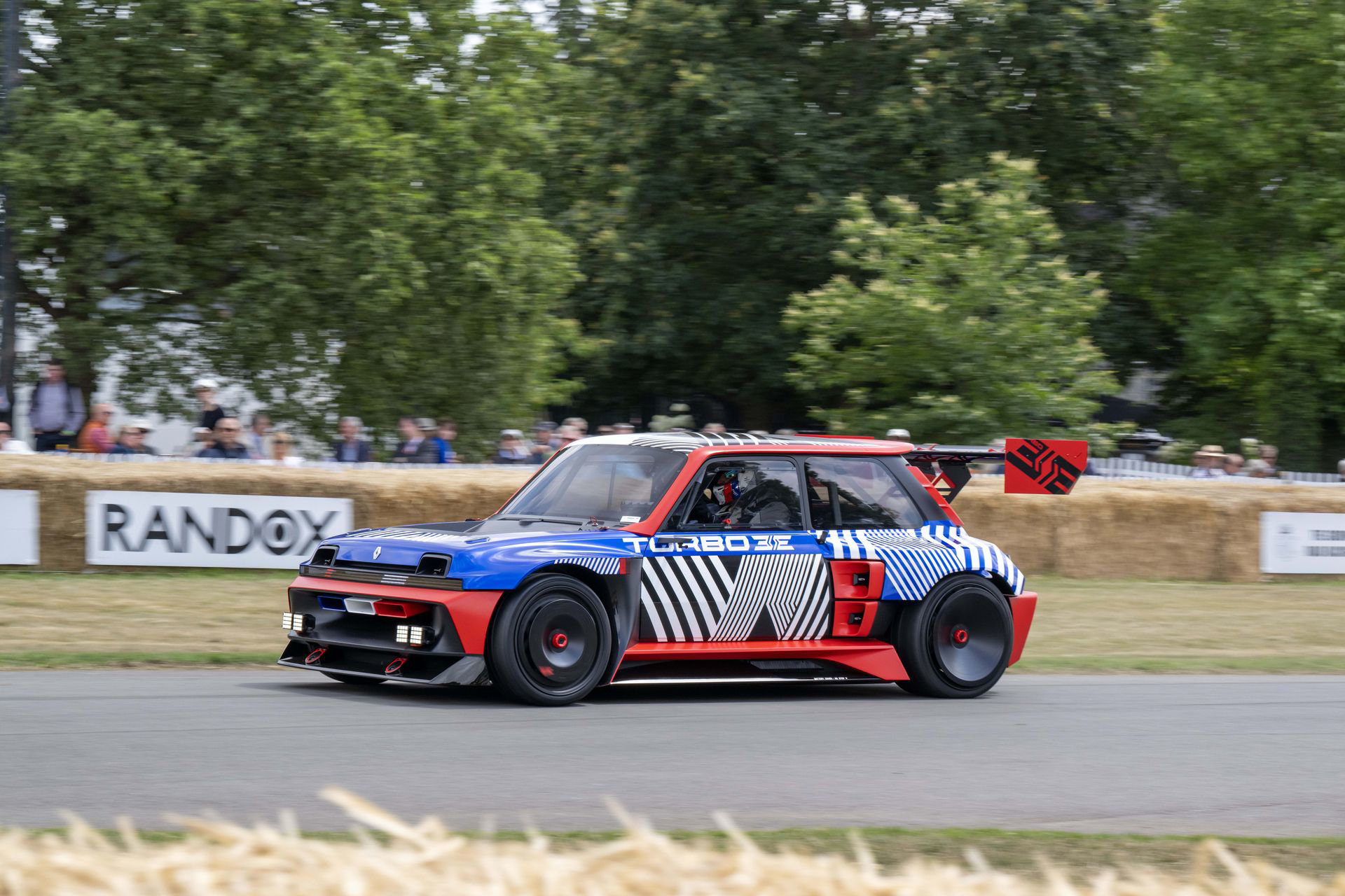 Ese «algo más» es el espectacular Renault Turbo 3E. Este prototipo de estética cyberpunk es un Renault 5 eléctrico de carreras, dotado con un motor de 380 CV, una jaula antivuelco, una aerodinámica de infarto – el alerón es más ancho que el coche – y una carrocería ensanchada hasta los límites de lo posible. Es el equivalente moderno al Renault 5 Turbo «culo gordo». Ya que era el 14 de julio, su librea – creada a medida para Goodwood – tenía los colores de la bandera francesa, también presentes en la pantalla LED frontal del coche.
