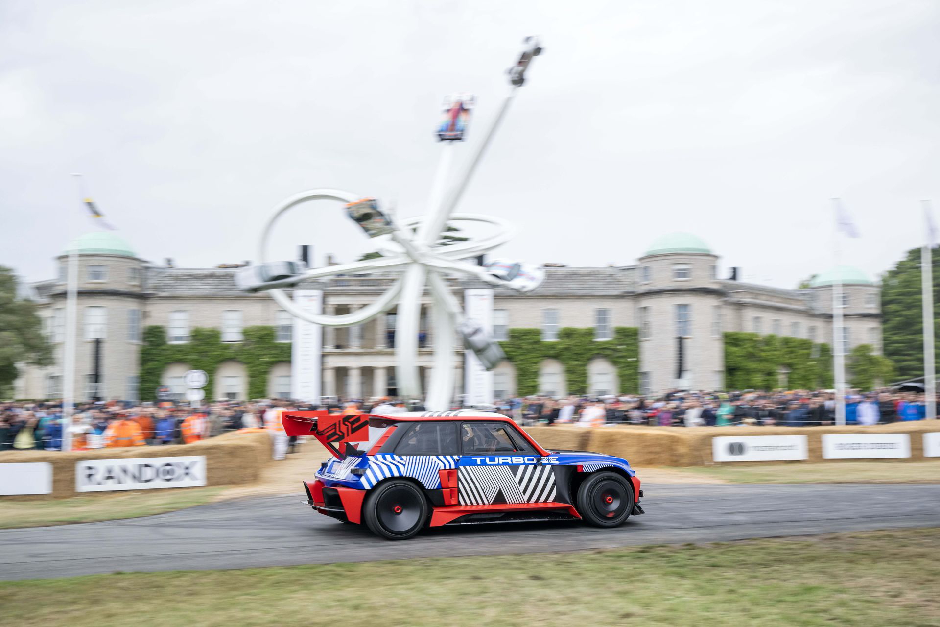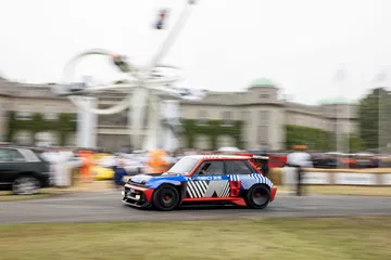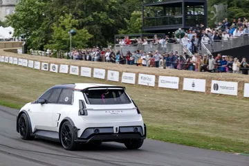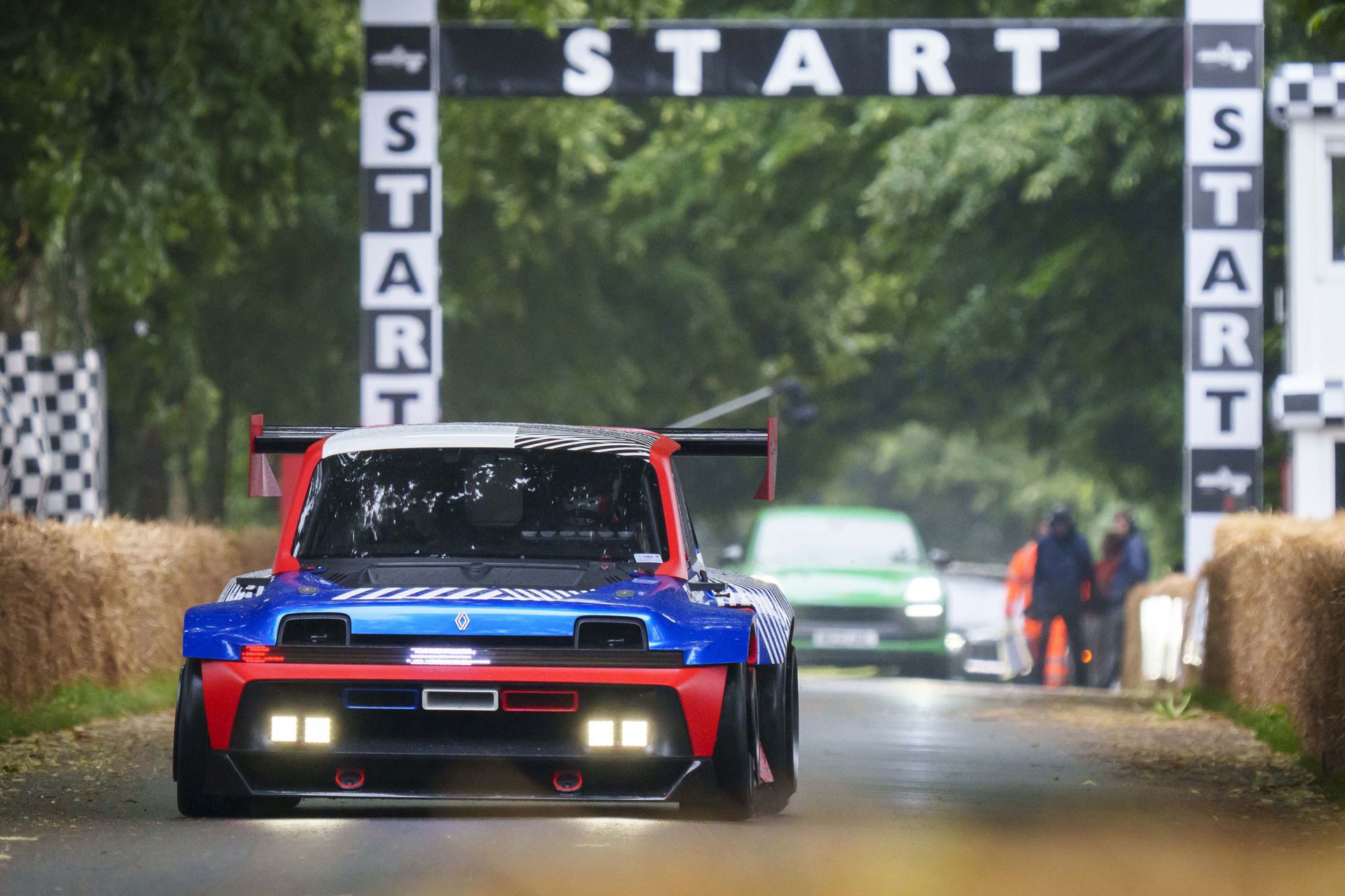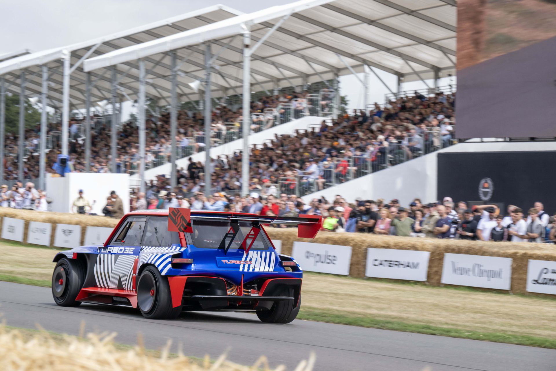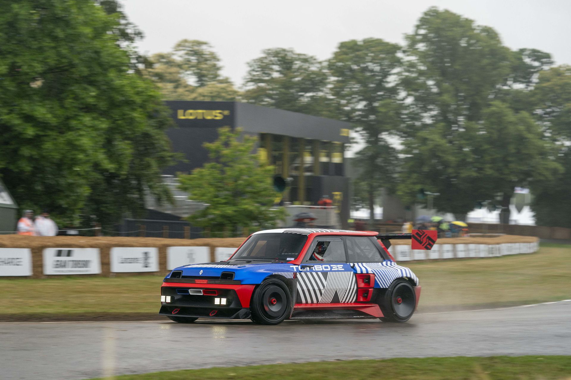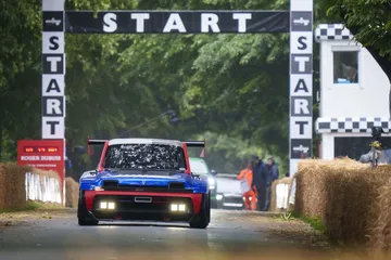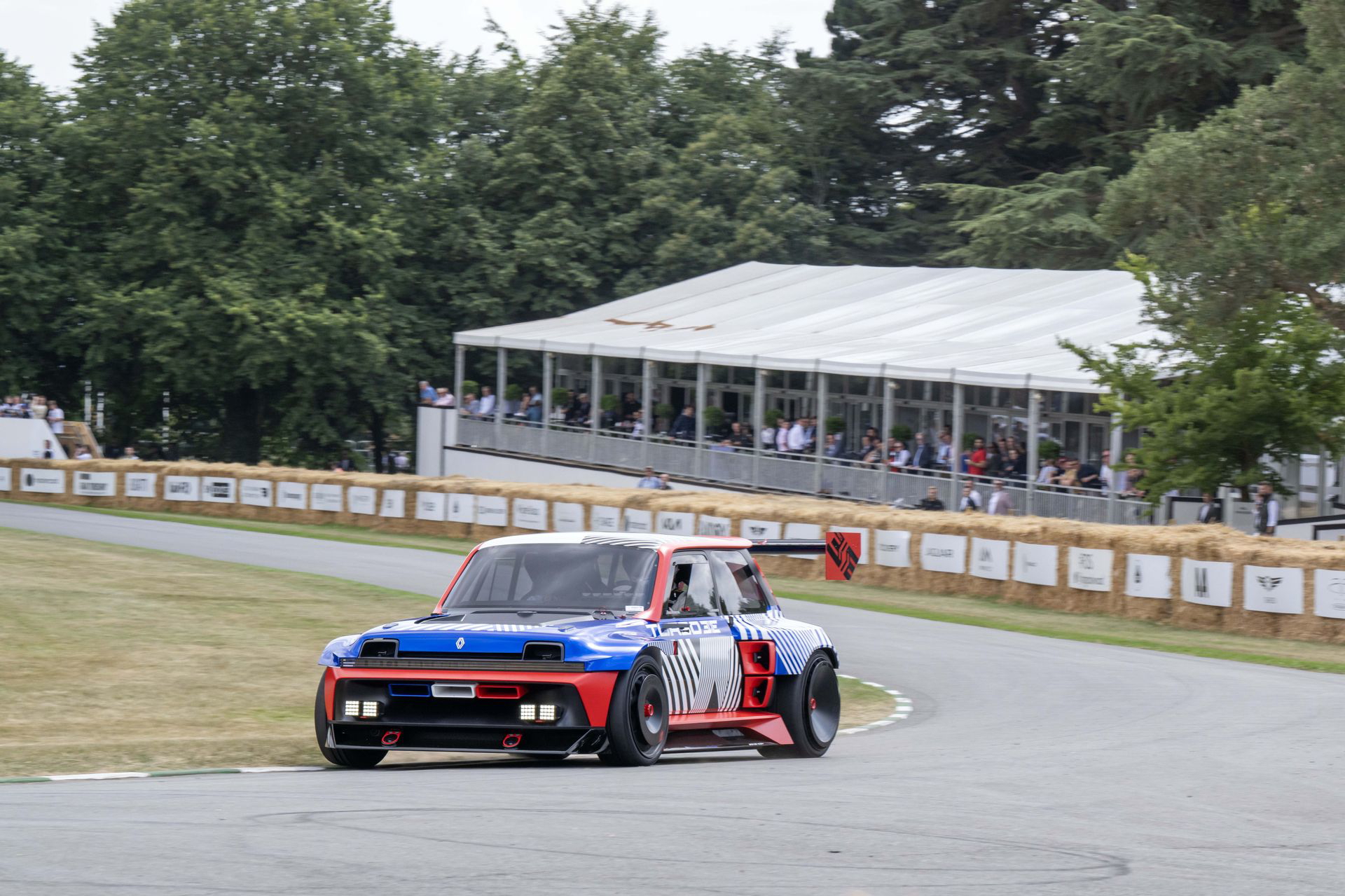 Ese «algo más» es el espectacular Renault Turbo 3E. Este prototipo de estética cyberpunk es un Renault 5 eléctrico de carreras, dotado con un motor de 380 CV, una jaula antivuelco, una aerodinámica de infarto – el alerón es más ancho que el coche – y una carrocería ensanchada hasta los límites de lo posible. Es el equivalente moderno al Renault 5 Turbo «culo gordo». Ya que era el 14 de julio, su librea – creada a medida para Goodwood – tenía los colores de la bandera francesa, también presentes en la pantalla LED frontal del coche.