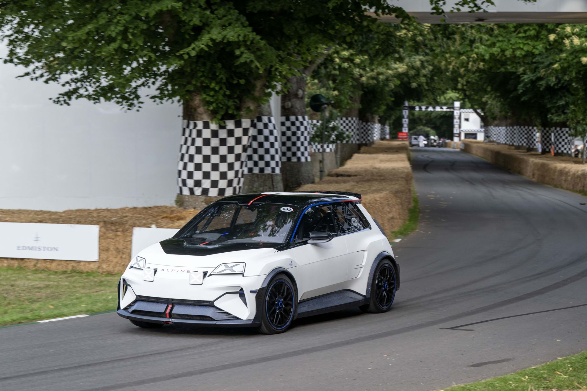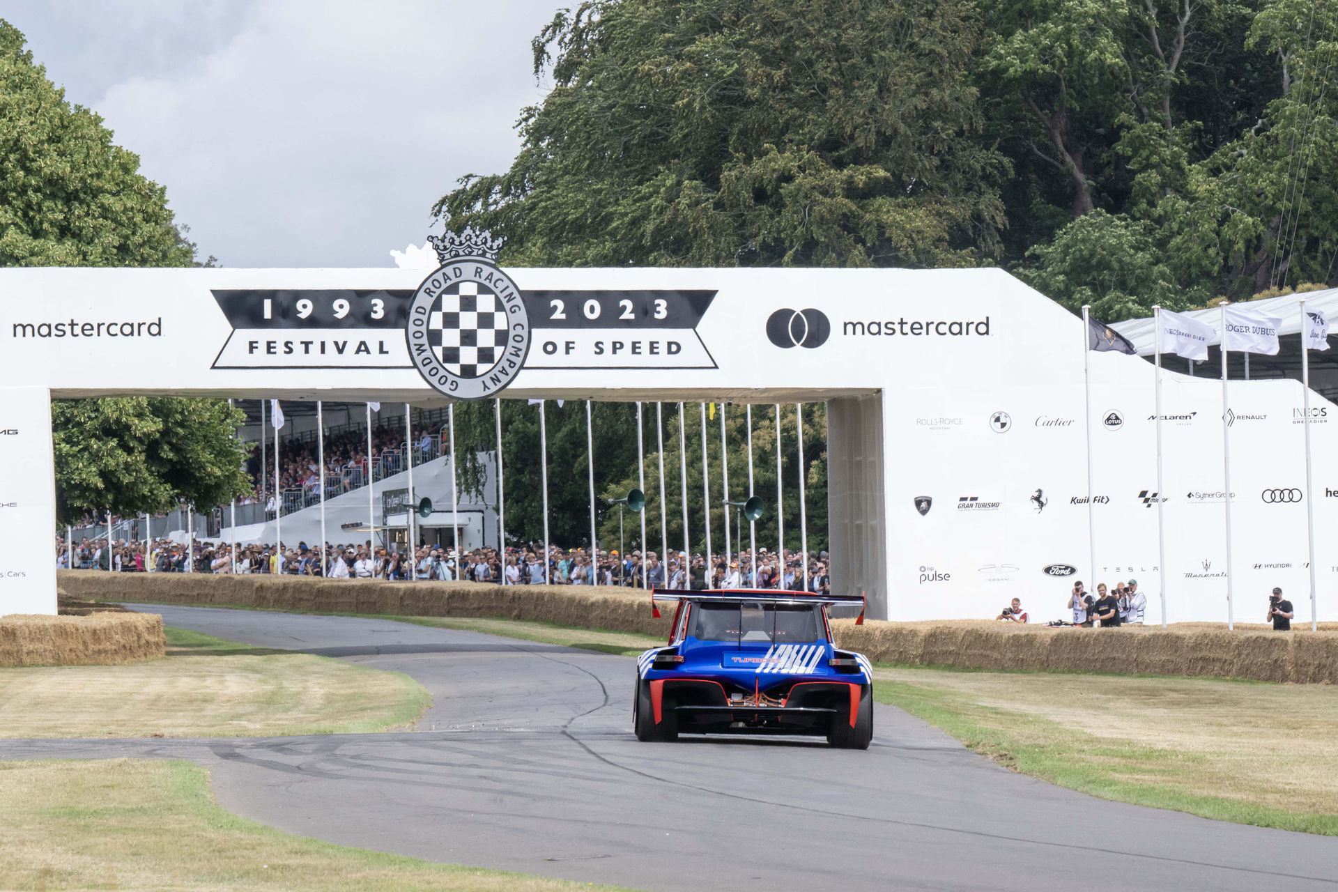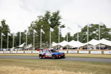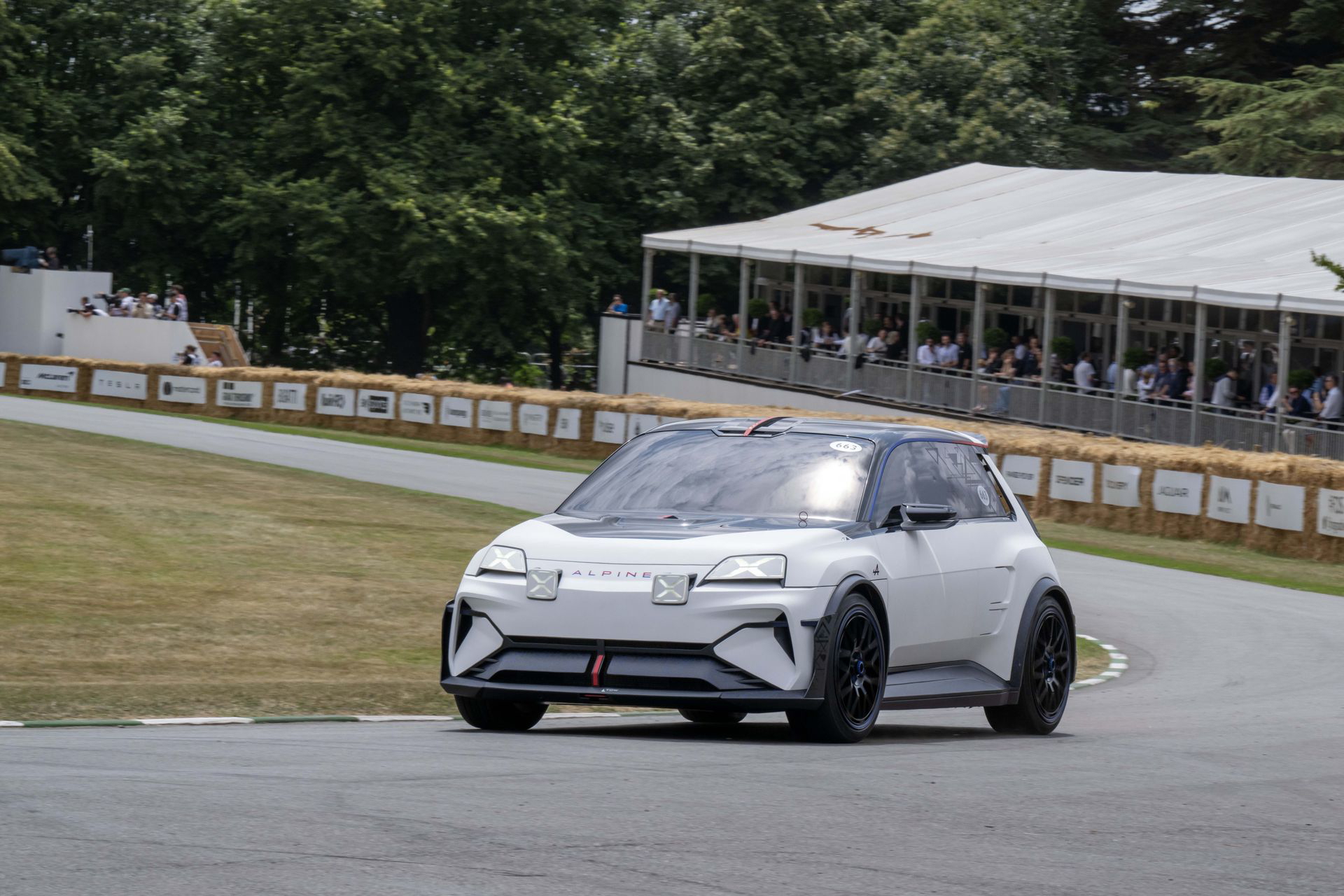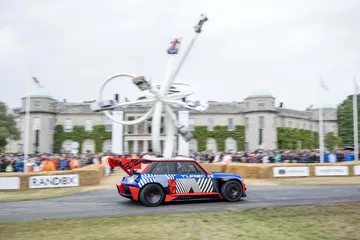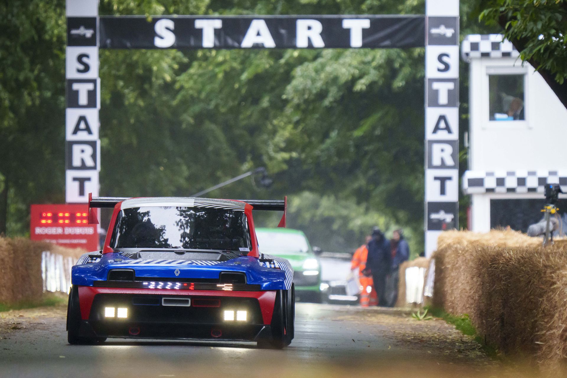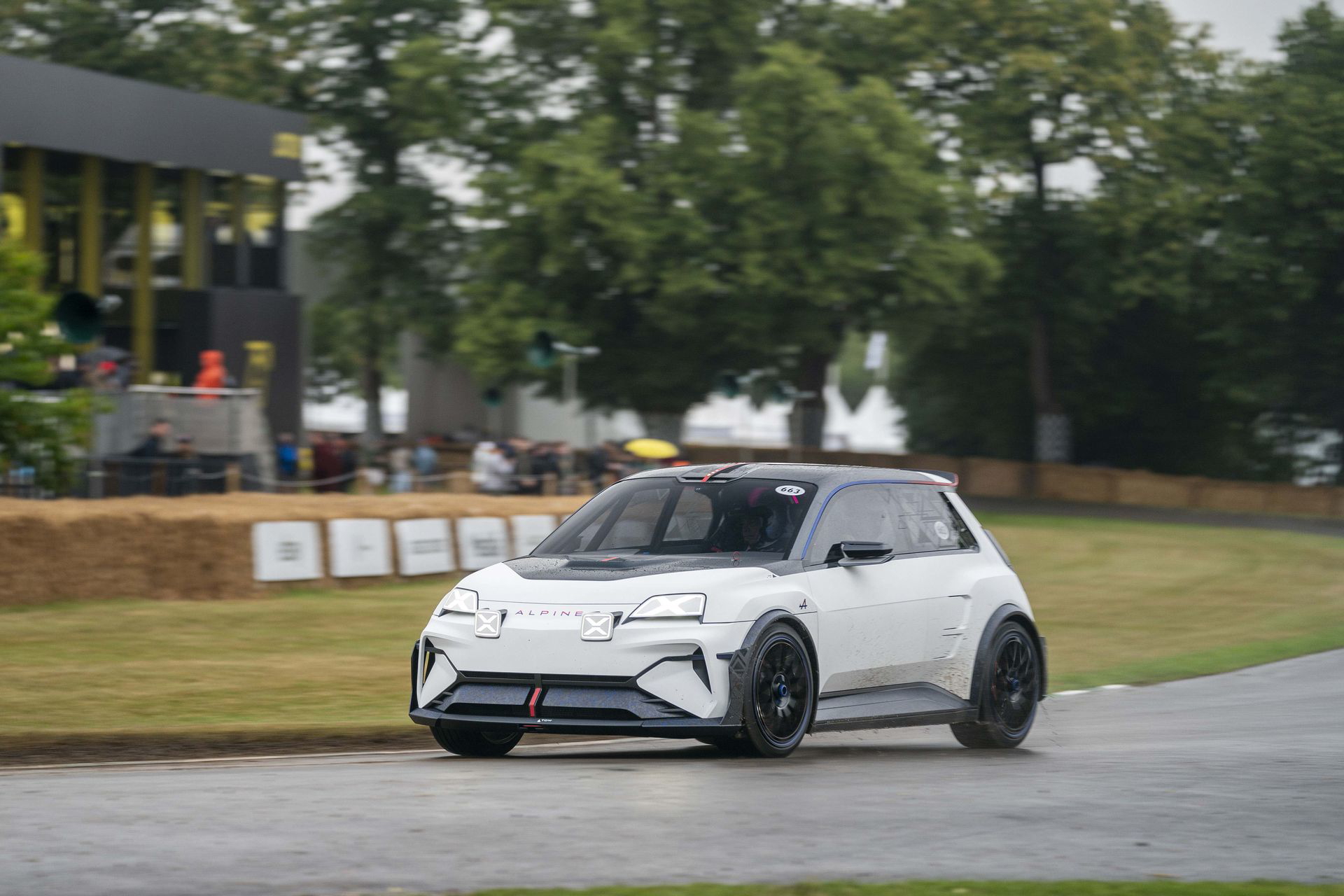 Ese «algo más» es el espectacular Renault Turbo 3E. Este prototipo de estética cyberpunk es un Renault 5 eléctrico de carreras, dotado con un motor de 380 CV, una jaula antivuelco, una aerodinámica de infarto – el alerón es más ancho que el coche – y una carrocería ensanchada hasta los límites de lo posible. Es el equivalente moderno al Renault 5 Turbo «culo gordo». Ya que era el 14 de julio, su librea – creada a medida para Goodwood – tenía los colores de la bandera francesa, también presentes en la pantalla LED frontal del coche.