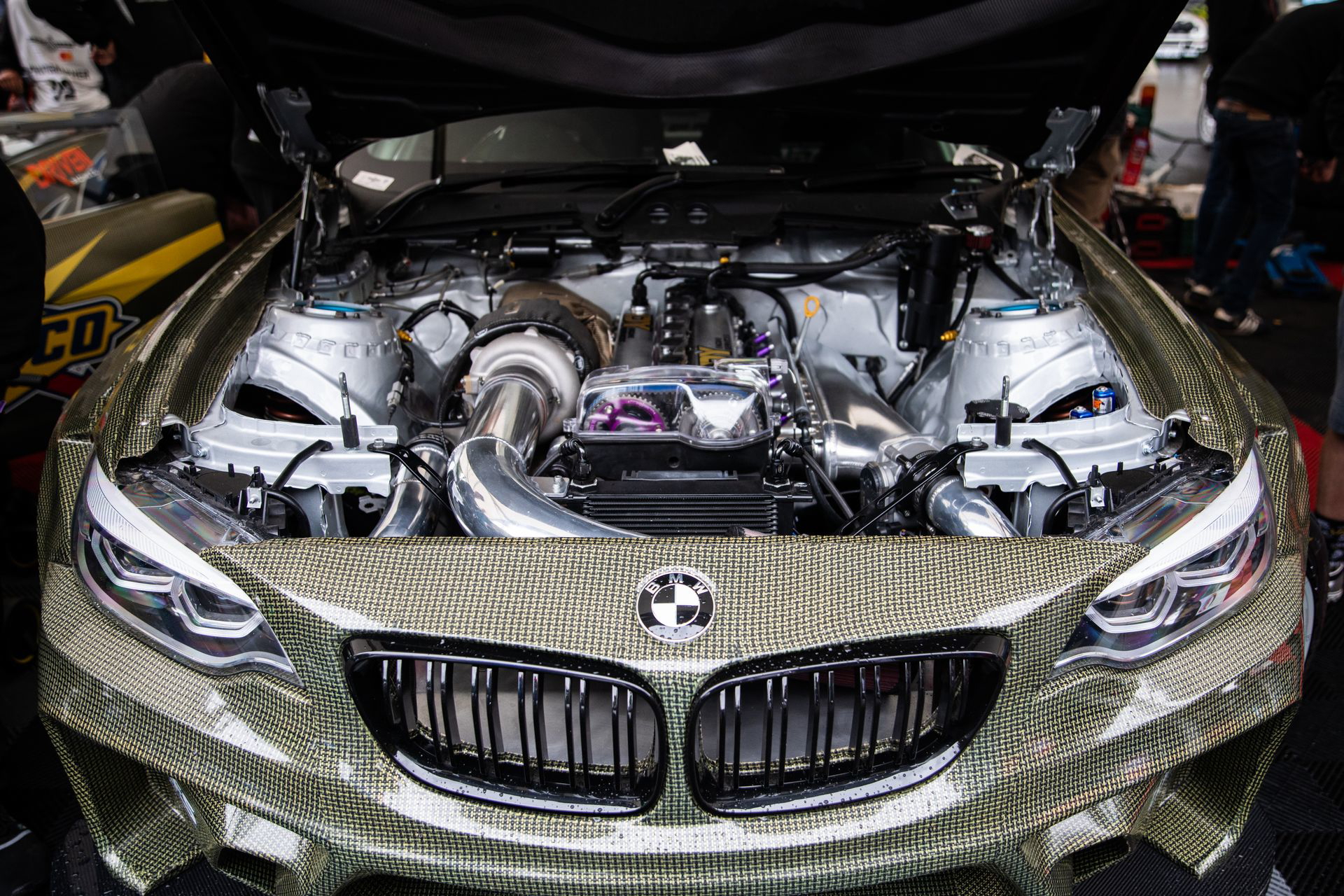 En la misma zona también había algunos coches de drift de altos vuelos. Pudimos contemplar el espectacular Eurofighter de HGK Racing Team – la carcasa de un BMW M2, con un motor 2JZ-GTE de Toyota Supra – o el Rotavette. Un Corvette C6 con un motor rotativo 20B de tres rotores, sobrealimentado por un turbo más grande que mi cabeza, capaz de desarrollar 800 CV con una presión de soplado baja. Mientras hago alguna foto más, comienza a llover de forma molesta. La lluvia no dejaría de acompañarnos durante el resto de la jornada.