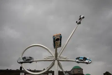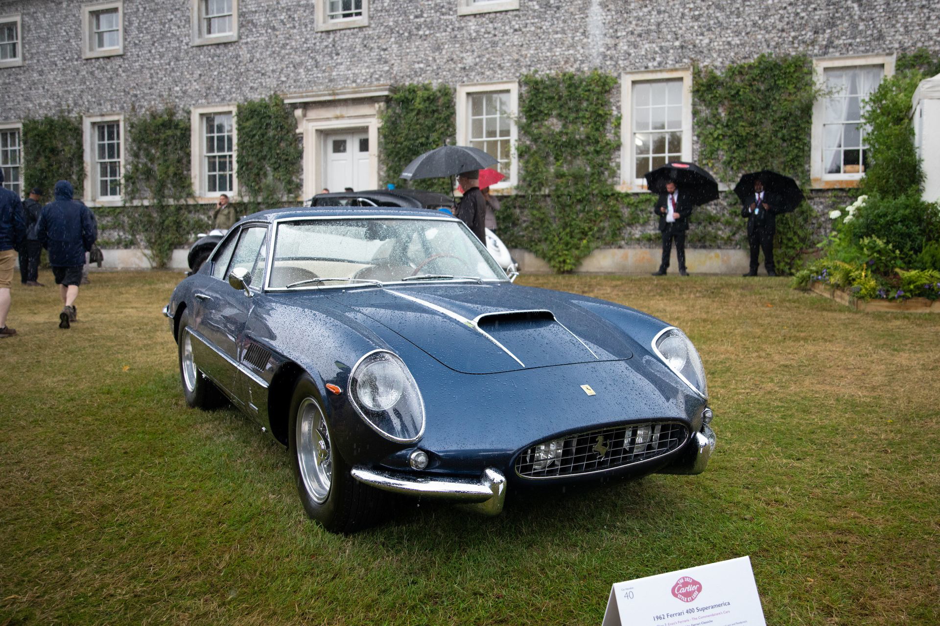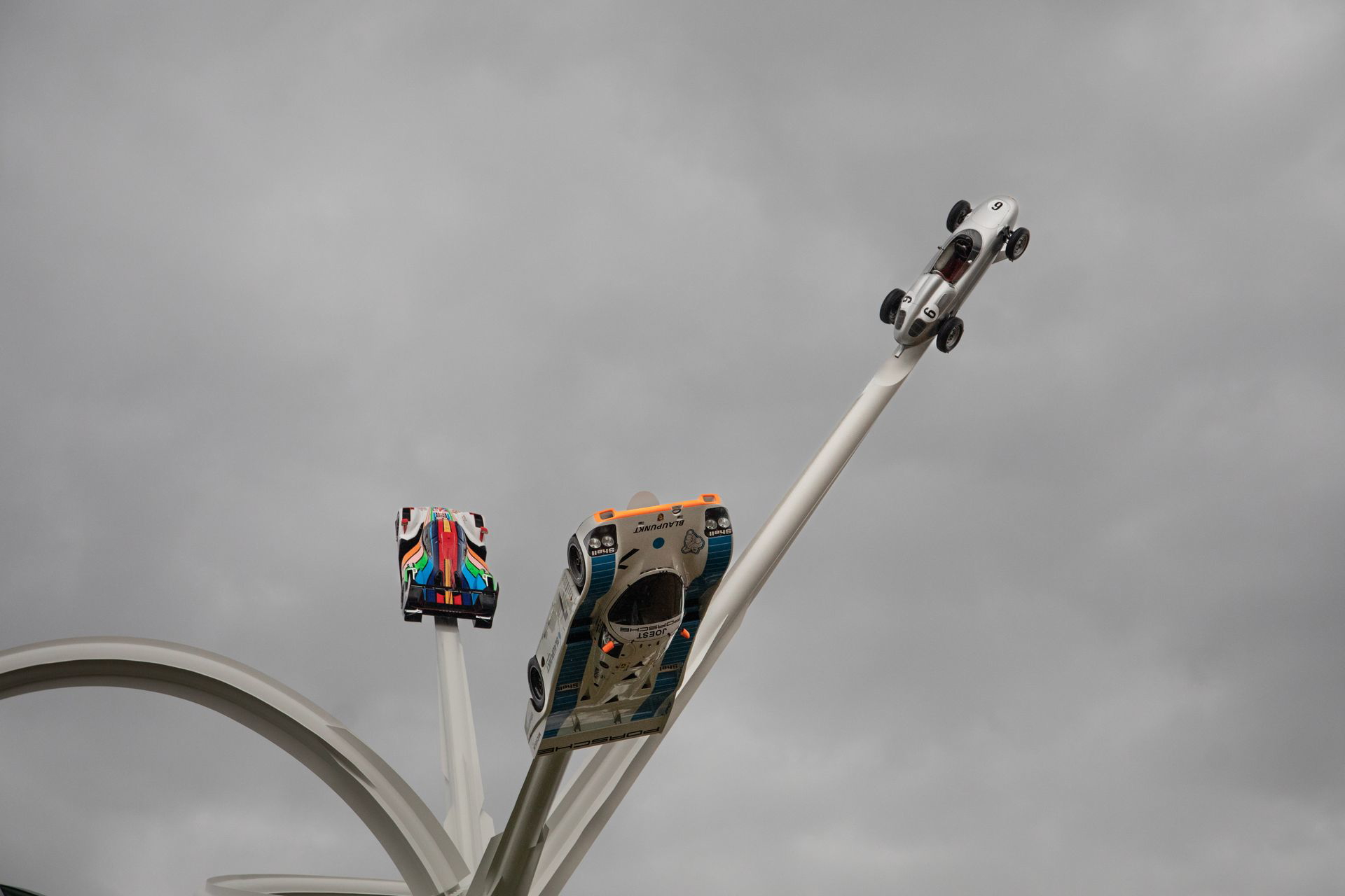 Peleándonos con el paraguas y el viento, pudimos disfrutar durante unas horas más de este evento, tras una breve visita guiada a la Goodwood House, donde se nos explicó la historia de los duques de Richmond. Frente al imponente palacio se alzaba la escultura temática que cada año rinde homenaje a una marca. En este caso, a los 75 años de Porsche. Como curiosidad, los coches que cuelgan de la estructura son reales. No son réplicas o «carcasas» de fibra de vidrio. Están firmemente «cinchados» al esqueleto metálico mediante soportes hechos a medida.