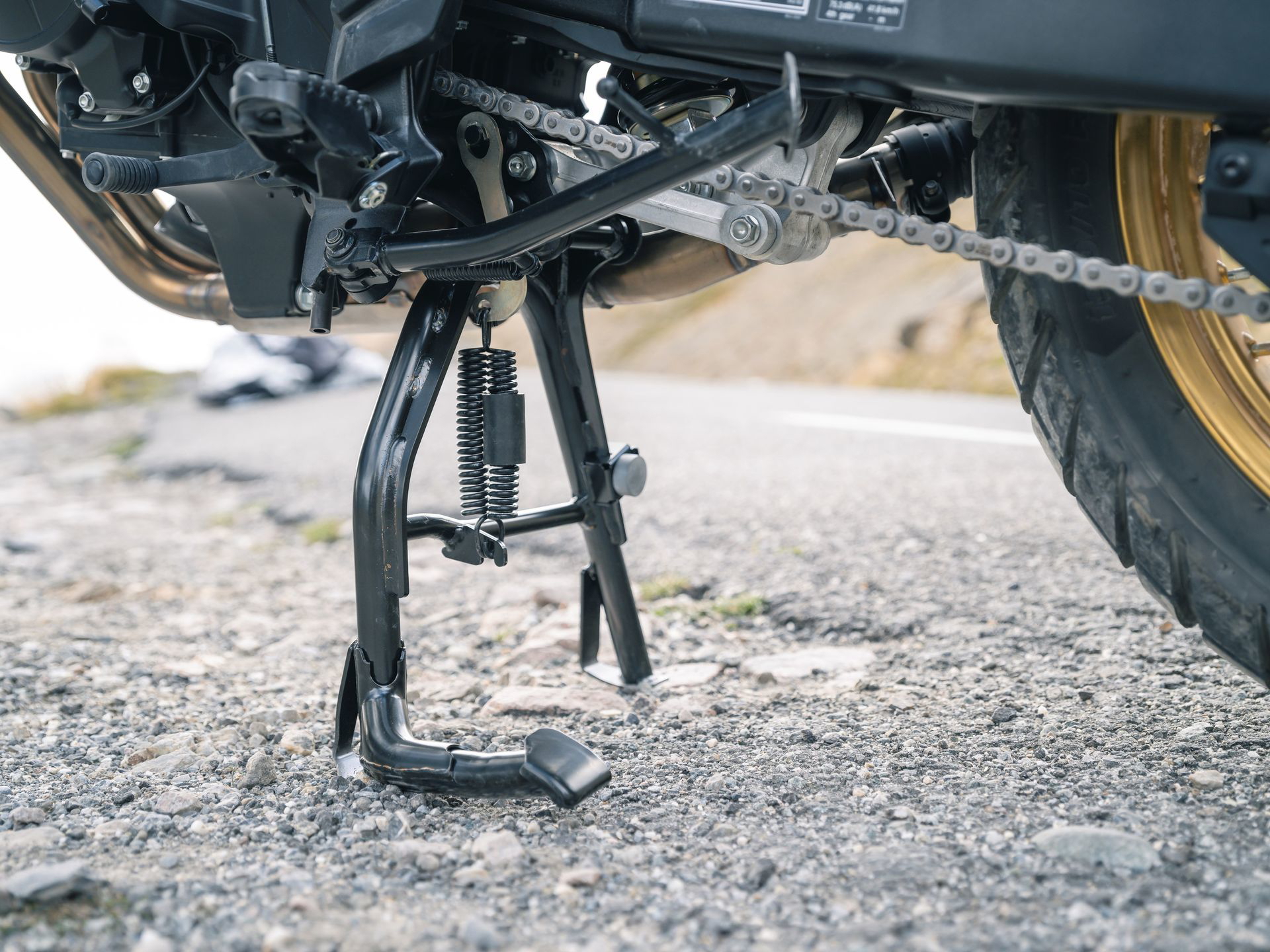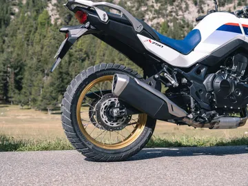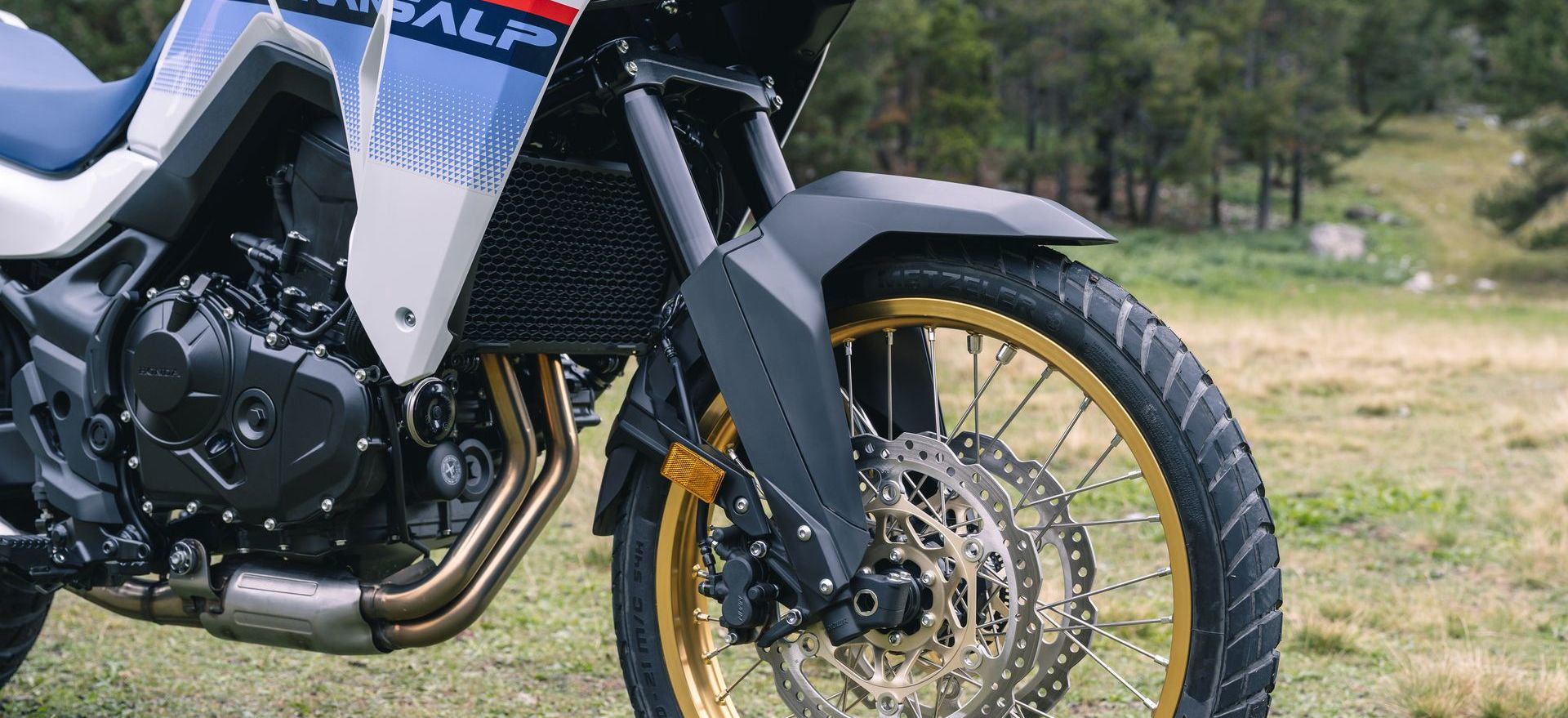En la parte ciclo es donde la Honda Transalp demuestra sus mimbres y revela que también puede enfrentarse a cualquier pista o camino destrozado. Para empezar, tiene llantas asimétricas de radios, de 18 pulgadas detrás y 21 pulgadas delante. Esto demuestra una verdadera vocación todoterreno. Su horquilla invertida delantera es una Showa SFF-CA de 43 mm de diámetro y 200 mm de recorrido, mientras que su amortiguador trasero es un sistema Pro-link con 190 mm de recorrido. A ello se suman 212 mm de altura libre al suelo – un dato elevado – y la posibilidad de dotar a la moto con todo tipo de protecciones para chasis y mecánica. El equipo de frenado también está a la altura.