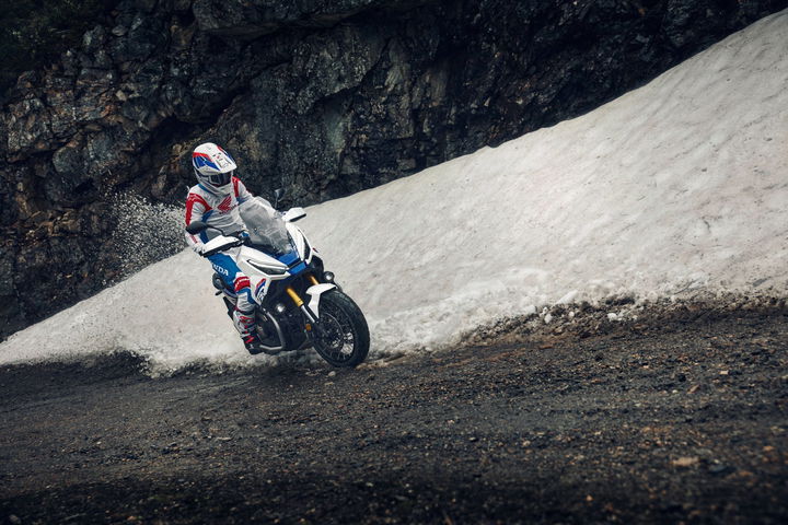 Su propuesta todoterreno es algo más que atrezo. Honda ha dispuesto un conjunto de suspensiones y frenos propios de una trail de verdad, con una horquilla invertida de 41 mm y recorrido de 153,5 mm, monoamortiguador trasero con basculante Pro-Link y recorrido de 150 mm, y doble disco delantero de 296 mm con pinzas de cuatro pistones. La parte ciclo se completa con neumáticos mixtos (17” delante, 15” detrás) y ABS de doble canal.