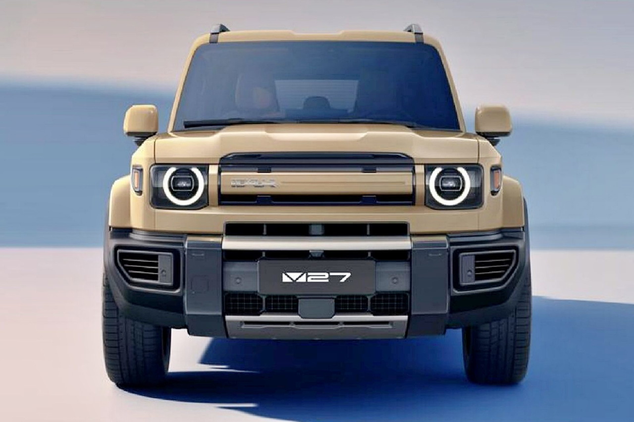Como decíamos, el iCaur V27 es el modelo de mayor tamaño de la marca china, subiendo un escalón respecto a los 03 y V23. Hablamos de un SUV de 5 metros de largo, 1,98 de ancho y 1,89 de alto, similar a un Range Rover en cuanto a dimensiones. Y en cuanto a diseño, ya lo estáis viendo: visto de frente, es imposible no pensar en un Defender y en otras perspectivas recuerda al Land Cruiser 250.