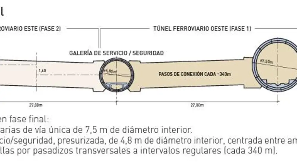 Este pasaría a convertirse en el túnel ferroviario oeste cuando se comience la segunda fase, que supondrían la construcción de otros dos túneles. El principal sería un gemelo del primero, el túnel ferroviario este, con un diámetro de 7,5 metros. Y entre ambos habría un túnel de servicio y mantenimiento de 4,8 metros de diámetro, que estaría a 27 metros de ambos, y que contaría con conexiones de servicio a ambos túneles cada 340 metros.