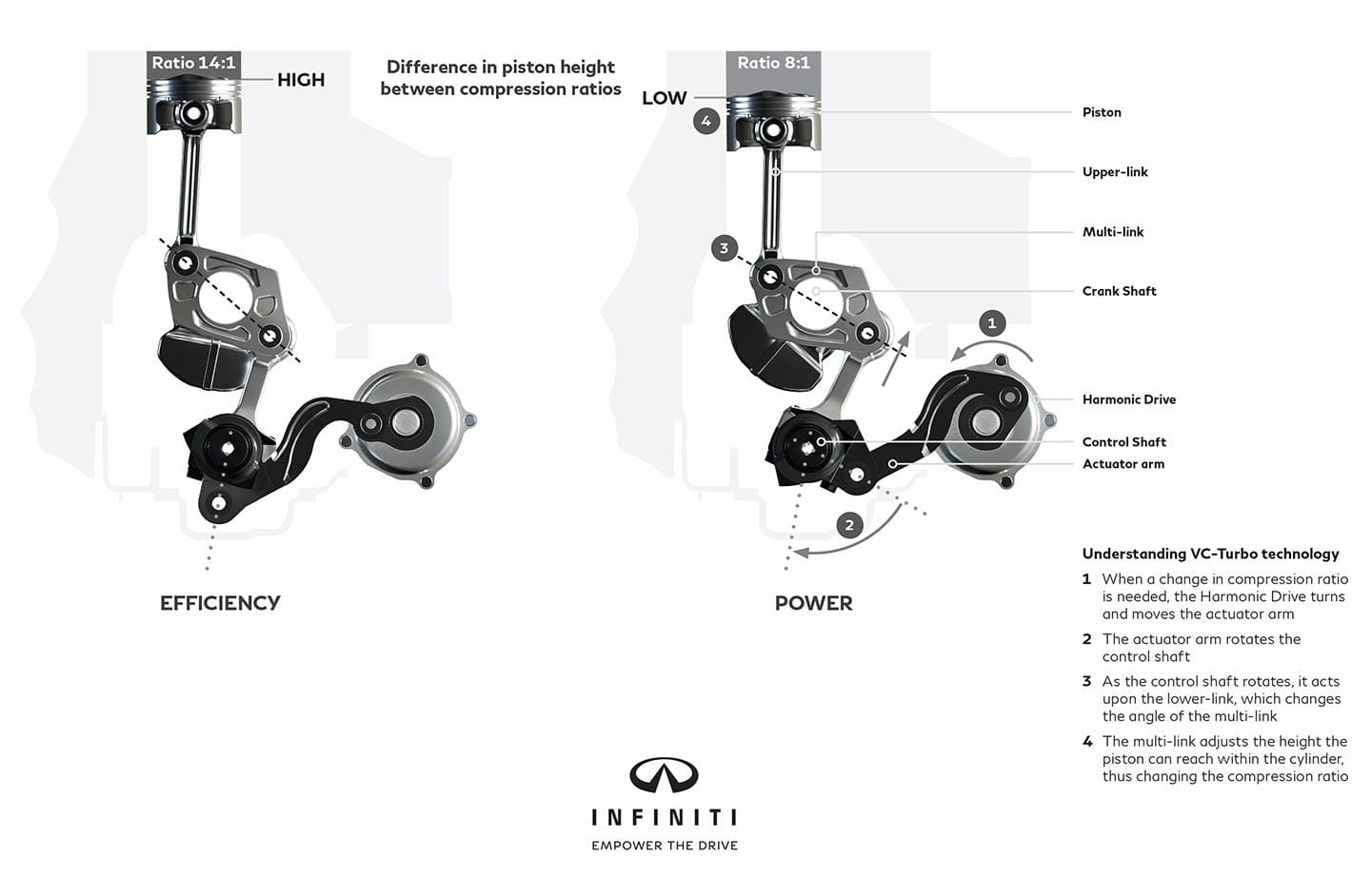 La relación de compresión influye drásticamente en el rendimiento de un motor, y el motor de Infiniti ha conseguido ajustar el pistón en diferentes posiciones, para variar esa relación de compresión, con un brazo actuador y un eje de control que denominan Harmonic Drive.
