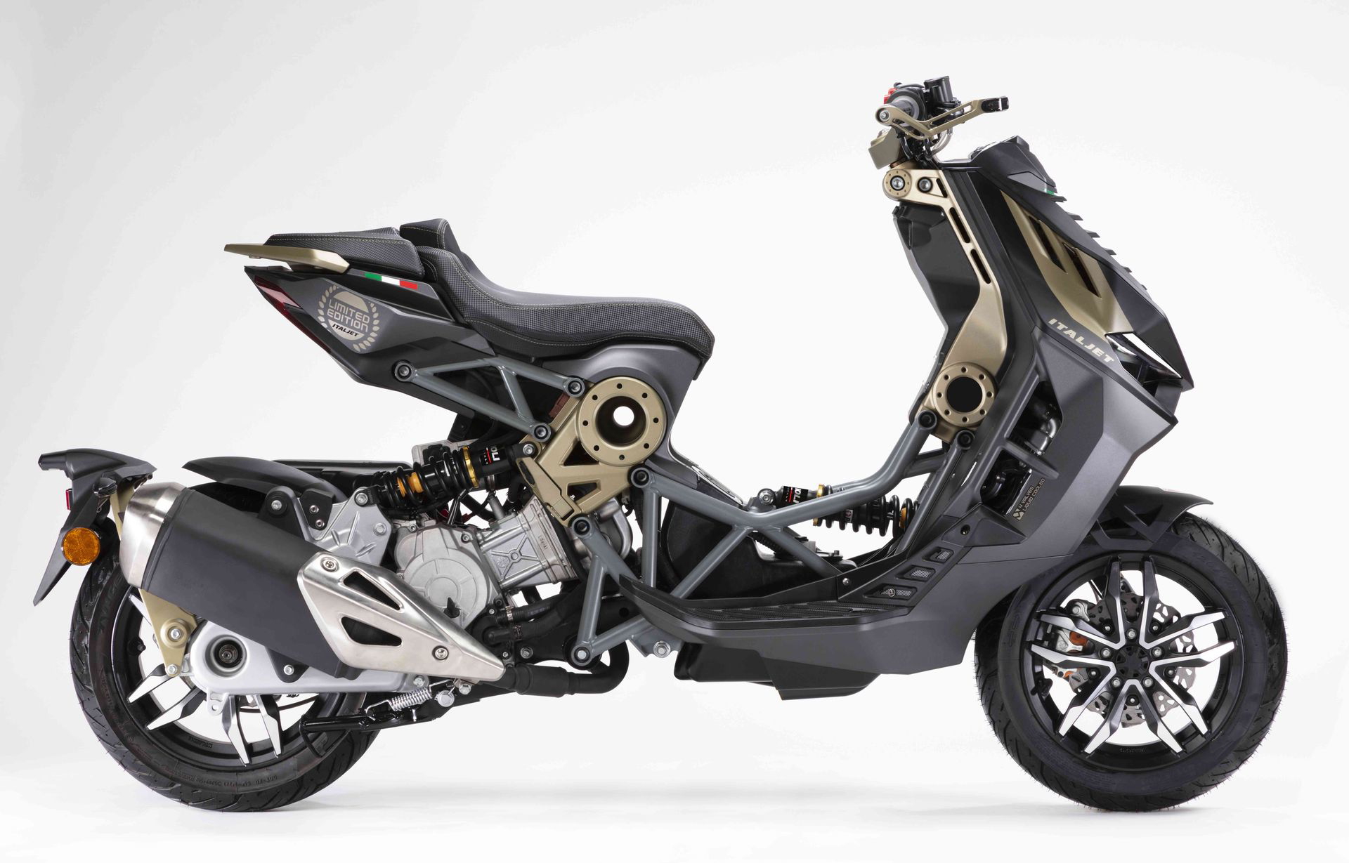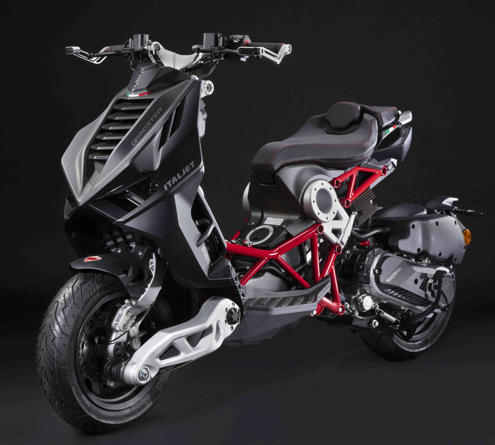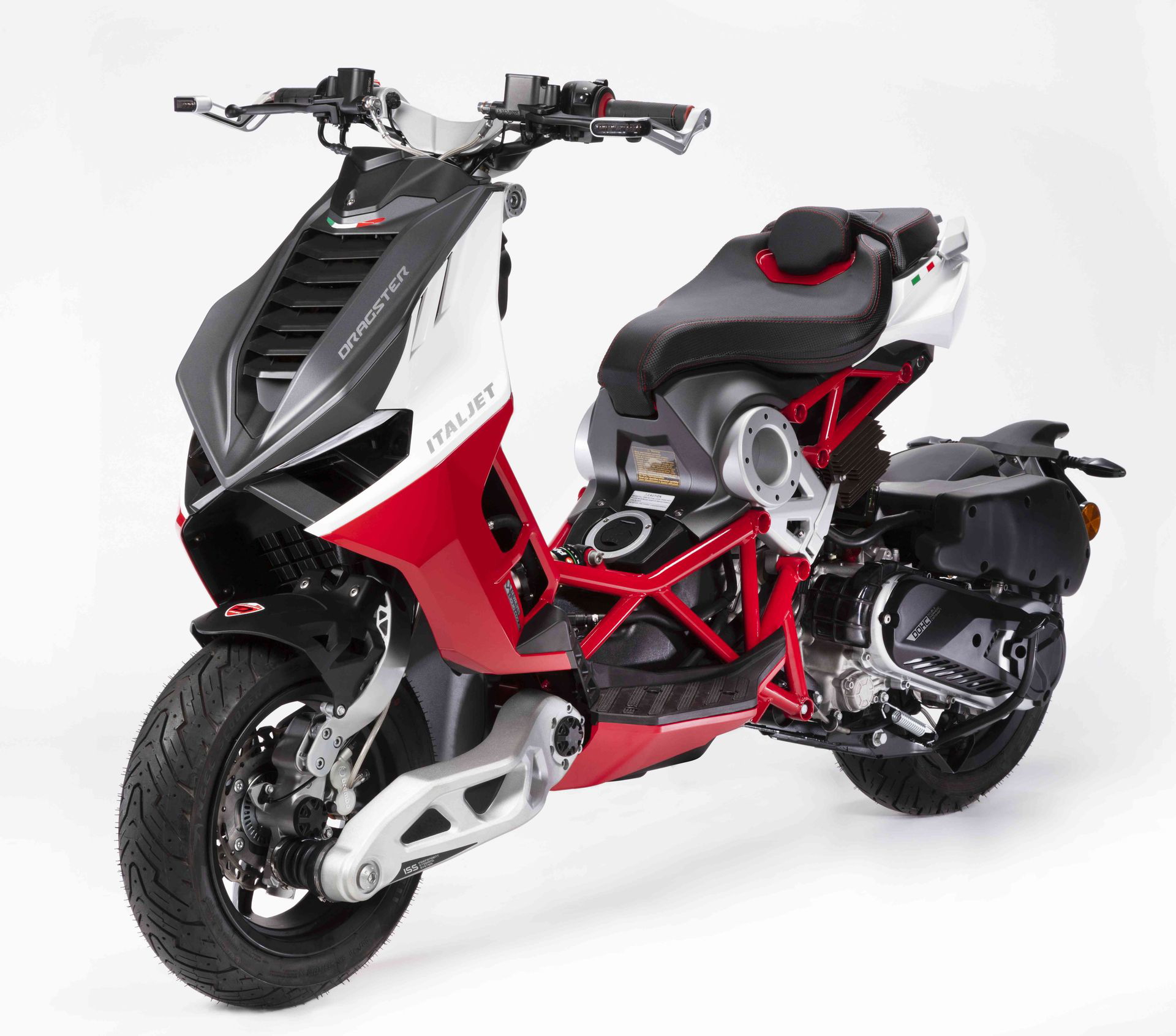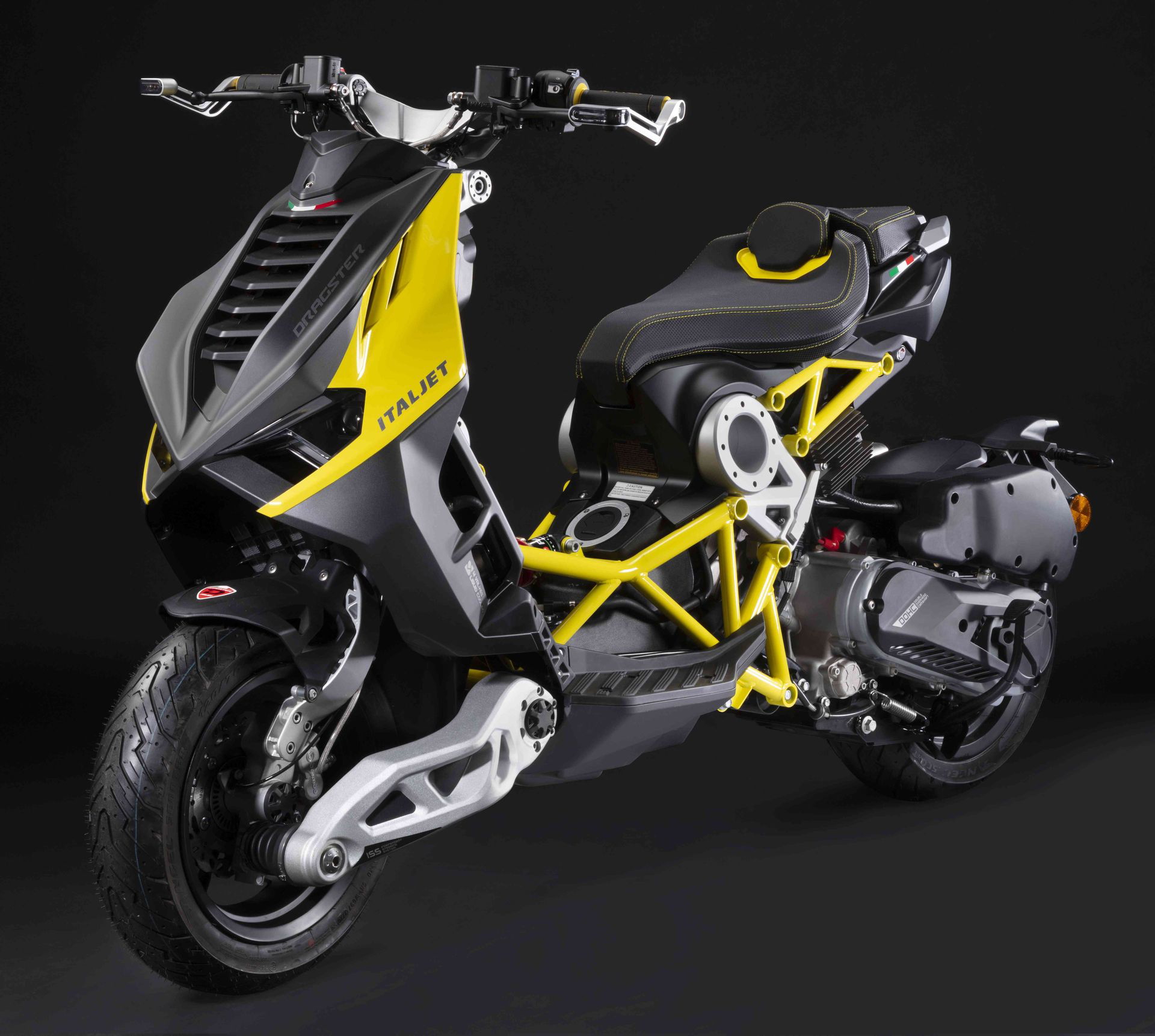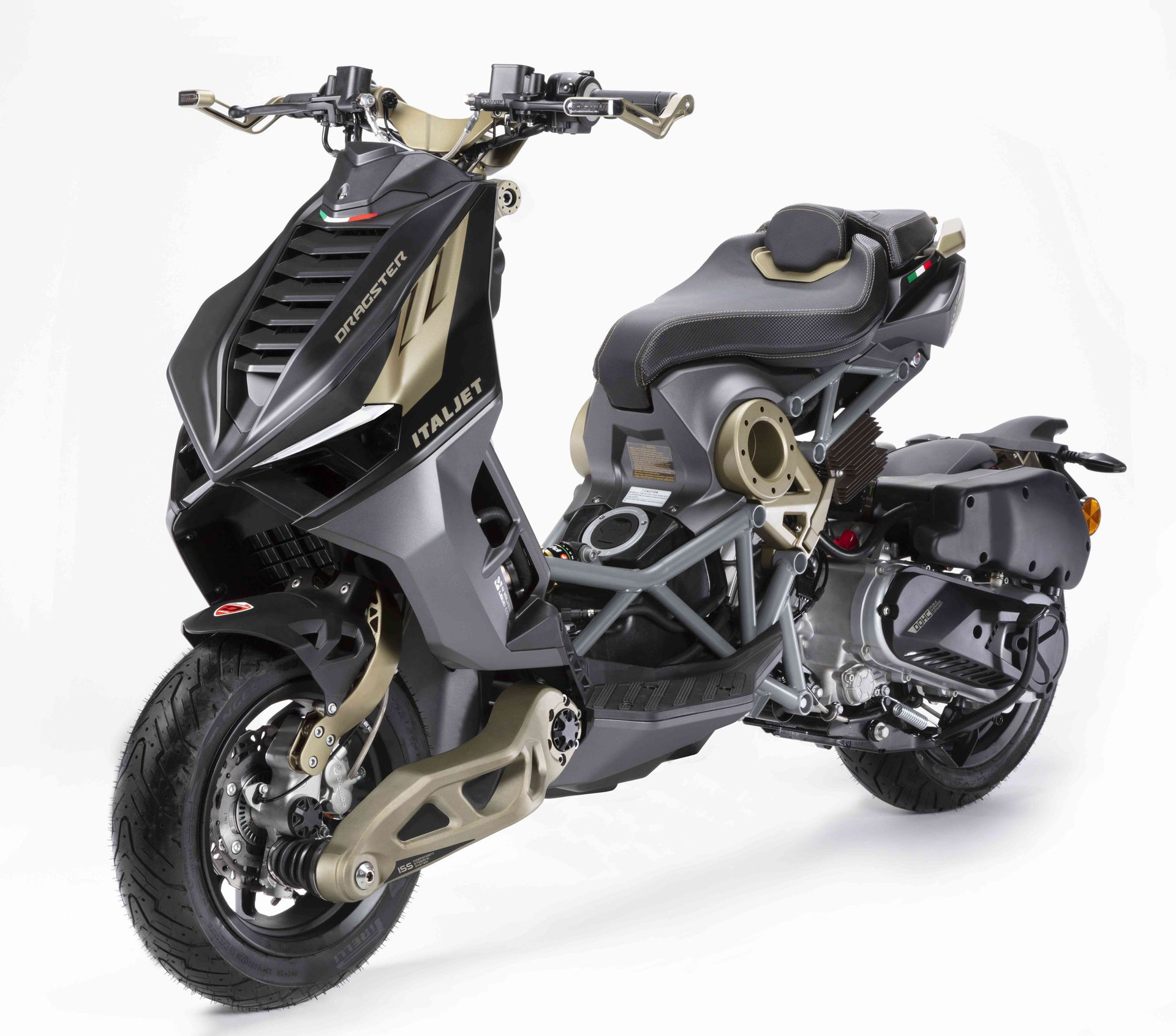 La moto es la Italjet Dragster. Es posible que no conozcas este fabricante de motos de origen italiano. Es un fabricante de bajo volumen afincado en Bolonia, la casa de marcas como Ducati o fabricantes de superdeportivos como Lamborghini o Ferrari. En la «comarca del motor», Italjet produce únicamente la Dragster. Es una scooter, y aunque podemos circular con ella legalmente por carretera y conducirla con el carnet B de coche, es una moto que es habitualmente modificada y personalizada para su uso en circuito y en las competiciones de scooter.
