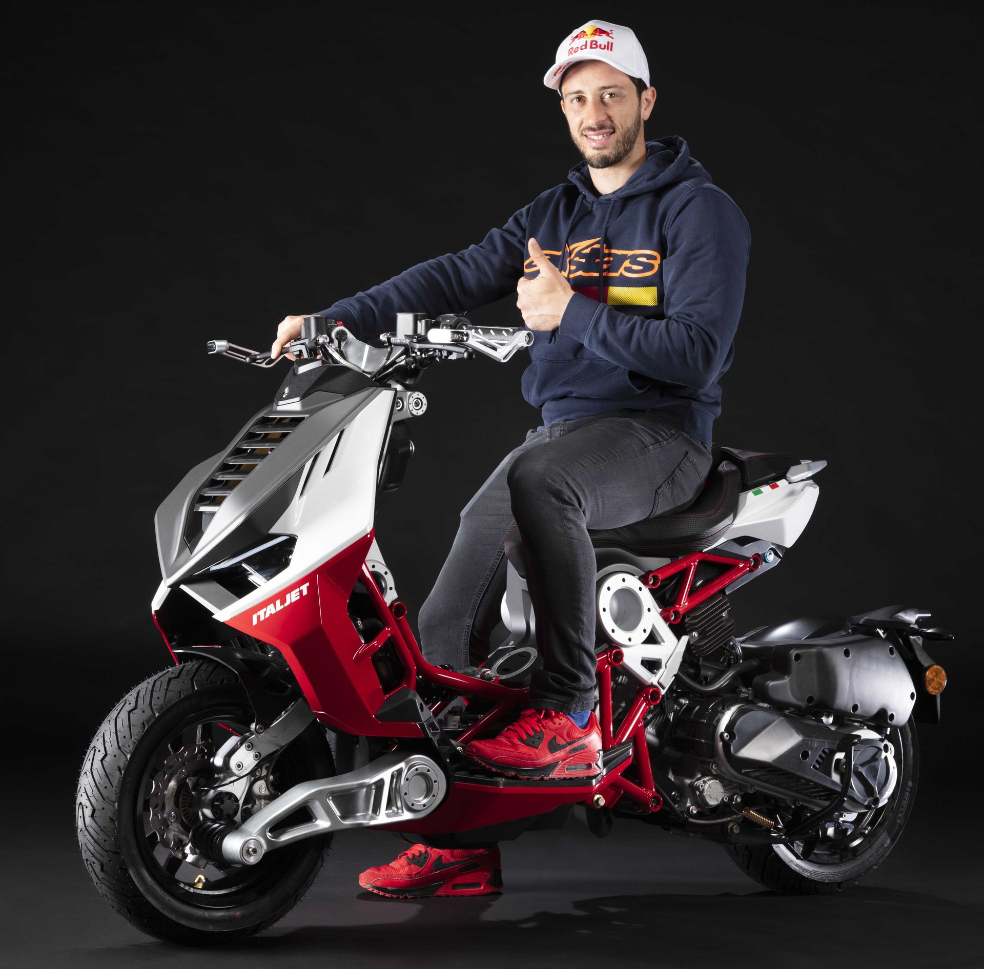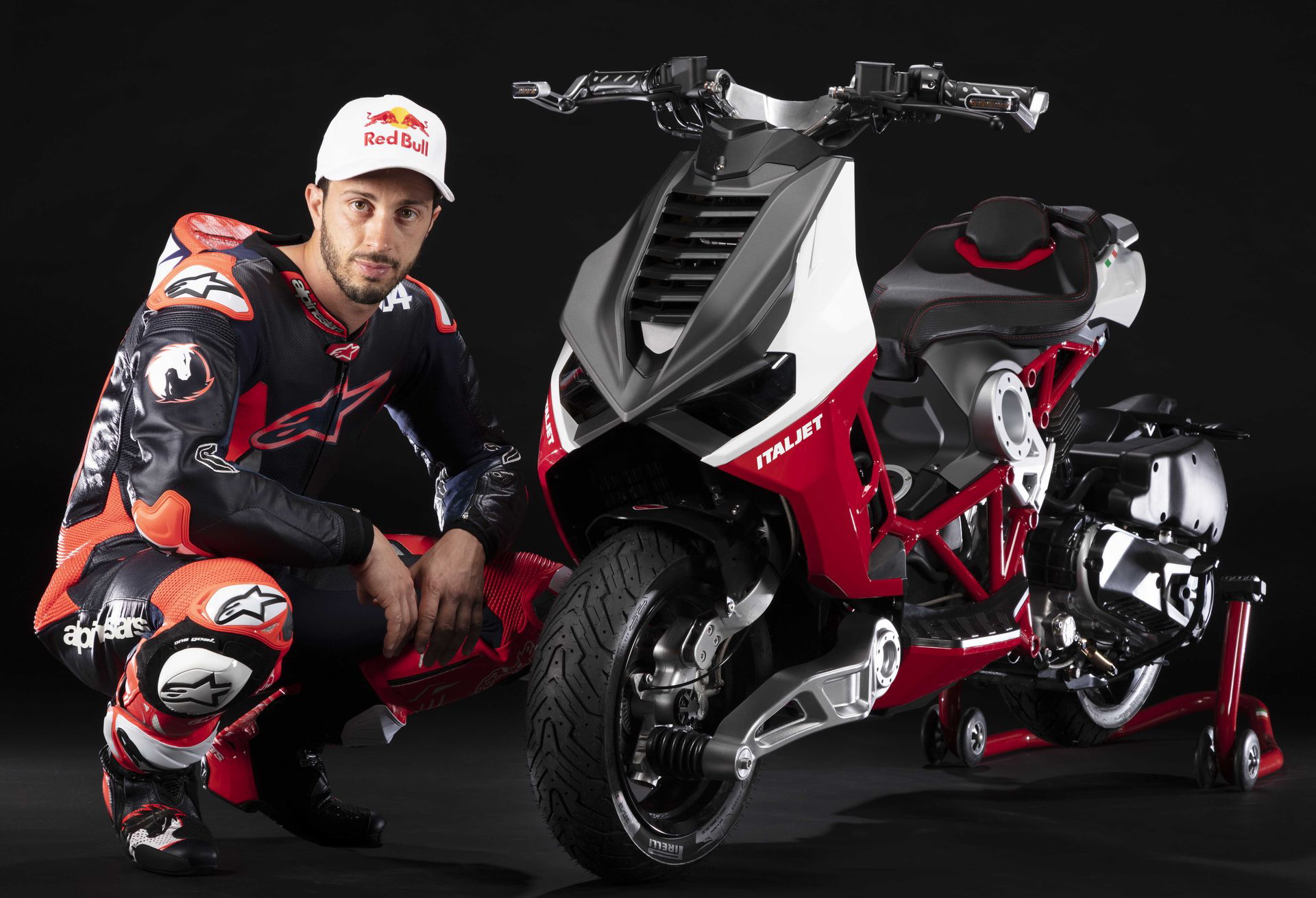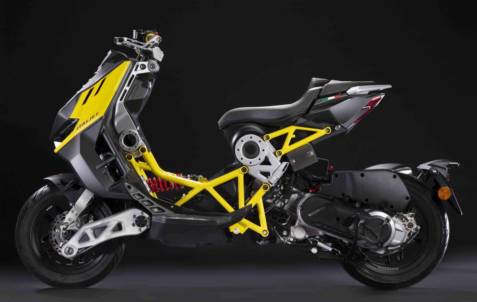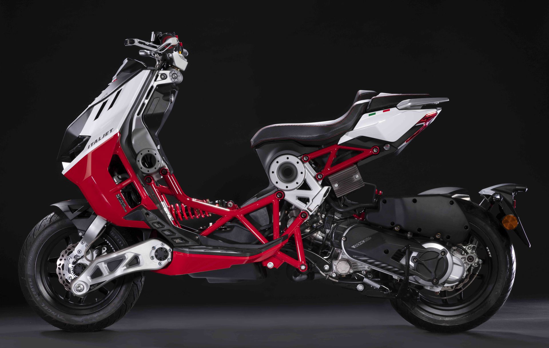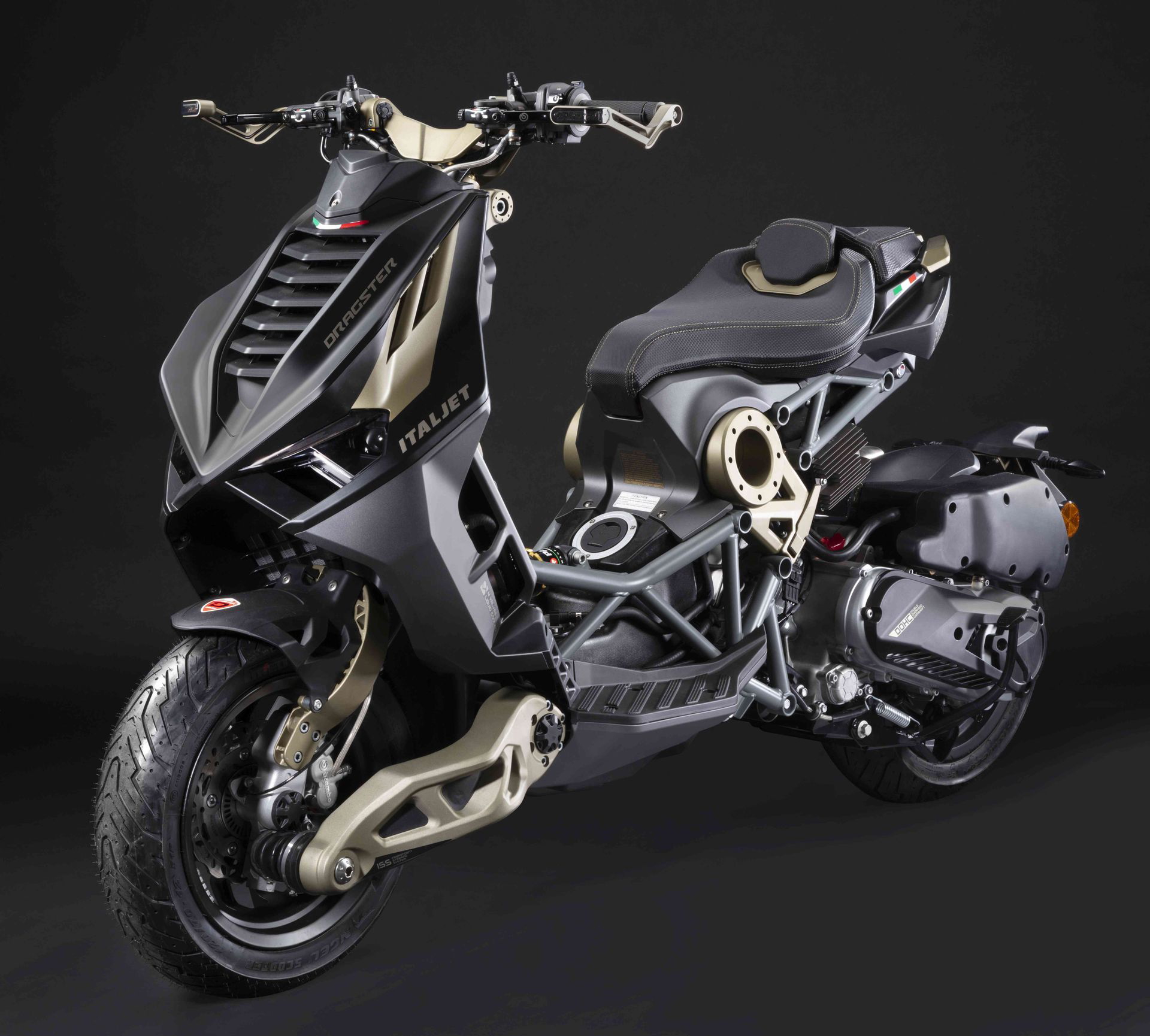 La moto es la Italjet Dragster. Es posible que no conozcas este fabricante de motos de origen italiano. Es un fabricante de bajo volumen afincado en Bolonia, la casa de marcas como Ducati o fabricantes de superdeportivos como Lamborghini o Ferrari. En la «comarca del motor», Italjet produce únicamente la Dragster. Es una scooter, y aunque podemos circular con ella legalmente por carretera y conducirla con el carnet B de coche, es una moto que es habitualmente modificada y personalizada para su uso en circuito y en las competiciones de scooter.