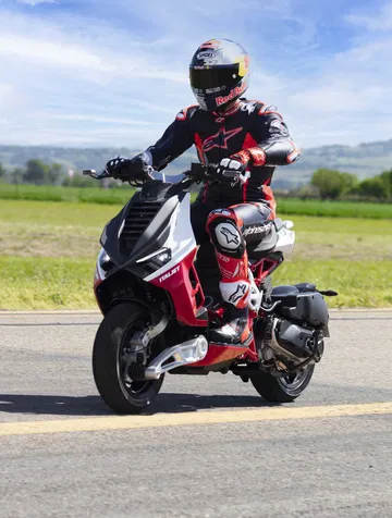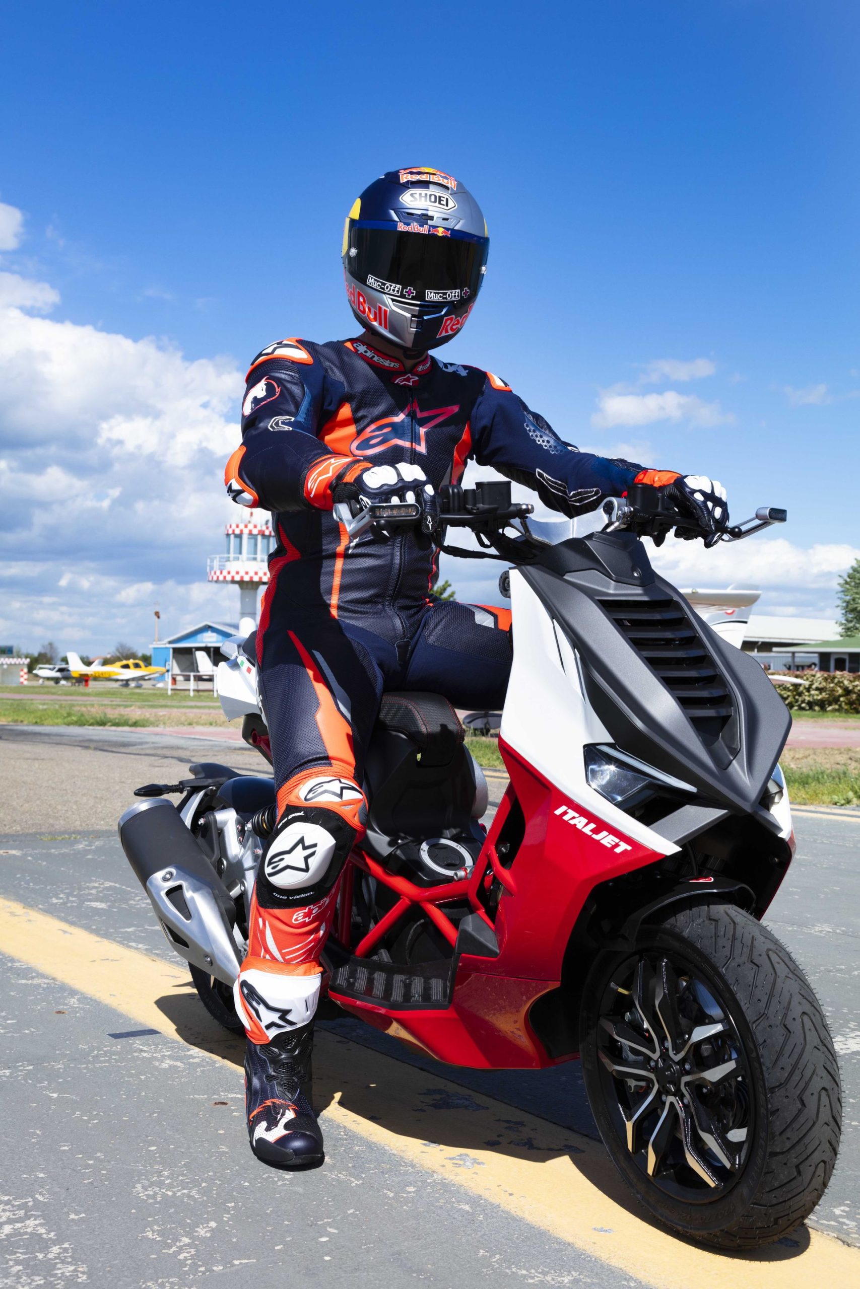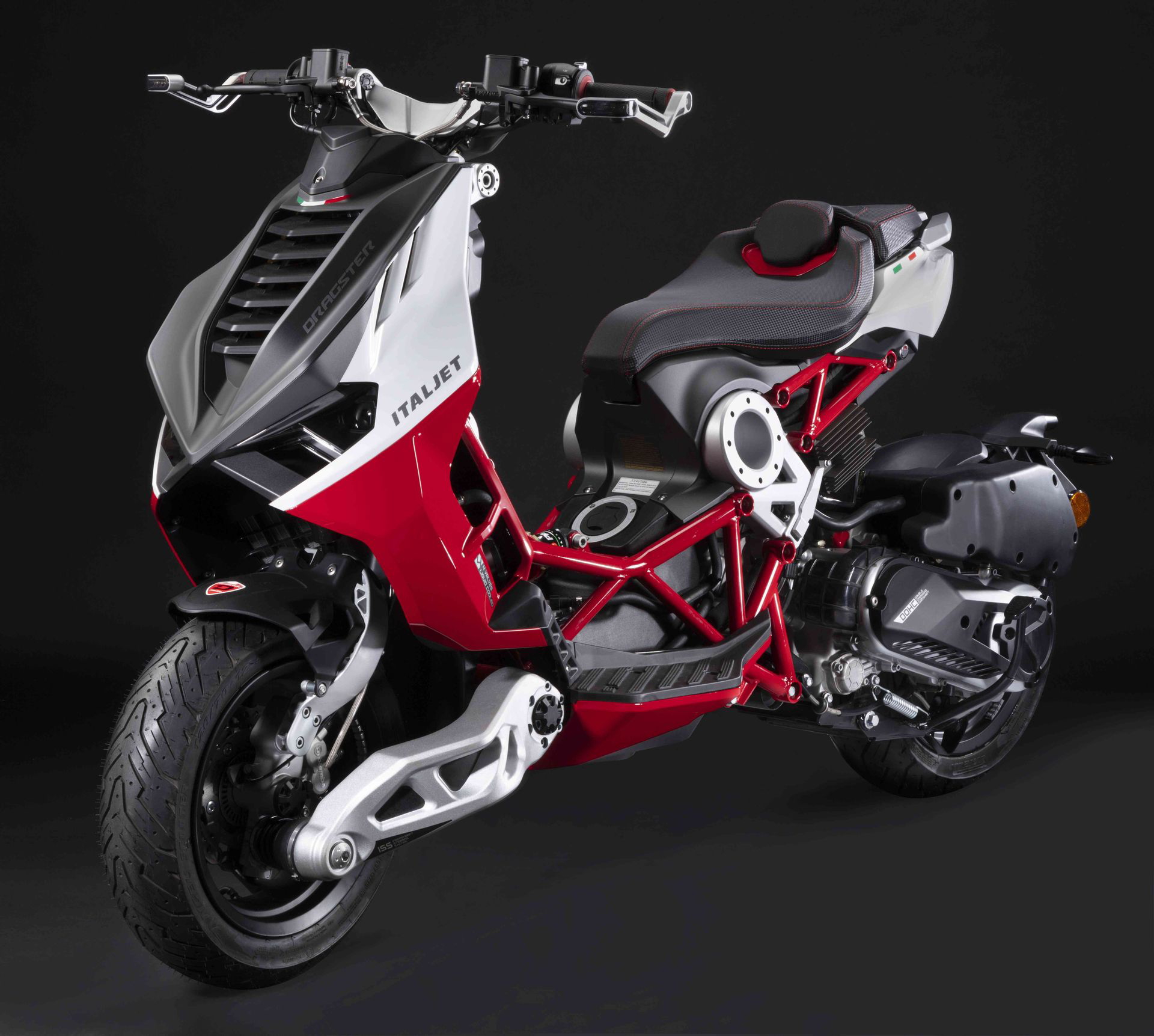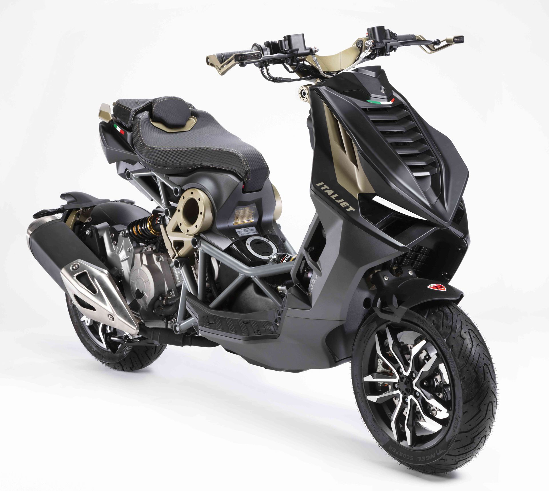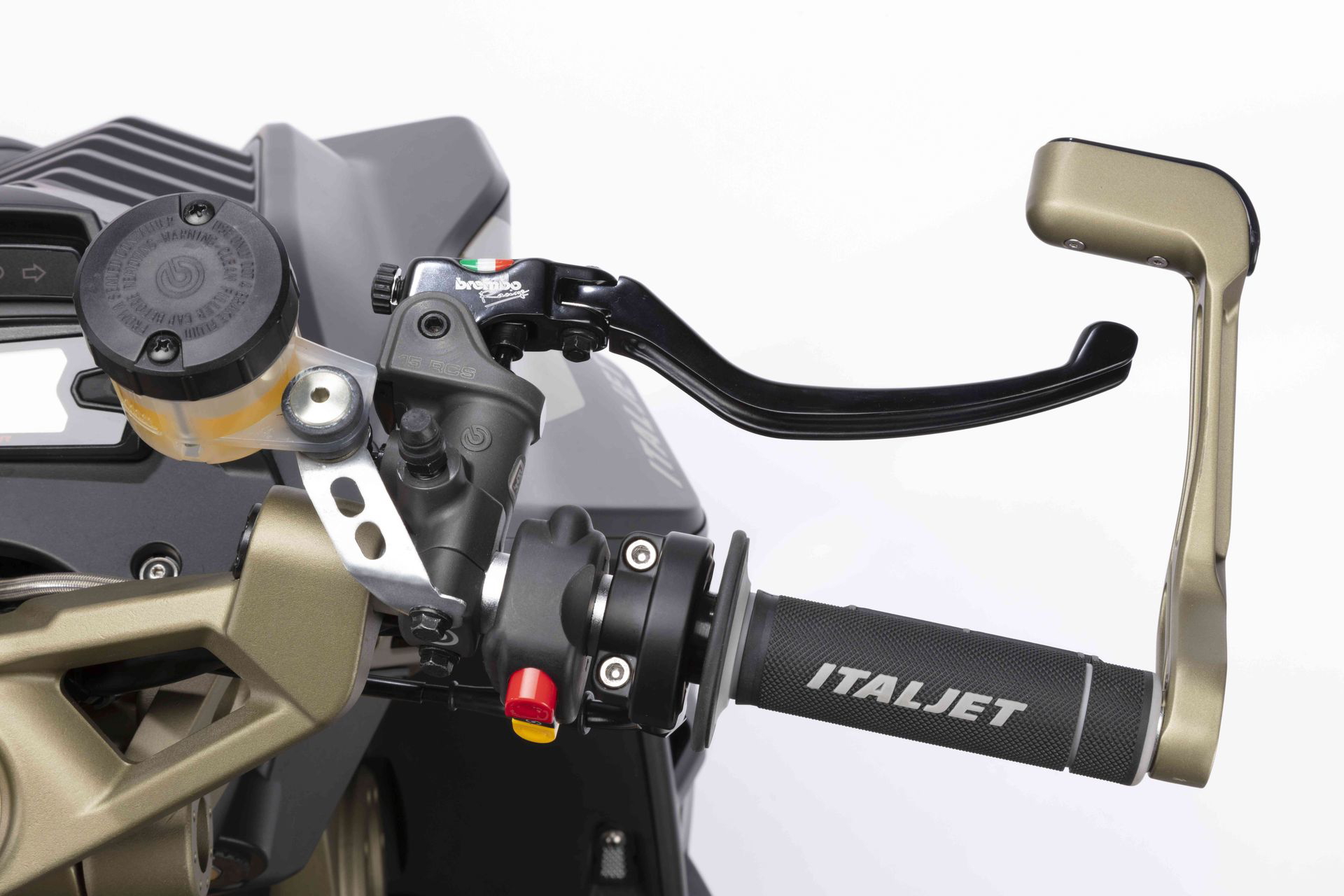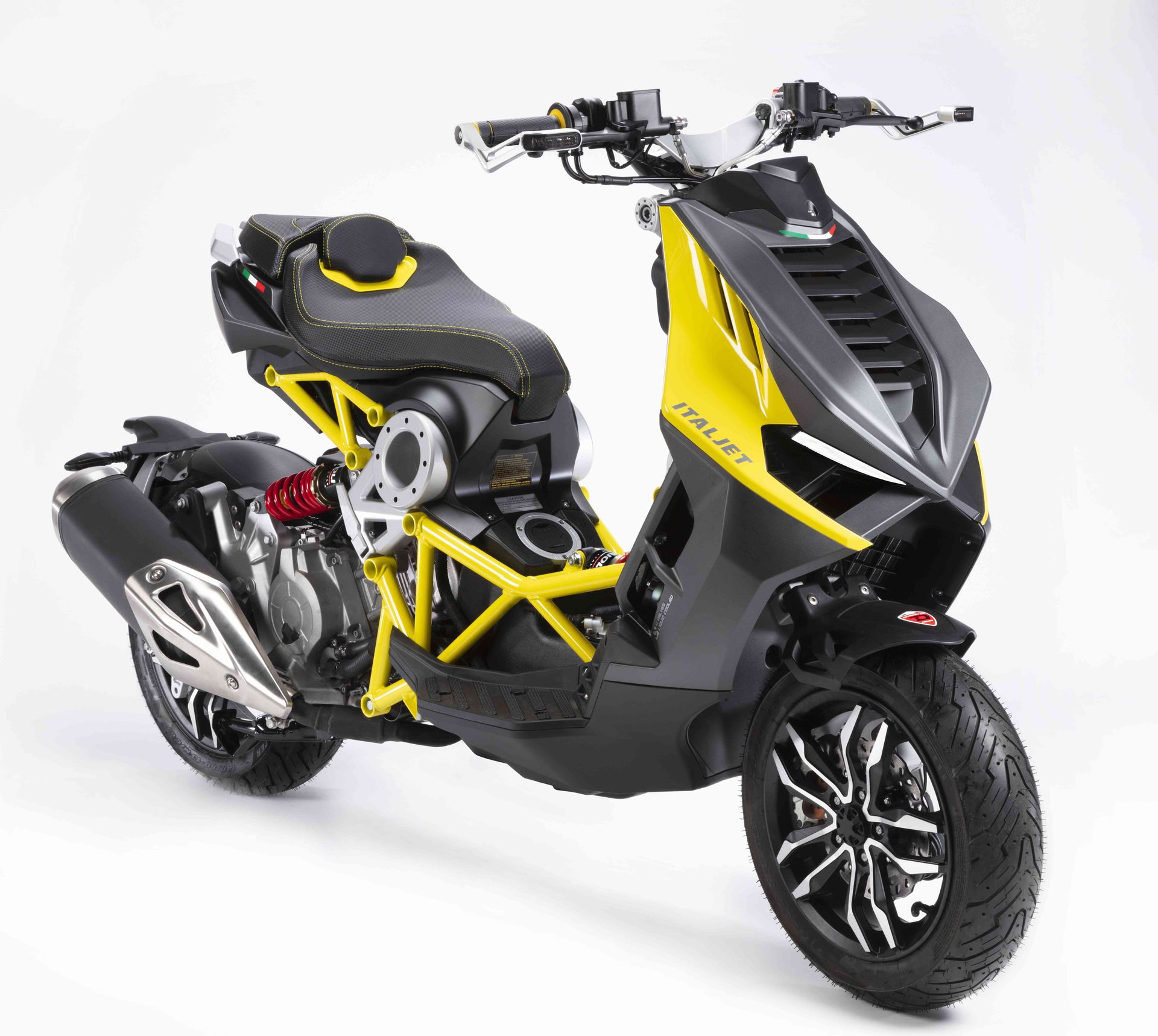 Tiene un solo cilindro, cuatro válvulas y refrigeración líquida. Desarrolla 12,5 CV a 9.500 rpm, pero con muy pocas modificaciones, procedentes de la línea Power Parts de Italjet, este motor puede ponerse muy fácilmente en los 15 CV que limita el carnet A1. El equipo de frenado cuenta con ABS y discos de freno en ambos ejes. Puede no impresionar que el disco delantero tenga solo 200 mm de diámetro, pero hay que recordar que la rueda delantera tiene 12 pulgadas, y la trasera, 13. La rueda pequeña no es casualidad, busca maximizar la agilidad y el paso por curva.