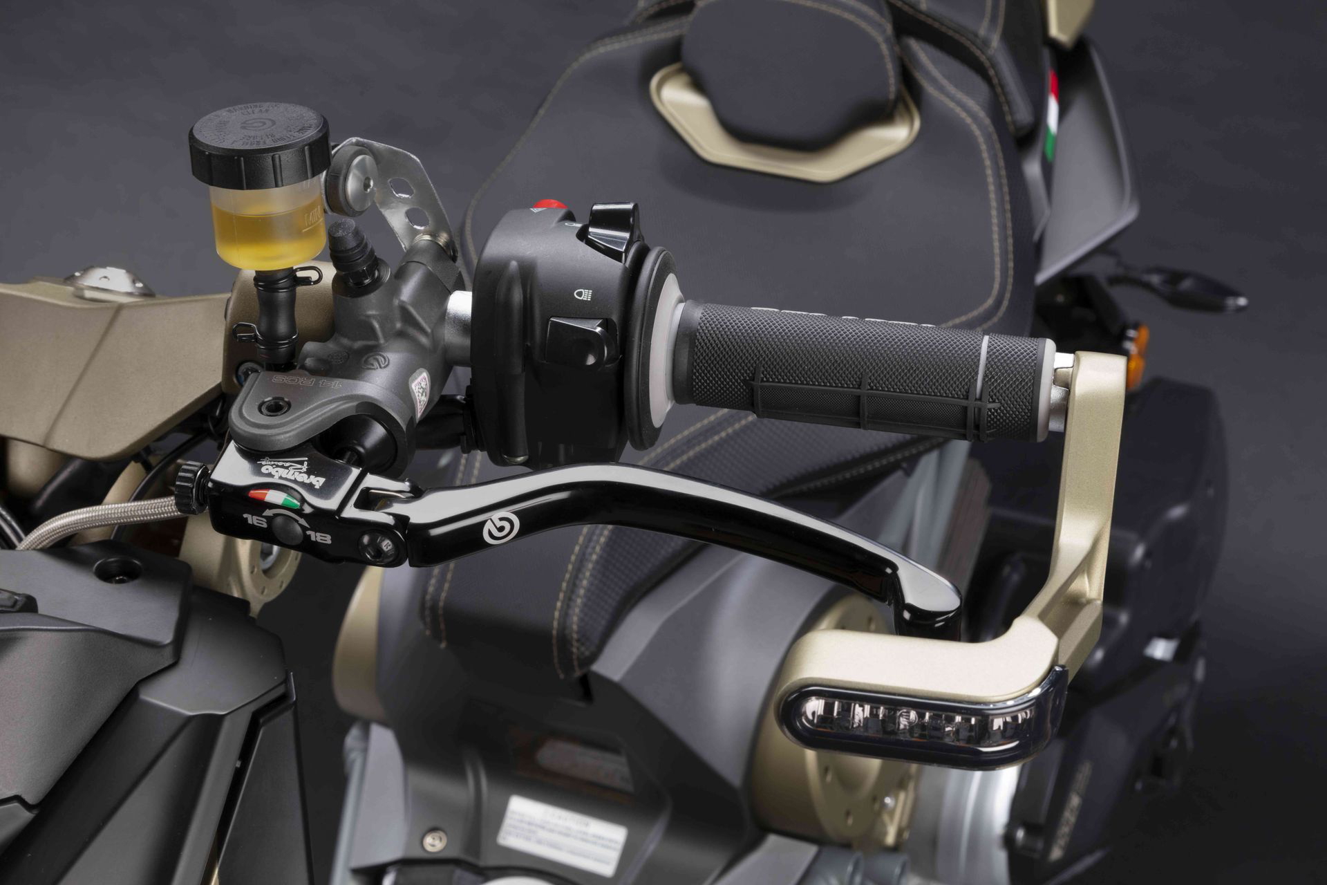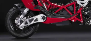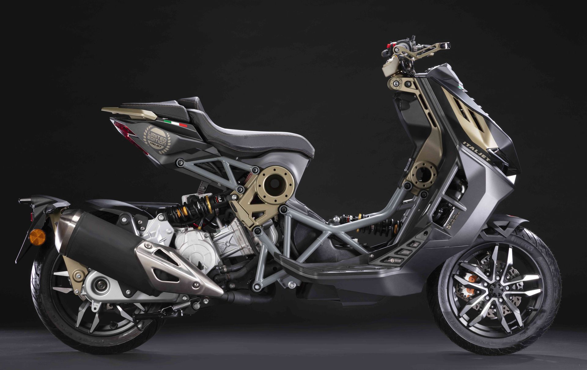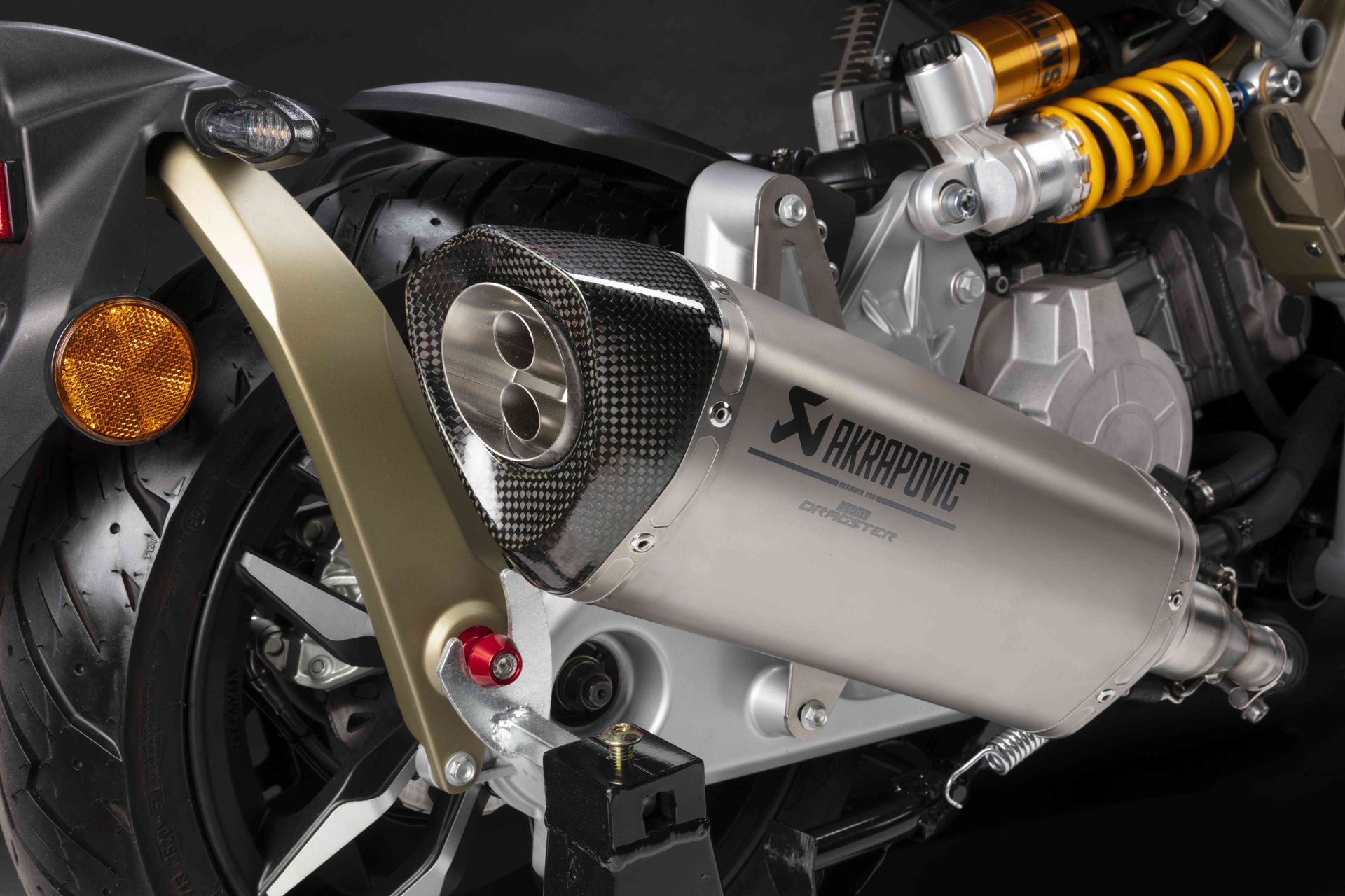 A un comportamiento extremadamente ágil y deportivo también contribuye un peso de solo 124 kilos. Es un peso muy bajo para una moto de su categoría. Lo realmente interesante de la Italjet Dragster es que es una moto enfocada abiertamente a la deportividad, y ya de fábrica, podemos mejorarla con un escape Akrapoviç diseñado a medida, suspensión Öhlins ajustable – un componente pata negra – frenos Brembo de mayor calibre o un variador Malossi más agresivo. Si queremos, incluso podemos montar slicks para su uso exclusivo en circuito.