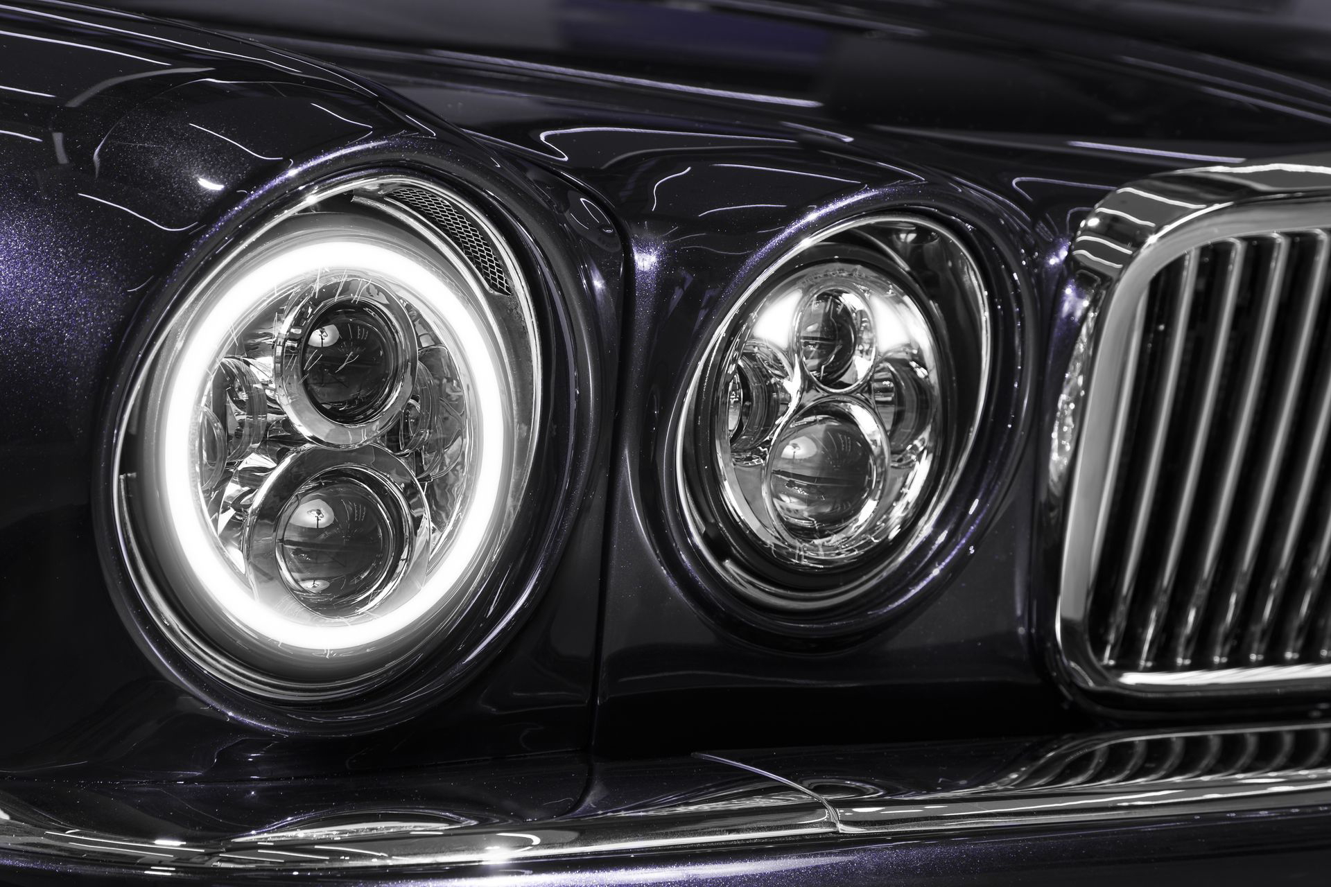 En primer lugar, su carrocería está pintada en un color llamado Mauve, un azul oscuro con tintes lila. Las llantas originales han sido reemplazadas por llantas de radios, envueltas en neumáticos deportivos de perfil bajo. En el frontal, las ópticas han sido actualizadas, y ahora disponen de LEDs de circulación diurna. Cuatro colas de escape adornan un exterior sin más cambios de lo debido. Sigue en su sitio la preciosa calandra cromada, y el emblema de la marca, extraído del primer Jaguar XJ de Nicko McBrain.