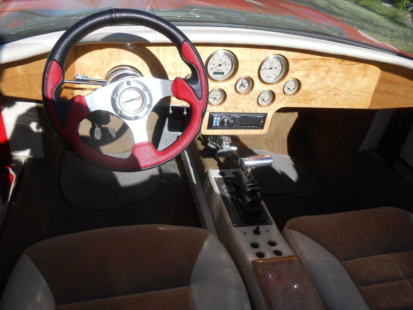 Sólo ha recorrido 600 millas desde su reconstrucción. Este motor está alojado – al aire, sin cubierta – en una bulbosa zaga, casi un metro más ancha que la parte delantera del coche. Sorprendentemente, la abominable forma del coche no son toneladas de fibra de vidrio: el vendedor se ha molestado en fabricar en metal todo el kit de carrocería del coche. En la parte inferior del perfil lateral esas tuberías son conducciones del refrigerante del motor, pero la parte verdaderamente terrible son las ópticas delanteras, procedentes de un Ford Taurus del año 2004. Lo siento, pero no pegan ni con cola.
