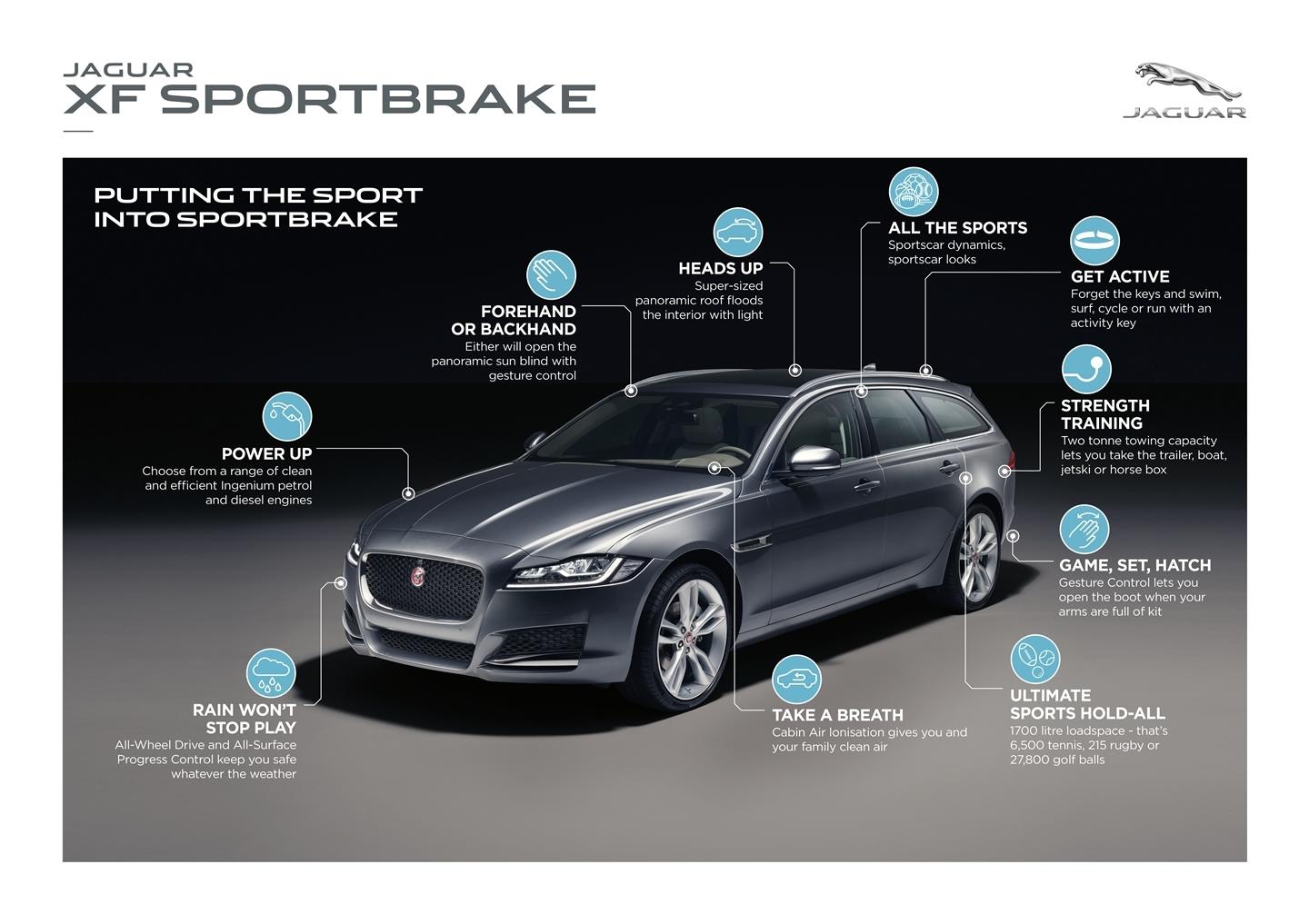 Pese a que el grueso de elementos del nuevo Jaguar XF Sportbrake ya los encontrábamos en el Jaguar XF berlina, la carrocería familiar estrena novedades como son el tren trasero autonivelante Integral-Link y el asitente para remolques con capacidad de hasta 2.000 Kg. Estos dos sistemas son instalados de serie en toda la gama XF Sportbrake. El nuevo sistema de suspensión autonivelante está basado en un diseño de suspensión neumática capaz de mantener la altura con independencia de la carga, este sistema puede combinarse con suspensiones convencionales de muelle y amortiguador para el tren delantero o con un sistema de suspensión neumática completa para las cuatro ruedas. También cabe destacar el uso de reconocimiento de gestos para la apertura del portón posterior o el control de la cortina que cubre el techo de cristal y el sistema de climatización con ionización para eliminar impurezas y malos olores.
