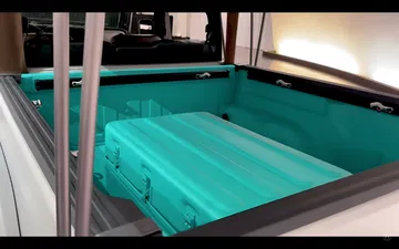 En la caja podemos ver también una especie de compartimento con aspecto de maleta táctica que queda anclado al piso en ese color aguamarina. Es una pintura resistente a las inclemencias del tiempo, como sería categórico de todo vehículo militar y, puestos en eso, la fuente de las letras de Jeep en la puerta de la caja, también se ha cambiado por una que se inspira en los militares.