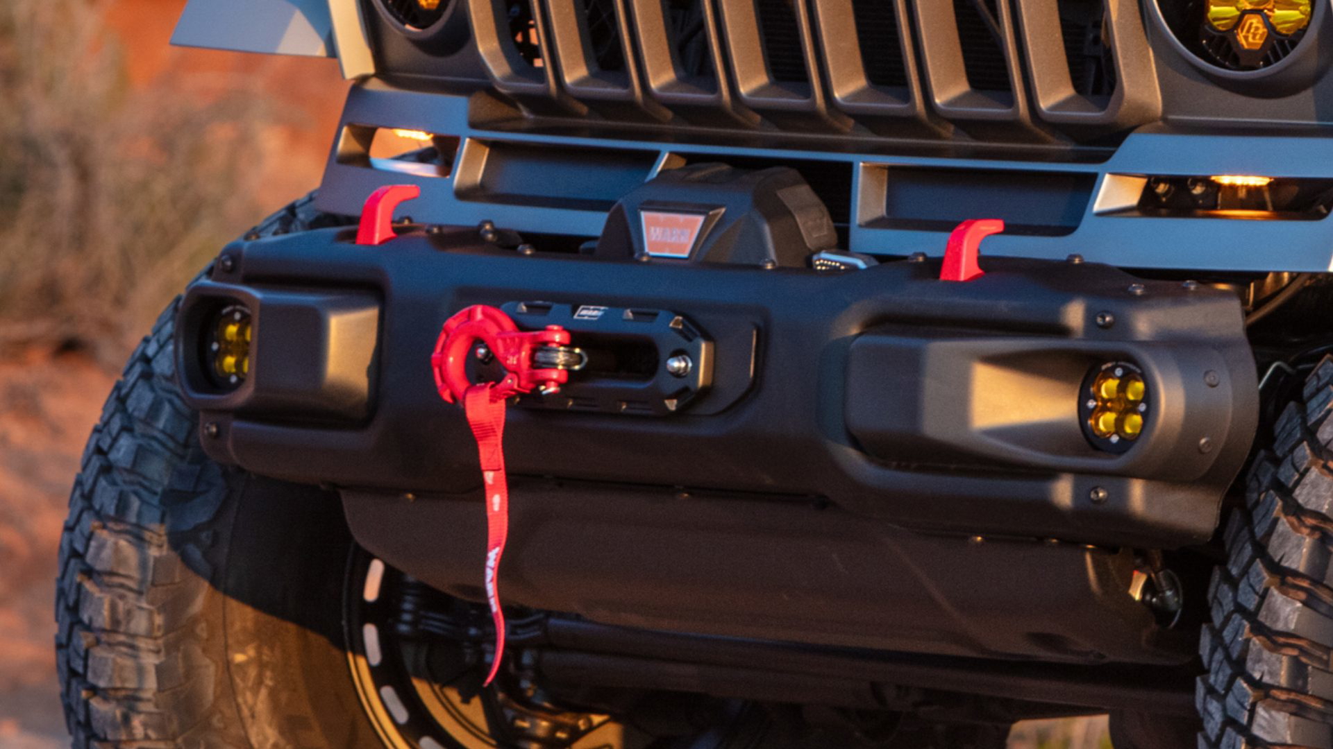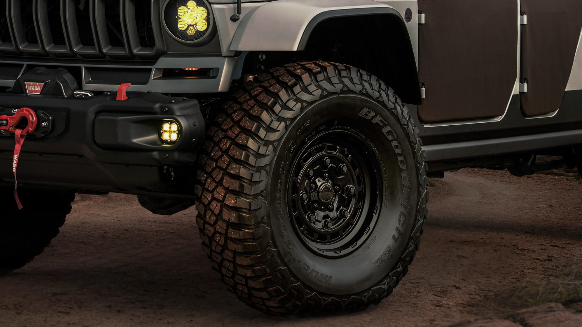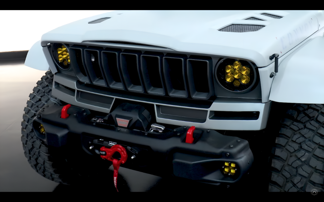 Hay tanto, que los detalles en sí mismos quedan camuflados. Las luces amarillas de alta intensidad se adhieren a la mencionada inspiración militar, igual que sus llantas negras de acero Warn en 17″. En ellas calza unas imponentes gomas de tacos cuadrados BFG Krawler de 40″.