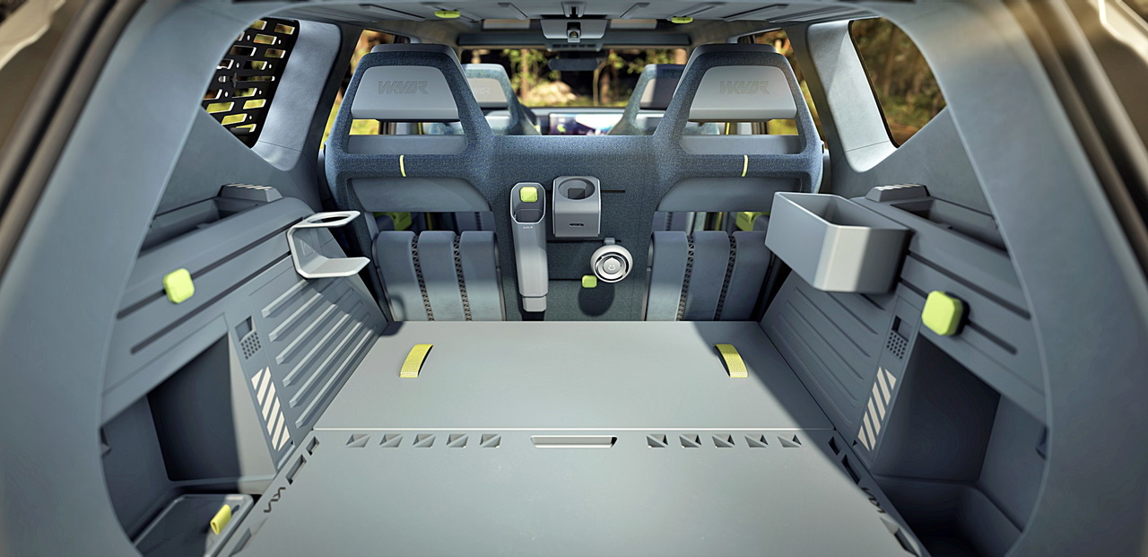 El WKNDR tiene gancho retráctil para remolque, un portaequipajes en el techo pensado para llevar planchas de tracción (esas piezas que se colocan debajo de las ruedas cuando el coche está atascado), un kit de acampada y un pegboard lateral para colgar herramientas al más puro estilo overlanding.